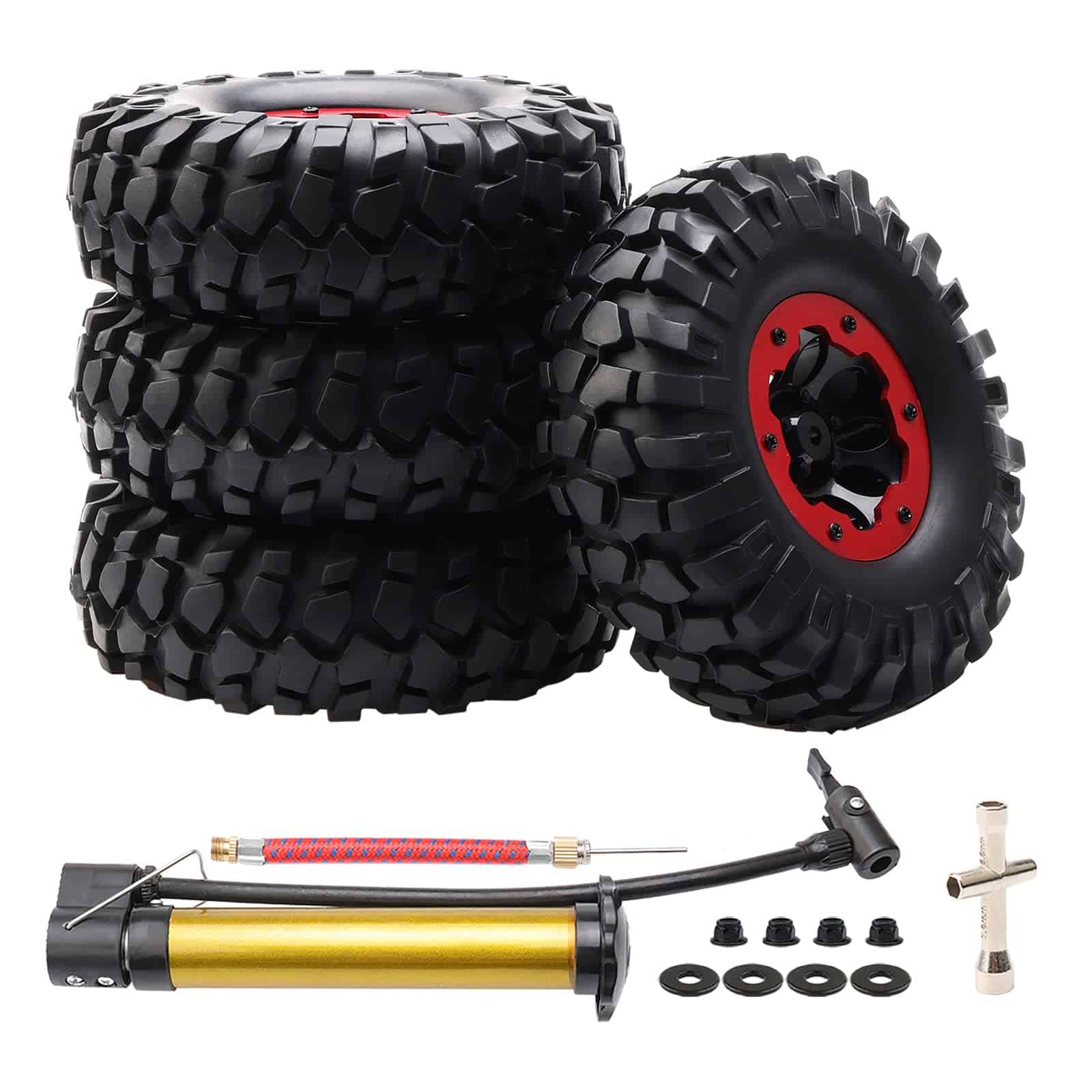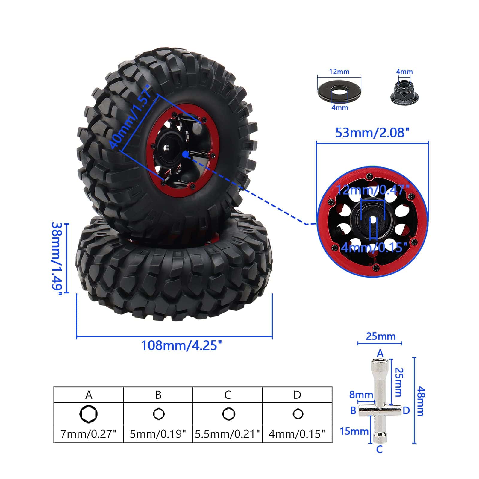 Características: Los neumáticos para Crawler 1.9 están hechos de caucho suave con inserciones de espuma, estilo de bloques de cuentas simuladas en llanta de plástico, alta resistencia al desgaste, excelente calidad y rendimiento. Los neumáticos inflables son fáciles de instalar y reemplazar. Aplicaciones: Estas ruedas y neumáticos de plástico 1.9 con bloqueo de cuentas se utilizan para Rock Crawlers RC a escala 1/10 o camiones de corto recorrido. Nota: Estas ruedas y neumáticos RC están ya ensamblados, no es necesario instalar o inflar. Por favor, no infle los neumáticos con demasiada frecuencia, si realmente es necesario, 1 o 2 bombeos son suficientes. Si el aire está demasiado lleno, provocará que los neumáticos pierdan aire y ya no lo retengan. Contenido del paquete: 4 llantas y neumáticos, 4 tuercas de bloqueo M4, 4 arandelas M4, 1 llave de vaso de cruz de 4 vías.