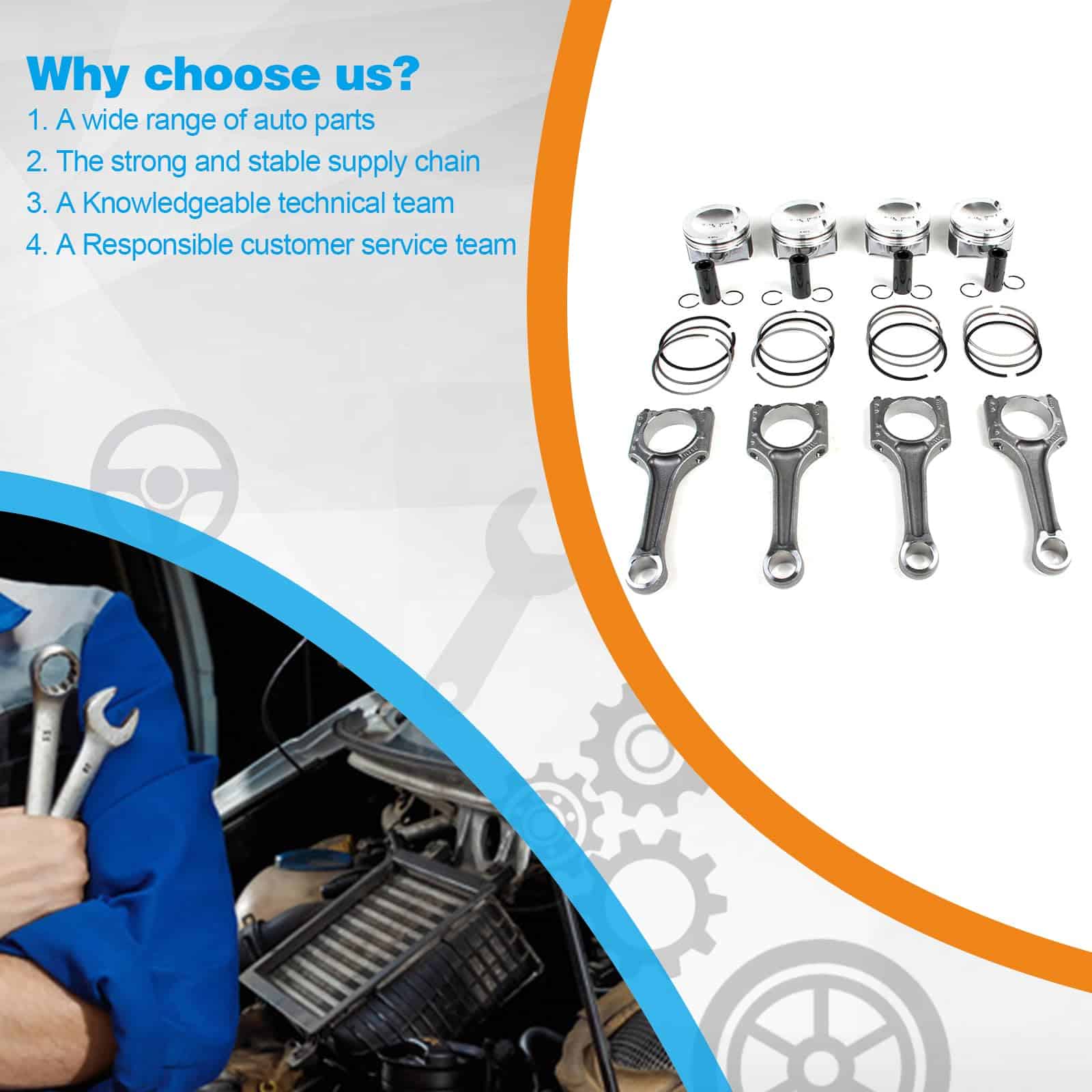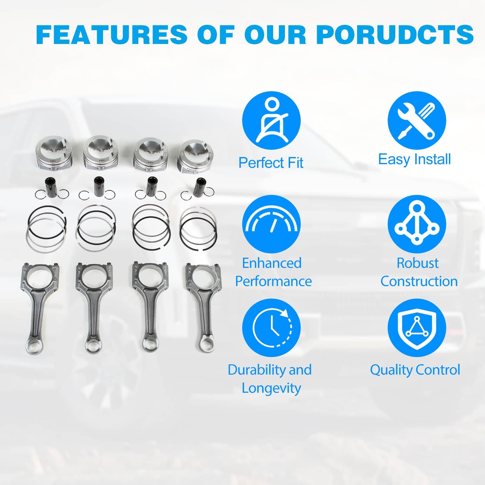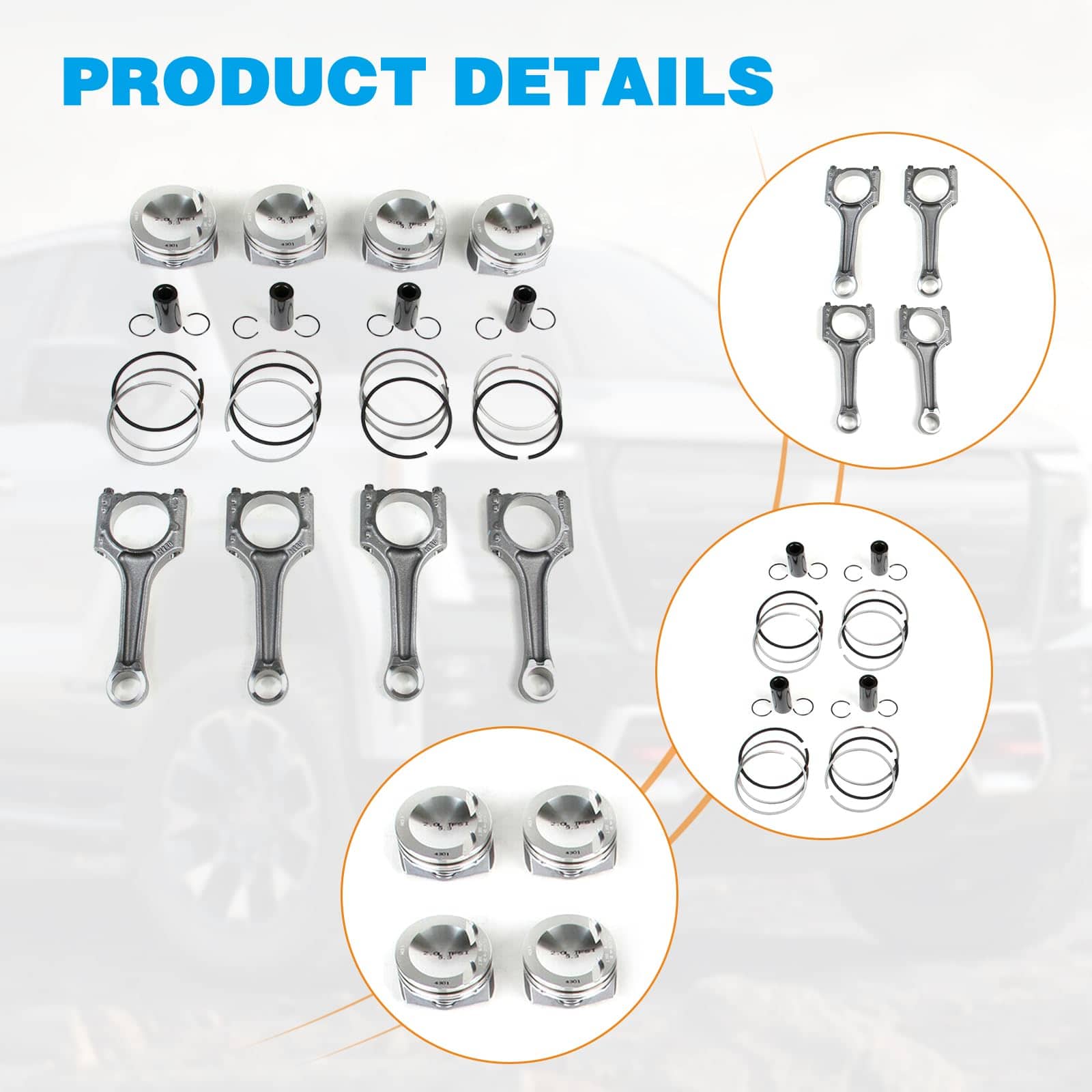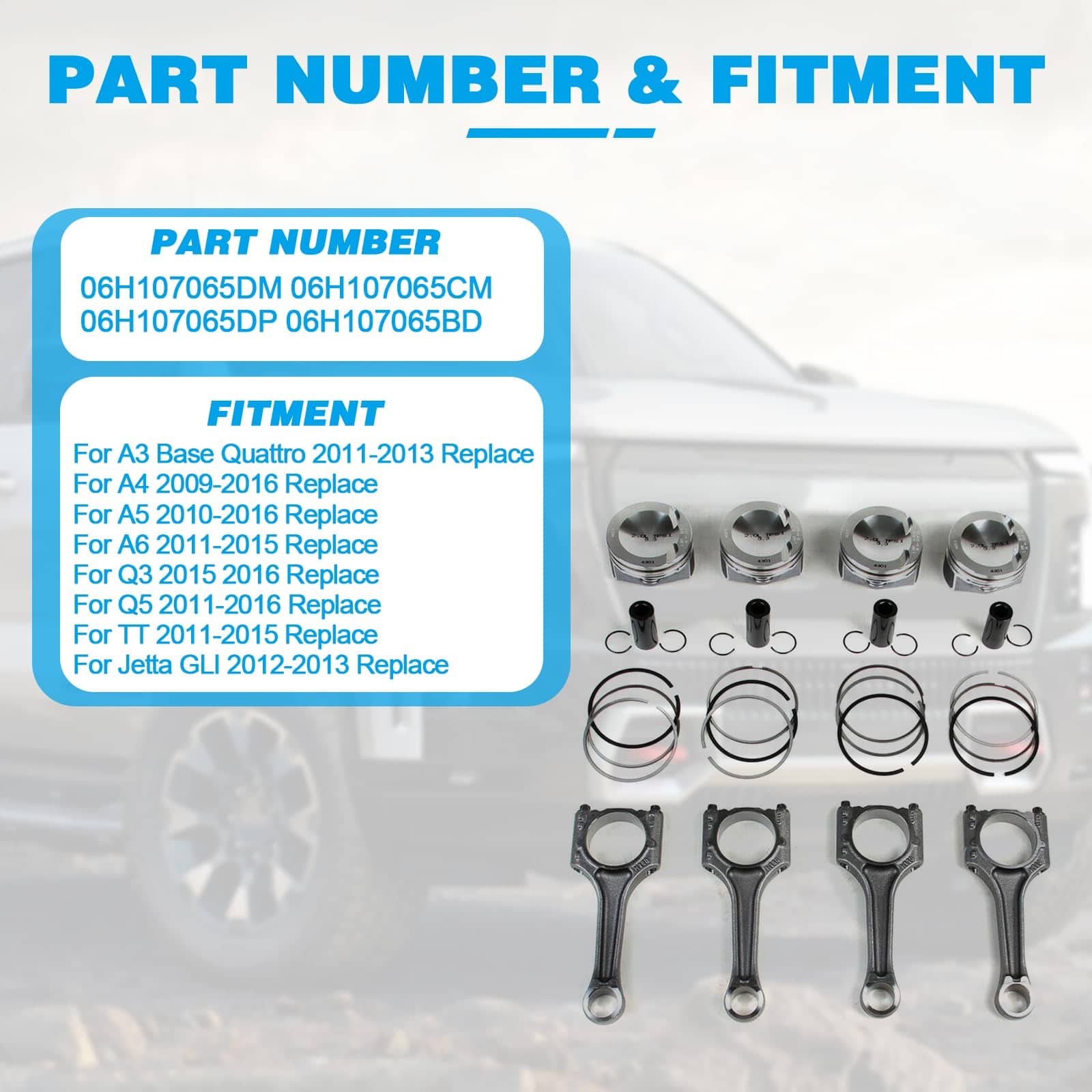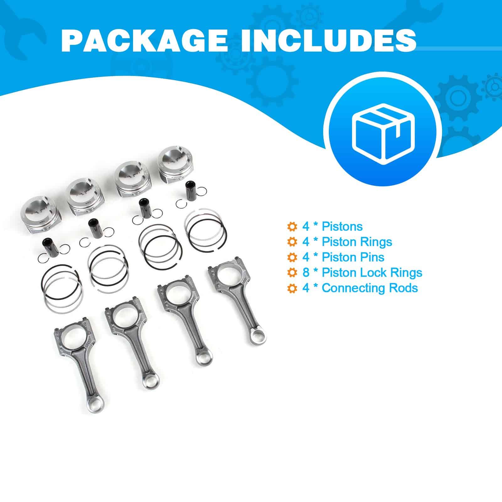 El juego de 4 pistones y bielas FIWARY 23mm es ideal para vehículos como A3 A4 A5 A7 A8 Q5 TT 2011-2017, Golf Jetta Passat Tiguan 2.0T 2012-2017. Está diseñado para resistir las altas fuerzas de compresión y combustión dentro del motor, fabricado con materiales como acero forjado o aleación de aluminio para garantizar fuerza, durabilidad y resistencia a la fatiga. El producto ha pasado por rigurosas pruebas para garantizar su calidad y rendimiento, incluyendo pruebas de precisión dimensional, integridad de material y capacidad de carga. Ofrecemos 3 meses de garantía y un servicio al cliente de calidad.
