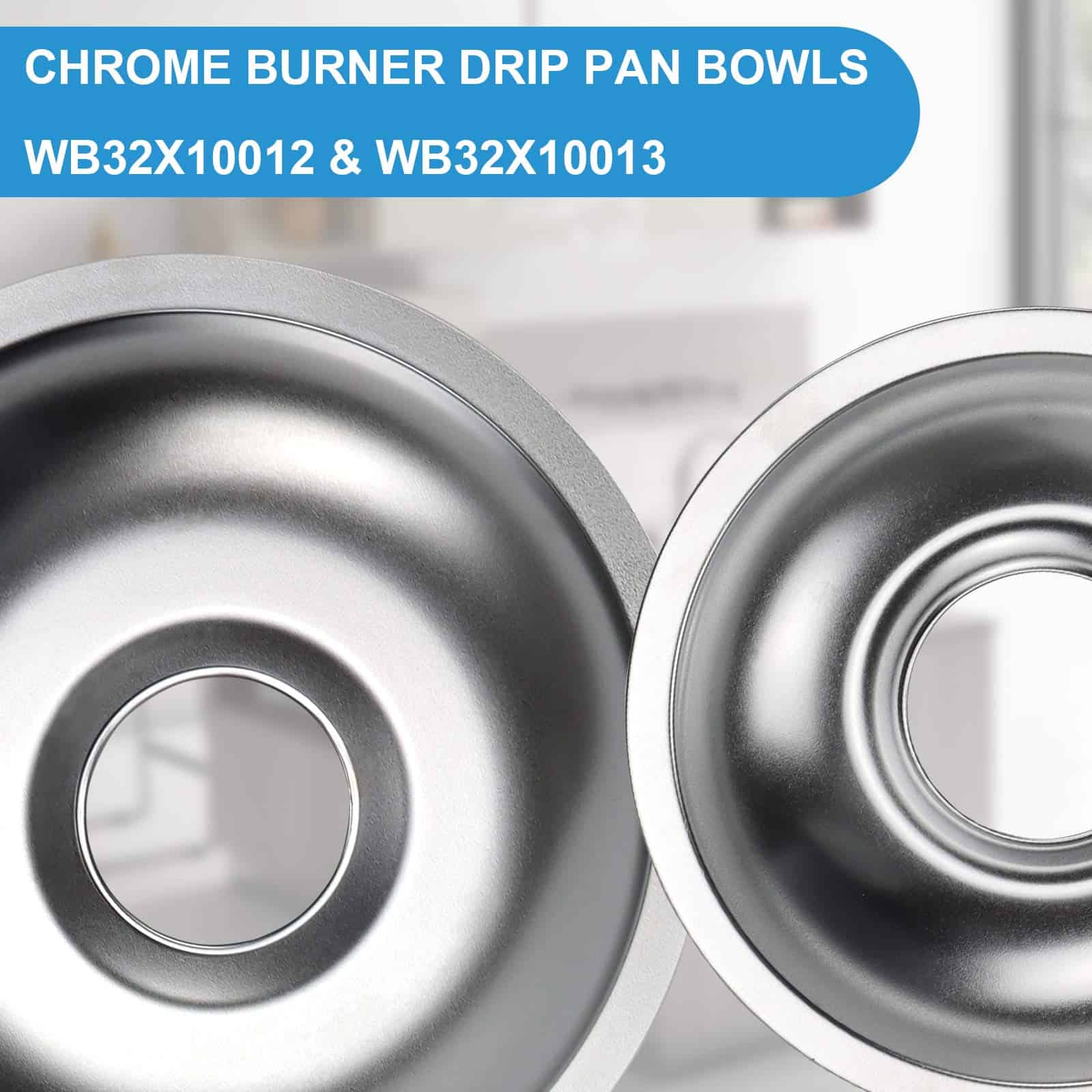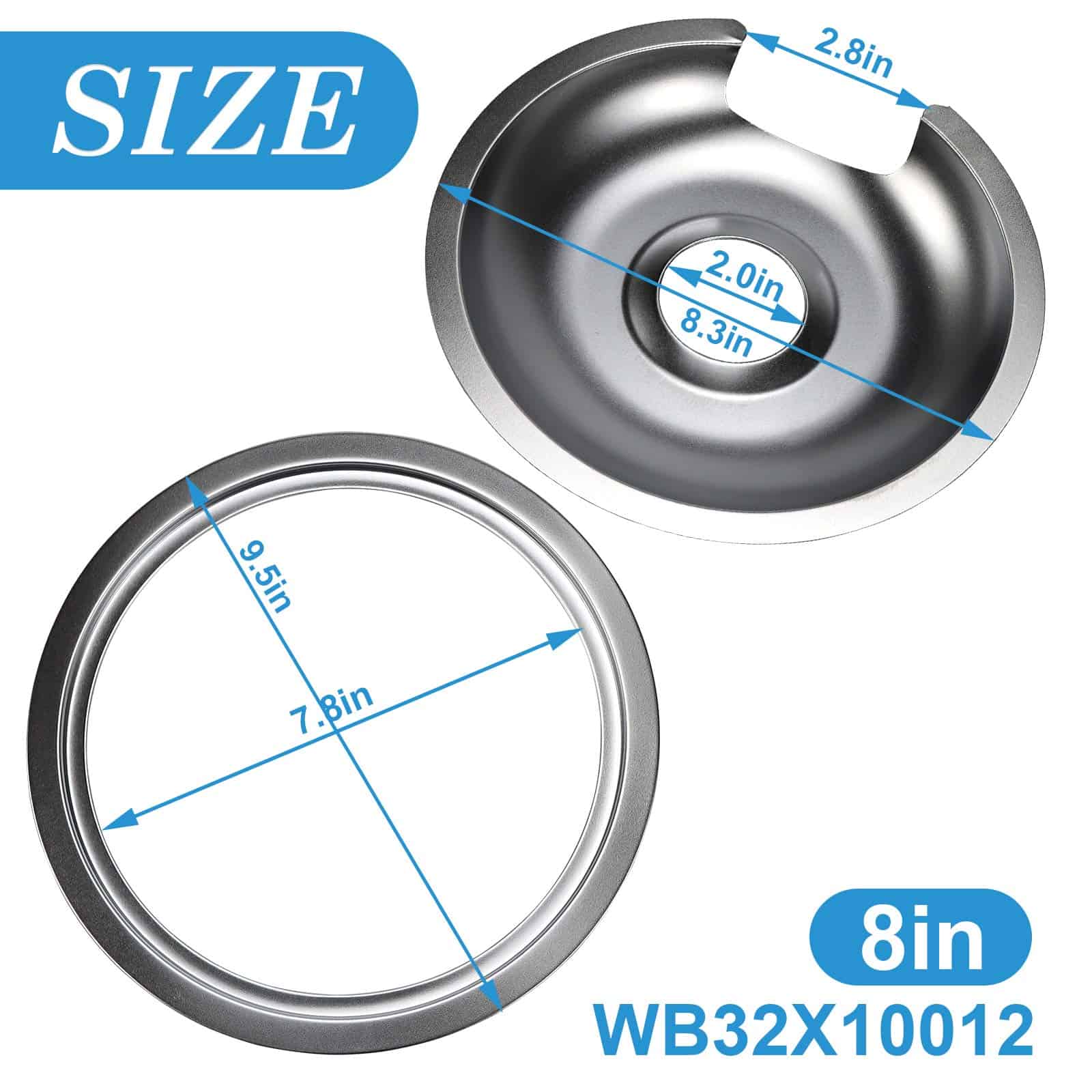 Este juego de platos de goteo cromados de APPLIANCEMATES incluye 1 plato grande de 8» WB32X10013 y 3 platos pequeños de 6» WB32X10012. Reemplaza los números de parte WB32X10013 y WB32X10012. Si los modelos mencionados anteriormente no incluyen el que necesita, o no está seguro acerca de la compatibilidad, consulte con nosotros y proporcione su número de modelo antes de ordenar. Gracias por elegir esta pieza para sus necesidades. Cualquier pregunta, contáctenos y responderemos en 24 horas.