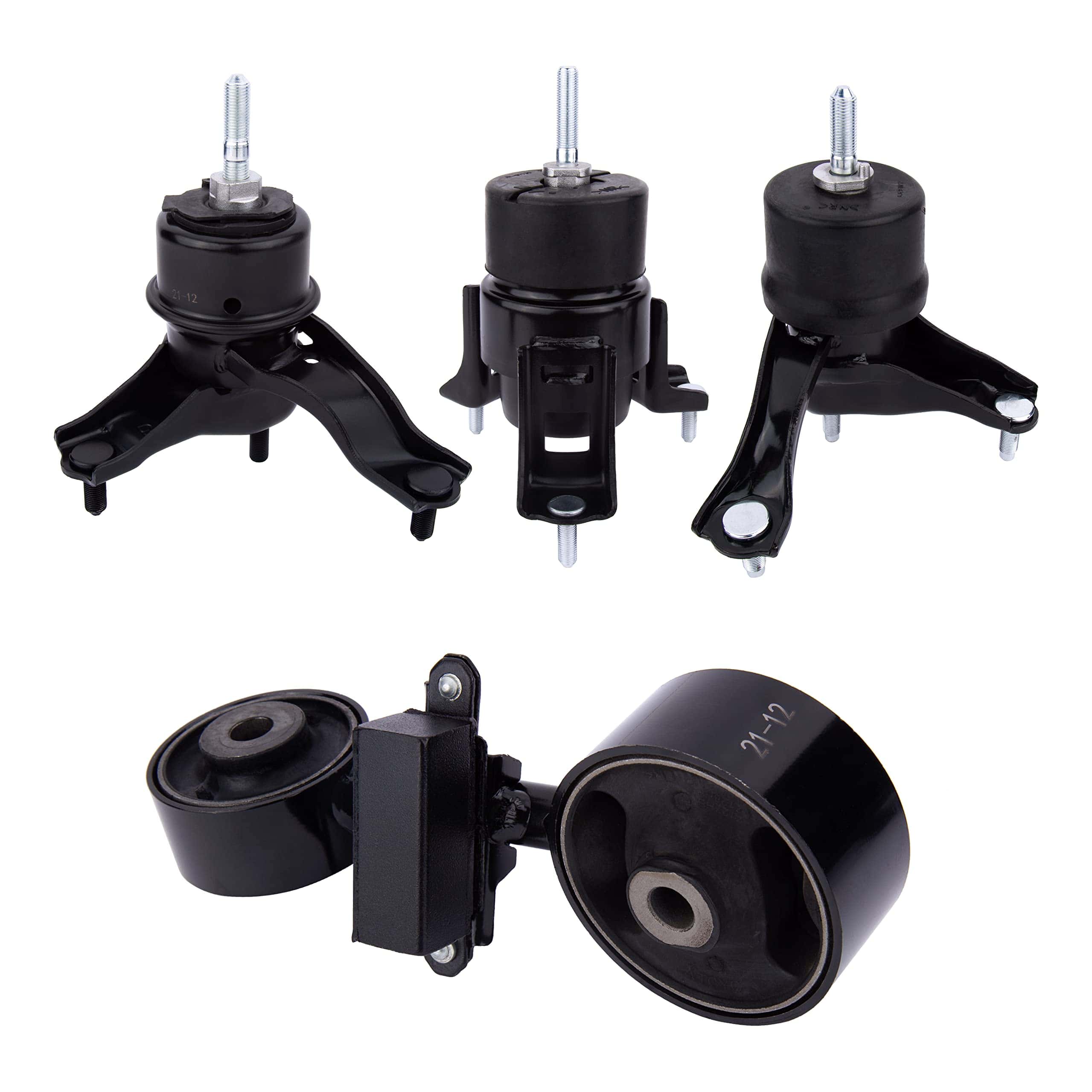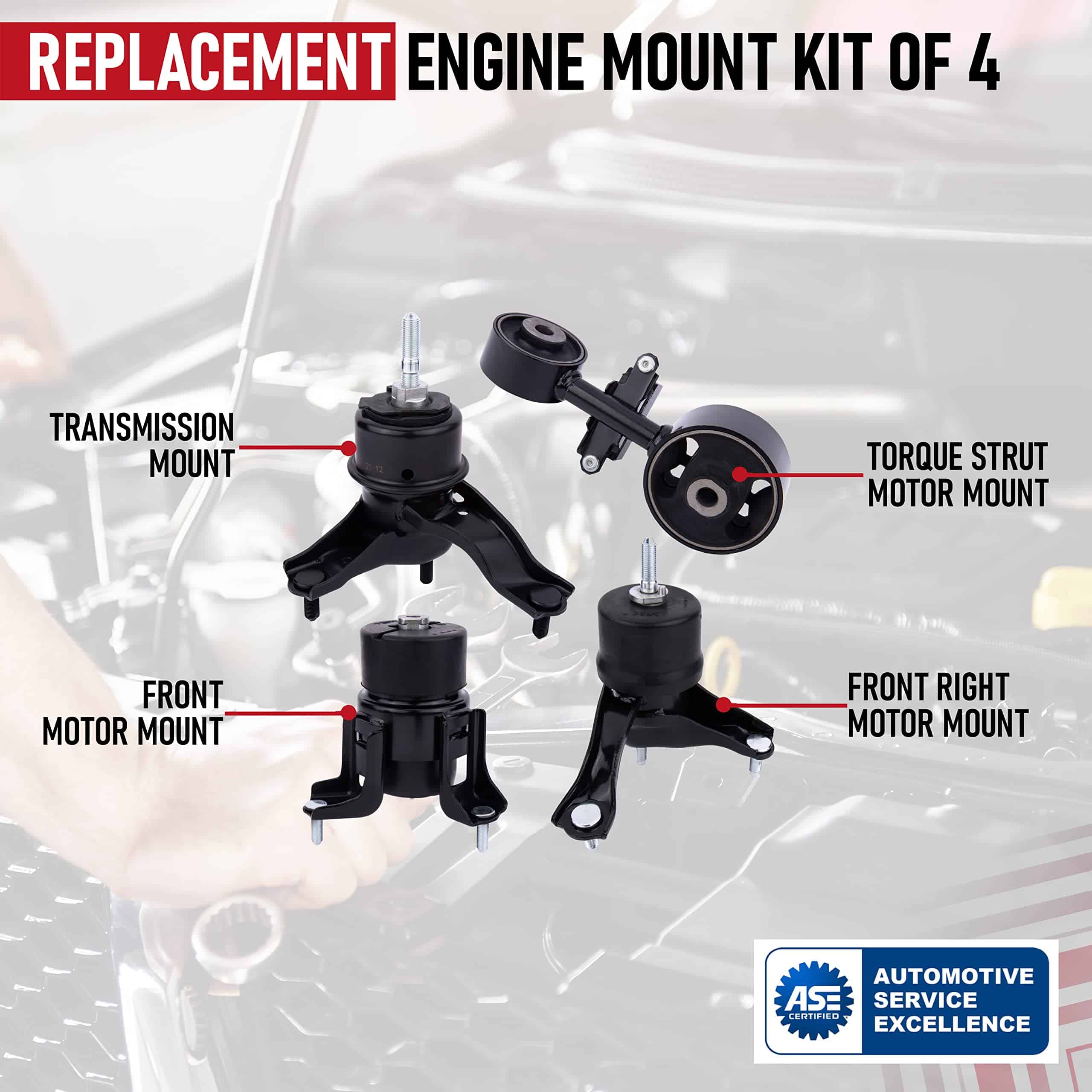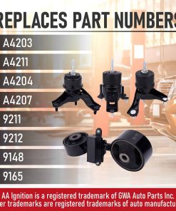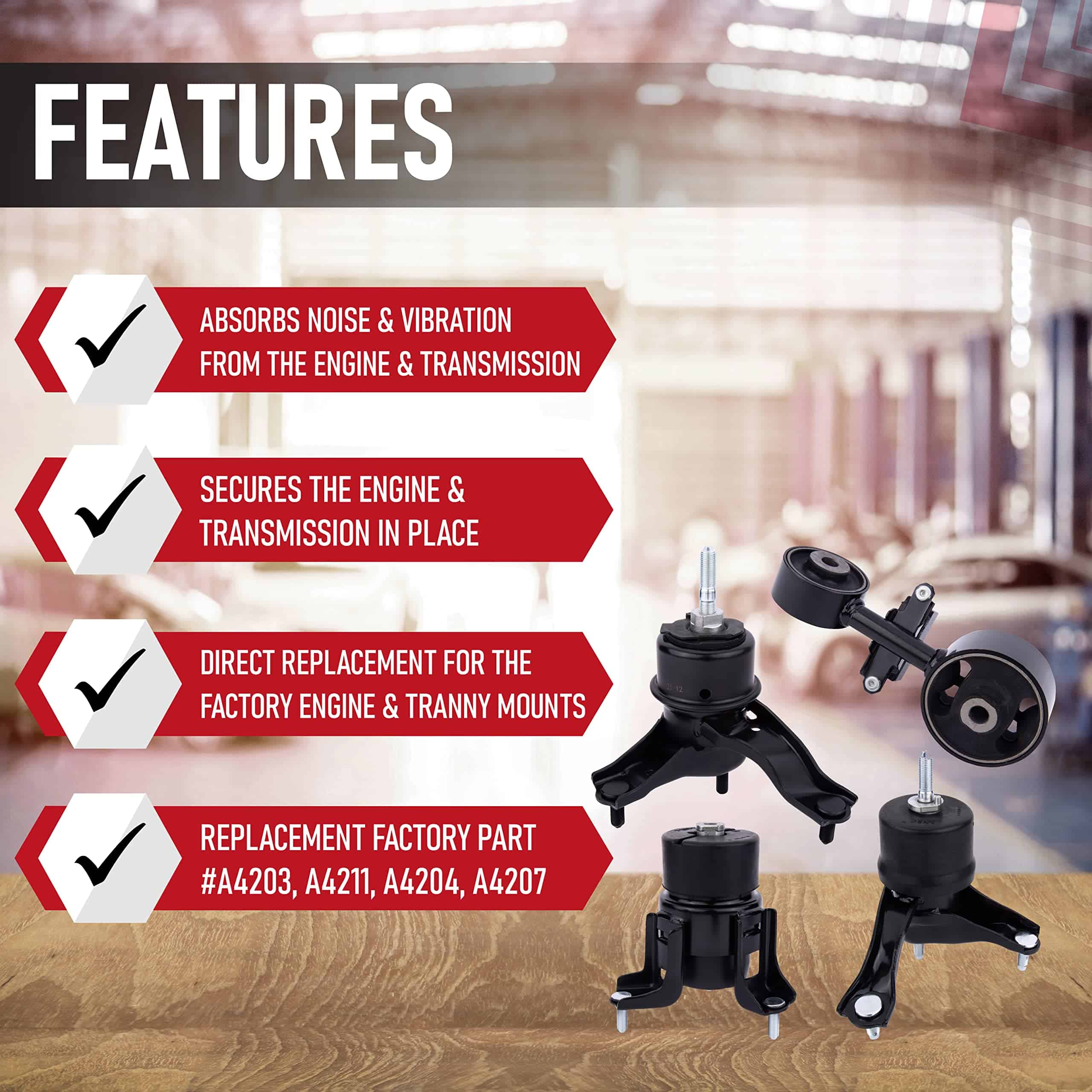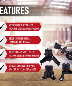 Los soportes de motor absorben ruido y vibraciones del motor mientras lo aseguran en su lugar. Estos soportes no duran para siempre y necesitarán ser reemplazados después de un tiempo. Este kit de soportes de motor también tiene anticongelante para evitar grietas en condiciones de frío extremo. Si escuchas golpes y sientes que el motor rebota durante frenadas o aceleraciones repentinas, esto podría ser la causa. Estos soportes se adaptan a todos los lados del motor y la transmisión y se pueden encontrar fácilmente debajo del cuerpo delantero del motor. Es recomendable reemplazar todos los soportes a la vez para mantener el equilibrio en la distribución del peso del motor. Compatible con los siguientes vehículos: Camry 2.4L 2002-2006. Reemplaza los números de parte: A4203, A4211, A4204, A4207, 9211, 9212, 9148, 9165 M9211, EM9212, EM9148, EM9165. Este juego de soportes de motor no es una pieza OEM genuina. Las marcas de vehículos y sus modelos asociados y números de parte se utilizan en esta lista solo para identificar los vehículos que se adaptan a este kit de soportes de motor y transmisión.