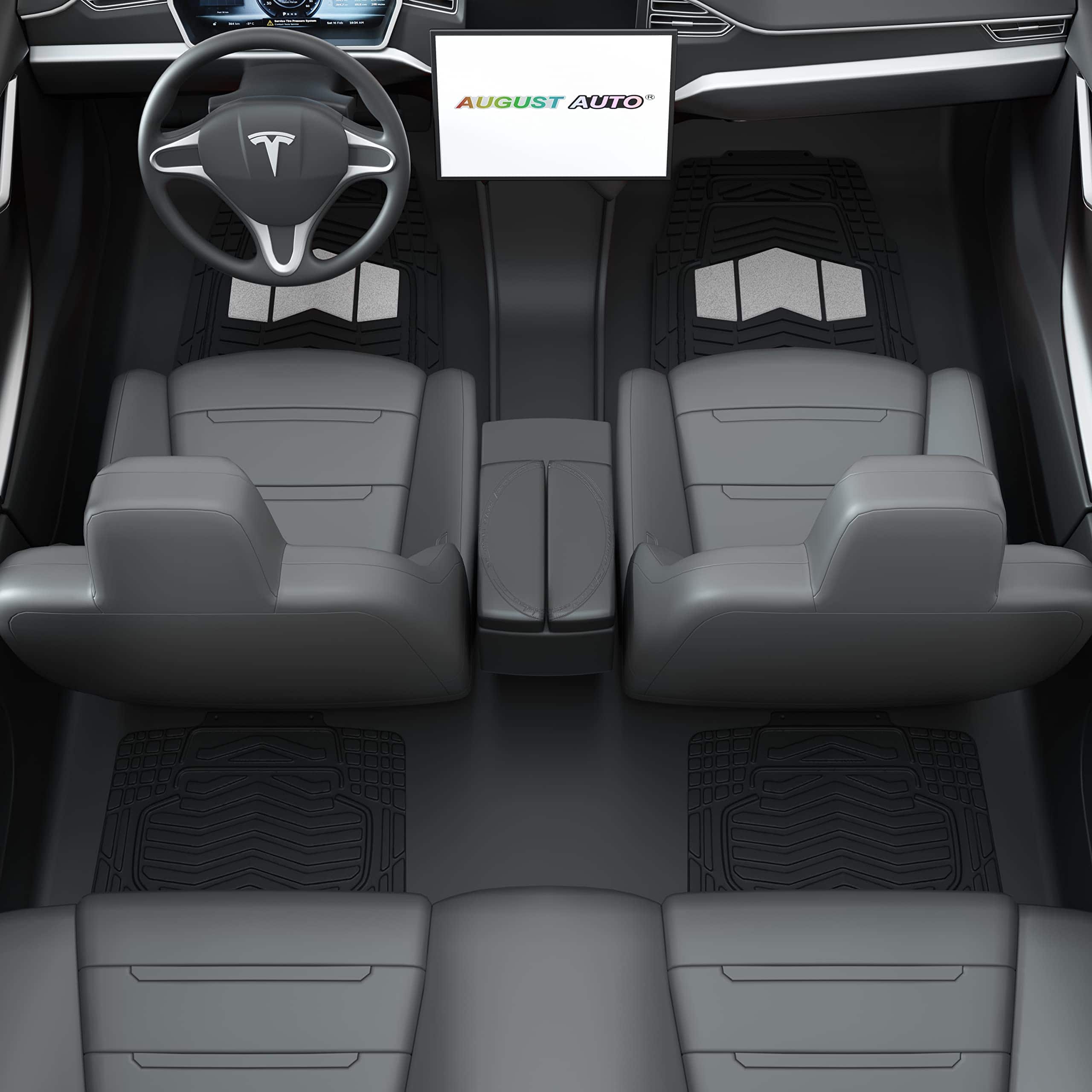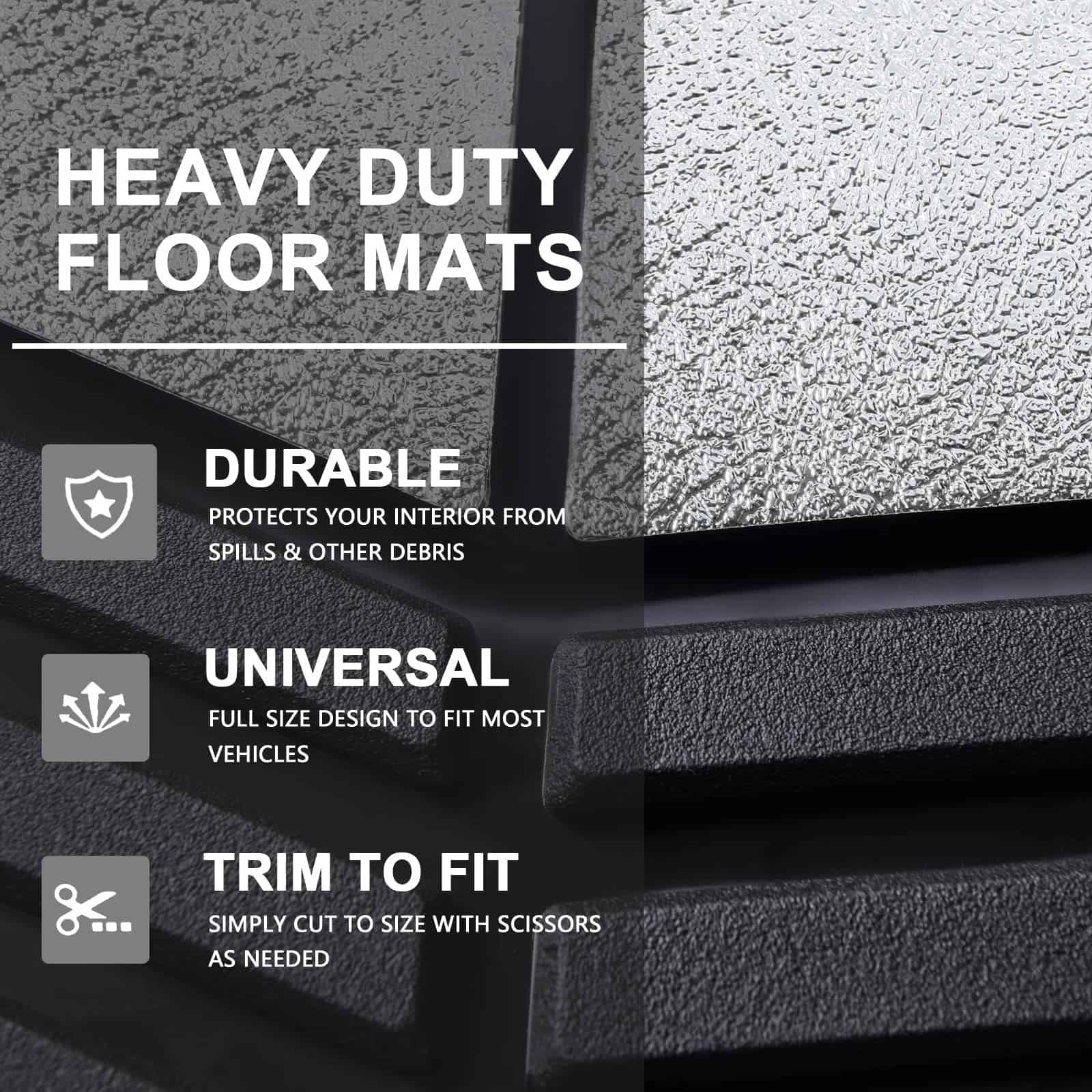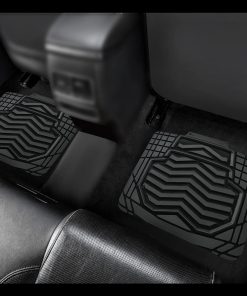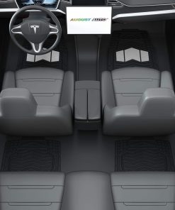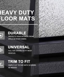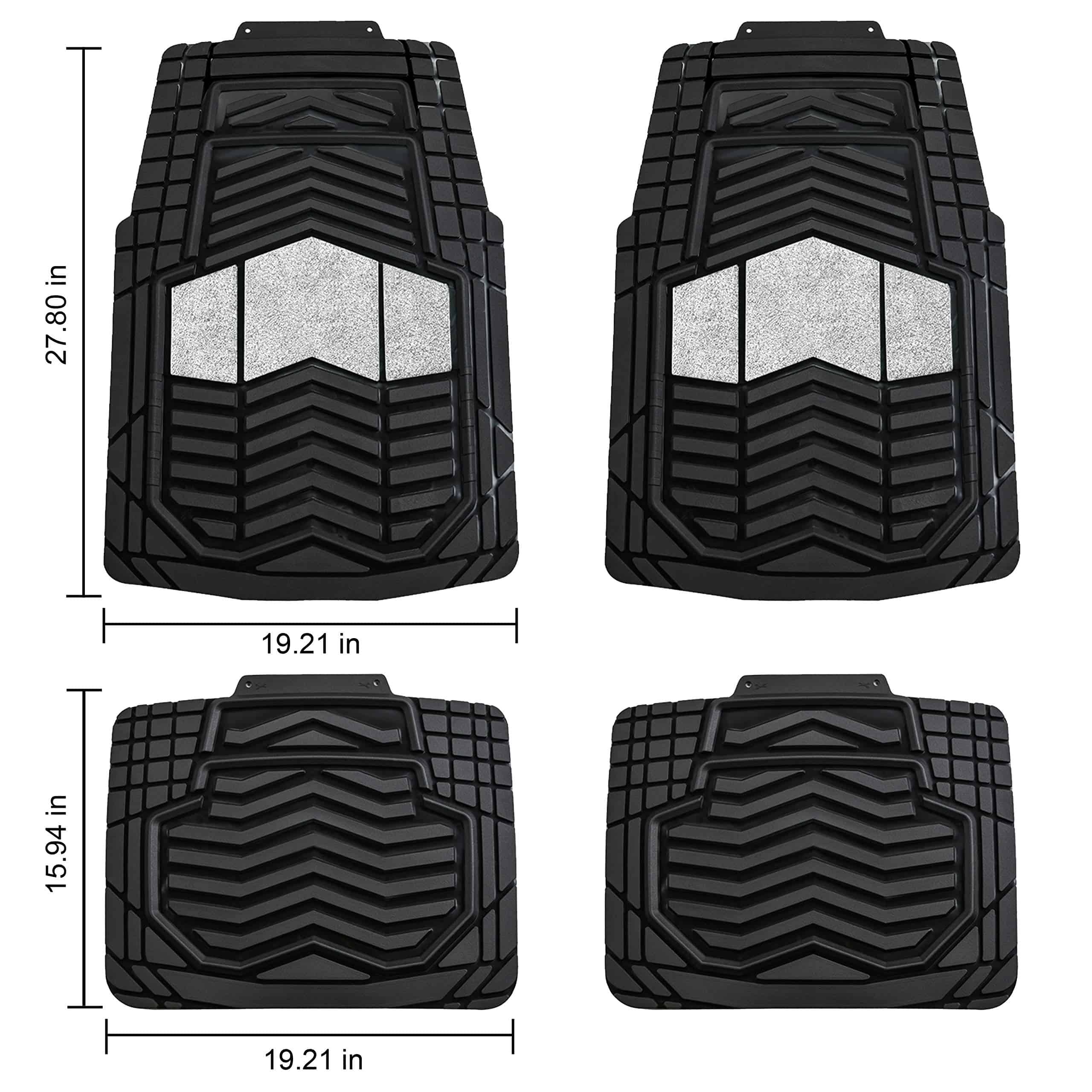 Juego de 4 tapetes para piso de coche de goma resistente todo clima en dos tonos negro y plateado, Universal para autos, sedanes, SUVs, camionetas y vans. Los tapetes están fabricados con material de goma duradera de alta calidad que cumple con los estándares más exigentes. Incluso en temperaturas altas con las puertas cerradas, no se produce olor, lo que garantiza la seguridad de todos los pasajeros al entrar al vehículo. Diseñados para resistir la nieve, el barro, la lluvia, la suciedad, los derrames y cualquier elemento adverso que pueda dañar el piso original de su vehículo. Los tapetes son recortables a medida, lo que les permite adaptarse a su vehículo con solo un par de tijeras. La base antideslizante mantiene los tapetes en su lugar para una conducción segura, con protuberancias de goma en la parte inferior para evitar que se muevan. Las medidas de los tapetes son: Delanteros 27.80″ x 19.21″ y Traseros 15.94″ x 19.2″, fáciles de recortar para ajustarse a cualquier vehículo.
