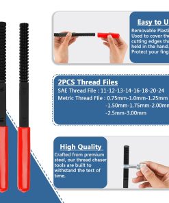 Juego de 48 Piezas de Roscado Métrico y SAE con 22 Machos 24 Terrajas 2 Limas de Rosca Juego de Reparación de Roscas Herramienta Maestra de Restauración de Roscas. Fabricadas con acero premium, nuestras herramientas de restauración de roscas están construidas para resistir el paso del tiempo. Reforzadas con un recubrimiento de óxido negro o zinc, resisten la corrosión, asegurando un rendimiento y confiabilidad duraderos. Diseñadas con una estructura hexagonal, nuestros machos y terrajas colaboran sin problemas con una llave de vaso, acelerando tus proyectos sin esfuerzo. Alojado en un estuche de almacenamiento, nuestro set maestro de roscado mantiene todo organizado. Las terrajas y machos codificados por color hacen que la identificación sea sencilla, con el color plata para el tamaño UNC, negro para el tamaño UNF y dorado para el tamaño métrico. Cada especificación está claramente marcada, facilitando un acceso rápido y fácil durante el uso.