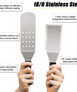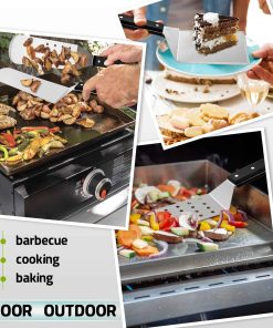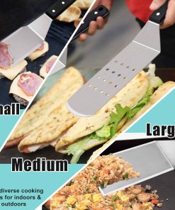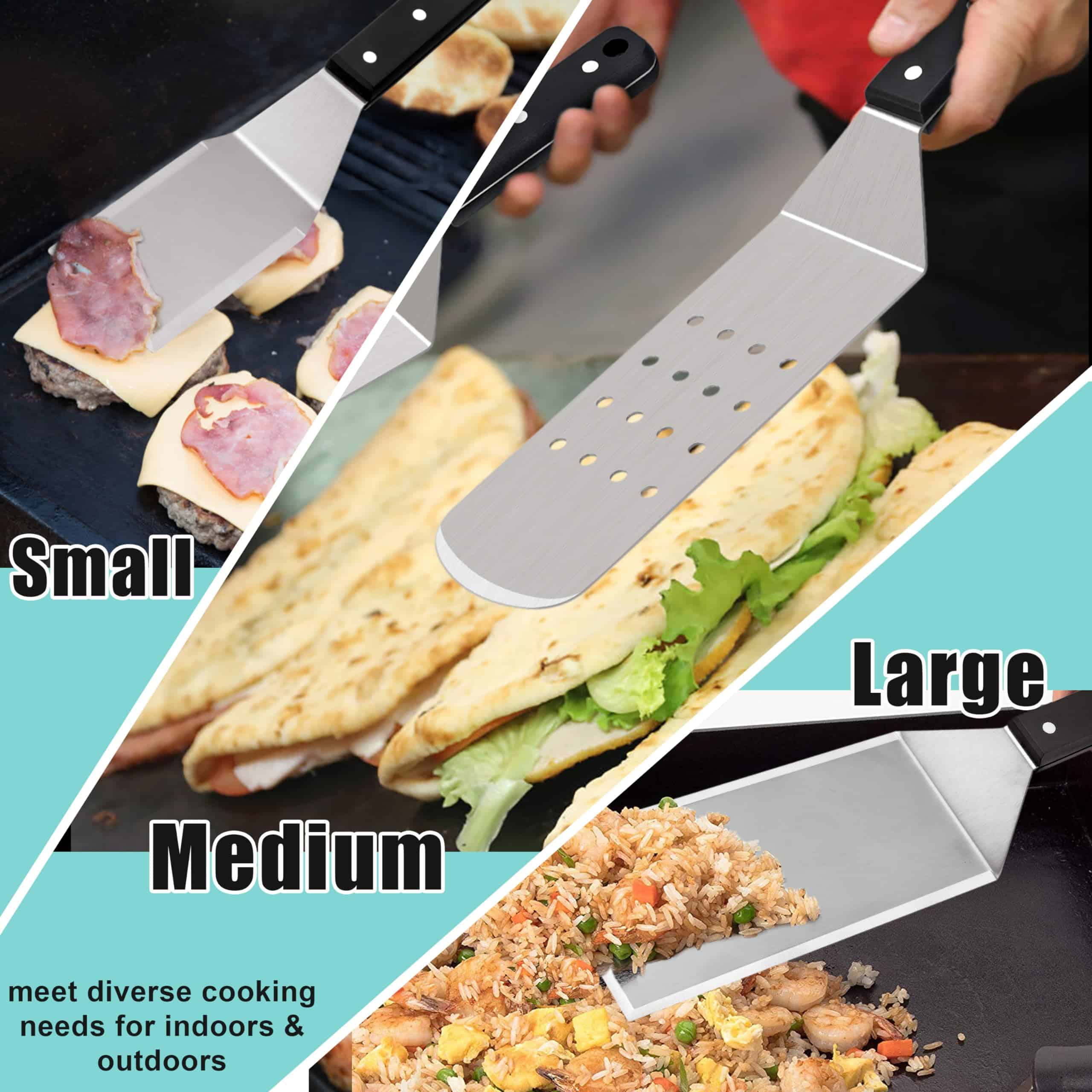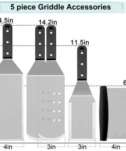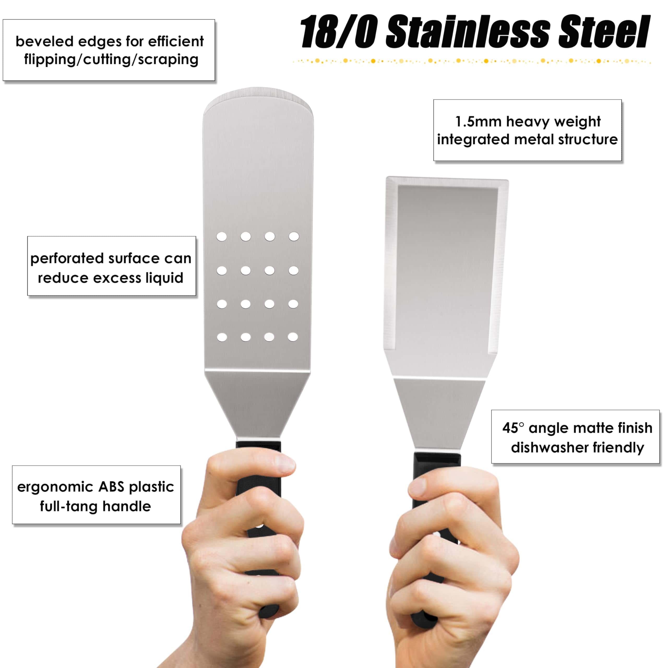 HaSteeL Juego de 5 espátulas de metal, espátula de acero inoxidable para parrilla y raspador de plancha, accesorios de plancha multiusos para cocinar a la parrilla, mango remachado y apto para lavavajillas. Fabricado en acero inoxidable más grueso de 1.5 mm para garantizar solidez y durabilidad. Suficientemente resistente para resistir la flexión o rotura. Construido para durar años con el mantenimiento adecuado. Apto para lavavajillas y lavado a mano es muy fácil. Las espátulas largas facilitan el volteo y levantamiento. El borde de la espátula corta es lo suficientemente afilado para cortar alimentos blandos. La espátula grande de metal tiene suficiente espacio para contener más cosas. El raspador de plancha es ideal para picar, cortar y raspar. El diseño de tres remaches ensambla el plástico y el metal de forma segura. No te preocupes más por que las uñas se desprendan y se muevan. Los mangos resistentes al calor están construidos con plástico ABS de alta calidad para garantizar que no te quemes las manos. Viene con 1 x espátula grande para hamburguesas, 1 x espátula corta para parrilla, 1 x Flipper sólido para panqueques, 1 x espátula perforada, 1 x raspador de plancha, 4 ganchos colgantes para almacenar ordenadamente sin desorden. Mantiene tus espátulas de plancha bien organizadas. El kit de herramientas de plancha es esencial para chefs de restaurantes, amantes de la barbacoa o cualquier persona que disfrute de asar a la parrilla en interiores o al aire libre en campamentos. Ideal para planchas de hierro fundido, teppanyaki, planchas planas, hibachi, planchas de pellets y más. Excelente regalo para papá y esposo