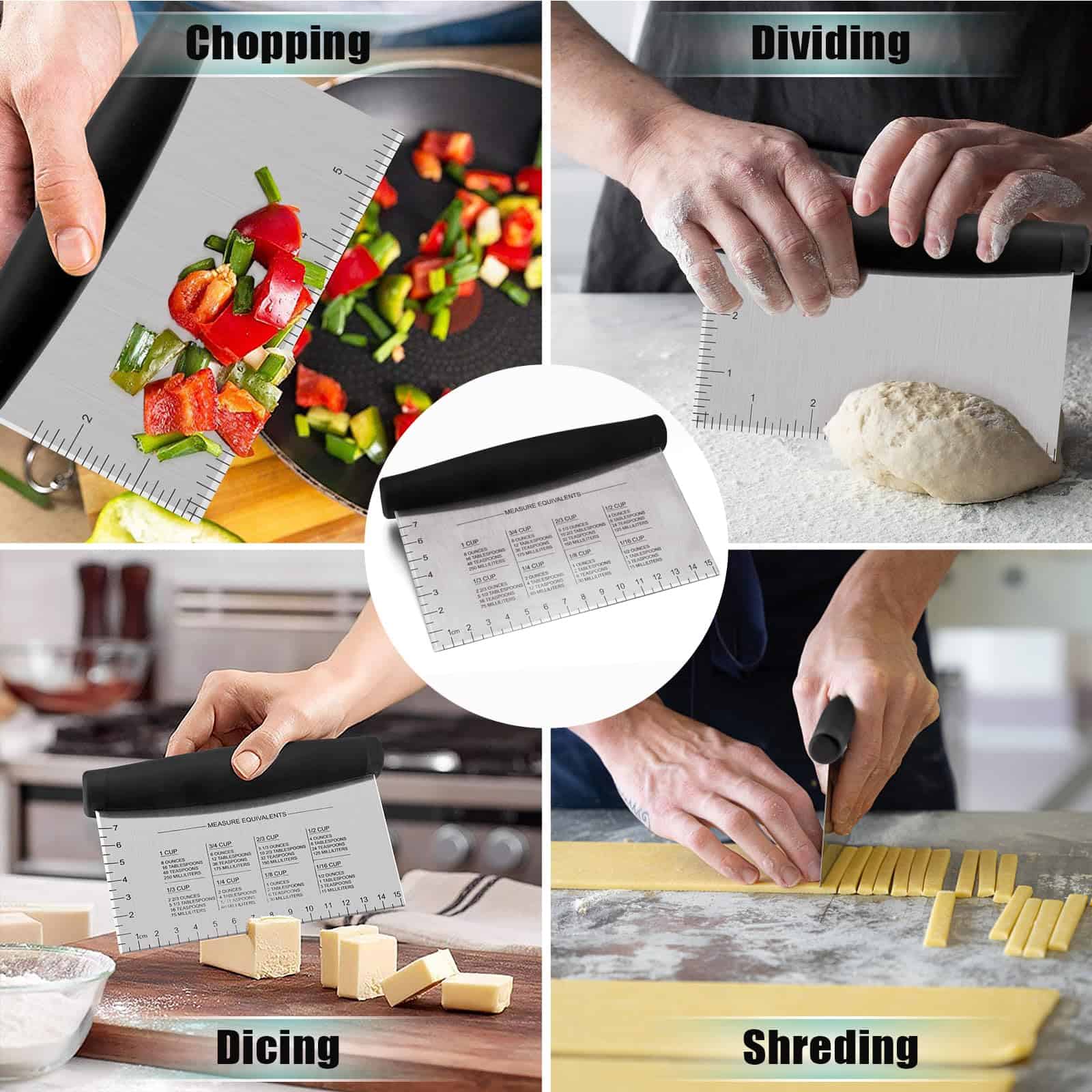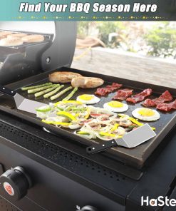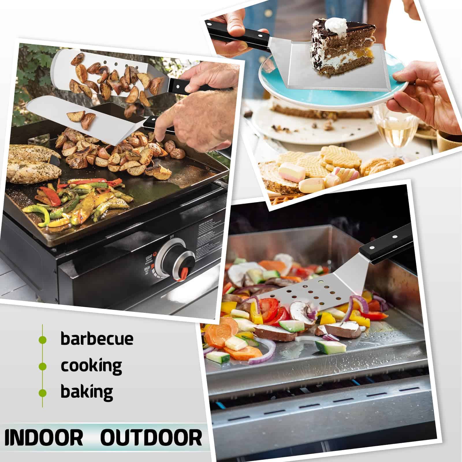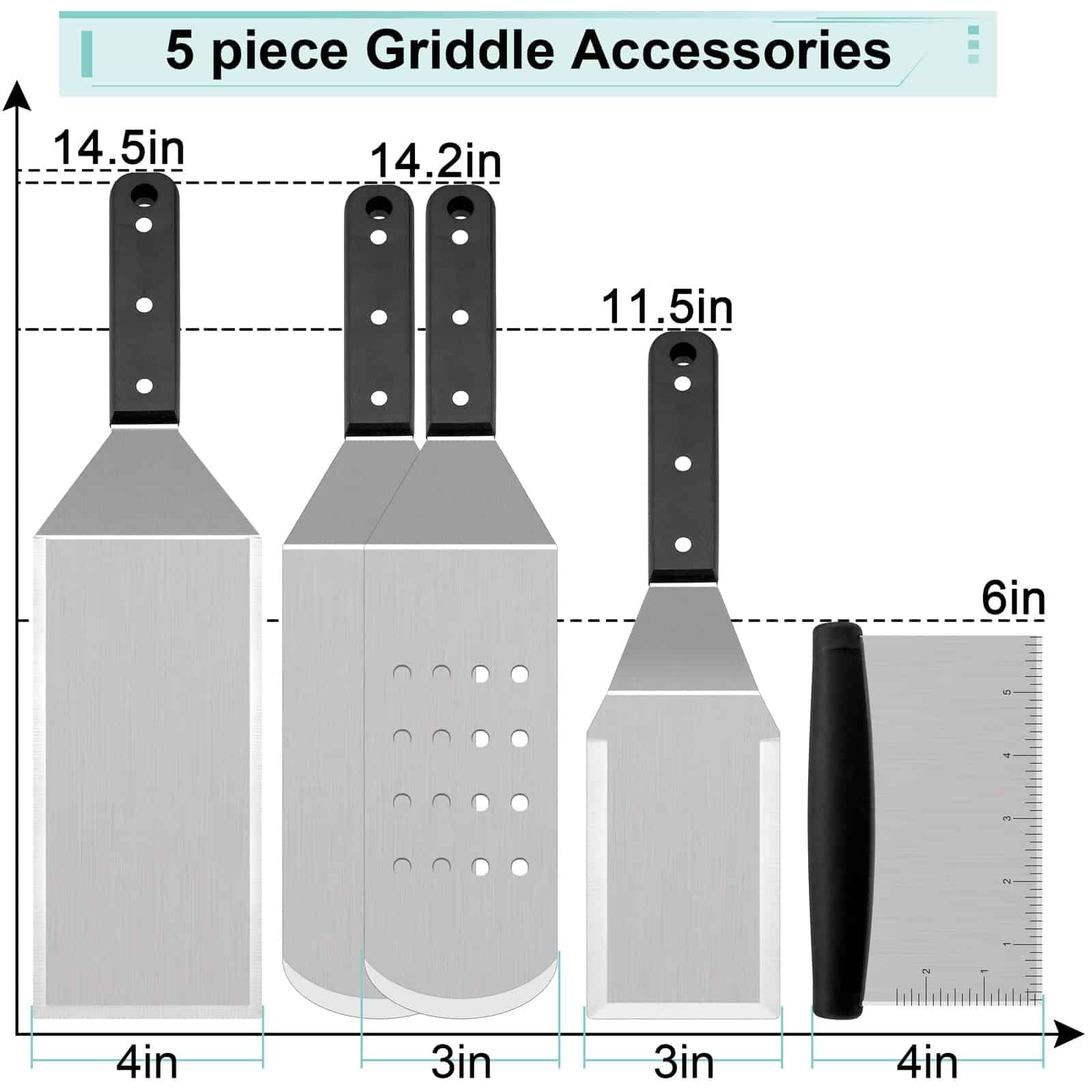 HaSteeL Juego de 5 espátulas de metal, espátula de acero inoxidable para parrilla y raspador de plancha, accesorios de plancha multiusos para cocinar a la parrilla, mango remachado y apto para lavavajillas. Fabricado en acero inoxidable más grueso de 1.5 mm para garantizar solidez y durabilidad. Suficientemente resistente para resistir la flexión o rotura. Construido para durar años con el mantenimiento adecuado. Apto para lavavajillas y lavado a mano es muy fácil. Las espátulas largas facilitan el volteo y levantamiento. El borde de la espátula corta es lo suficientemente afilado para cortar alimentos blandos. La espátula grande de metal tiene suficiente espacio para contener más cosas. El raspador de plancha es ideal para picar, cortar y raspar. El diseño de tres remaches ensambla el plástico y el metal de forma segura. No te preocupes más por que las uñas se desprendan y se muevan. Los mangos resistentes al calor están construidos con plástico ABS de alta calidad para garantizar que no te quemes las manos. Viene con 1 x espátula grande para hamburguesas, 1 x espátula corta para parrilla, 1 x Flipper sólido para panqueques, 1 x espátula perforada, 1 x raspador de plancha, 4 ganchos colgantes para almacenar ordenadamente sin desorden. Mantiene tus espátulas de plancha bien organizadas. El kit de herramientas de plancha es esencial para chefs de restaurantes, amantes de la barbacoa o cualquier persona que disfrute de asar a la parrilla en interiores o al aire libre en campamentos. Ideal para planchas de hierro fundido, teppanyaki, planchas planas, hibachi, planchas de pellets y más. Excelente regalo para papá y esposo