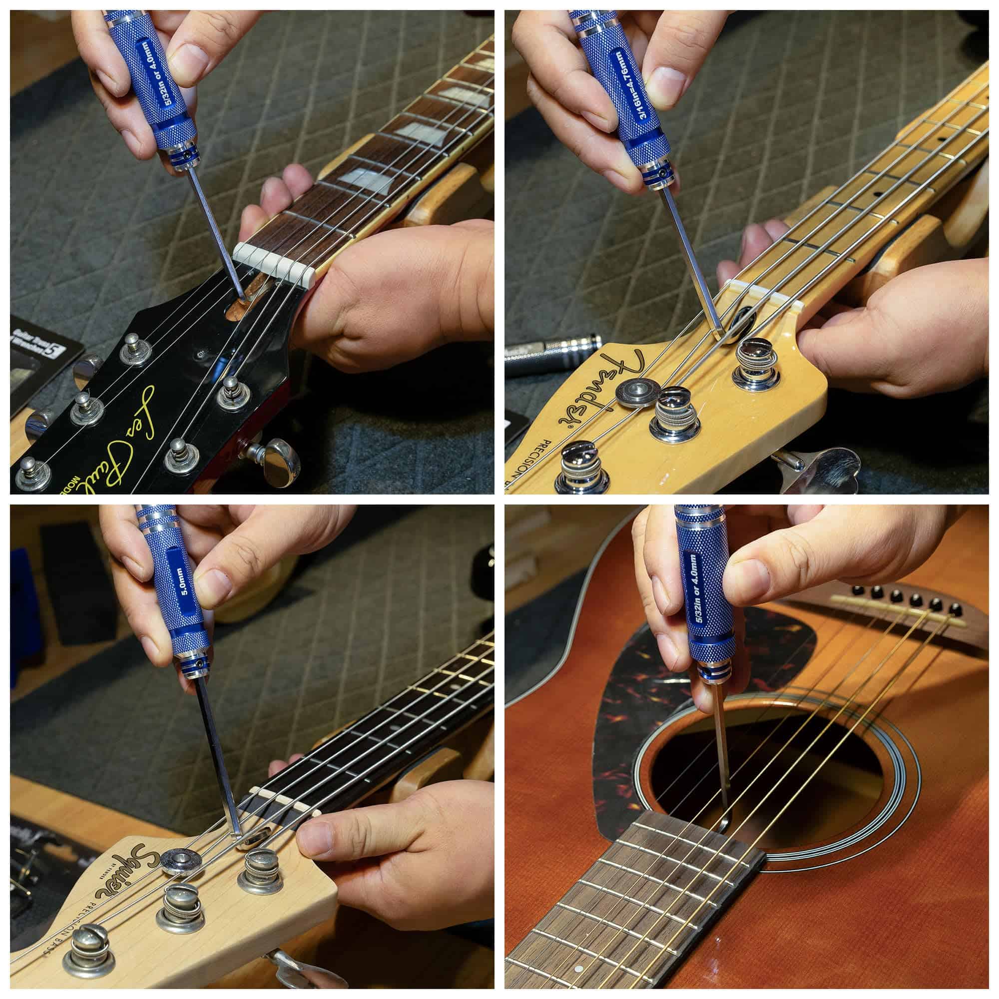 Juego de 5 llaves Allen de acero endurecido Musiclily Pro para ajuste de varilla de ajuste de guitarra bajo. Este conjunto de 5 llaves Allen está diseñado para ajustar la varilla de ajuste en guitarras y bajos, pero también se puede utilizar para propósitos generales. Están fabricadas en acero endurecido para mayor resistencia y durabilidad, con una precisión mecanizada que garantiza un alto rendimiento. Cada una de las llaves tiene un mango de aleación de aluminio antideslizante con tapas en los extremos, lo que proporciona un agarre cómodo y facilita su uso. La longitud total de las llaves es de 175 mm, y cada mango está marcado con el tamaño correspondiente para una fácil identificación. Este juego de 5 llaves Allen es una adición esencial a cualquier caja de herramientas de un músico o aficionado a la guitarra o bajo.