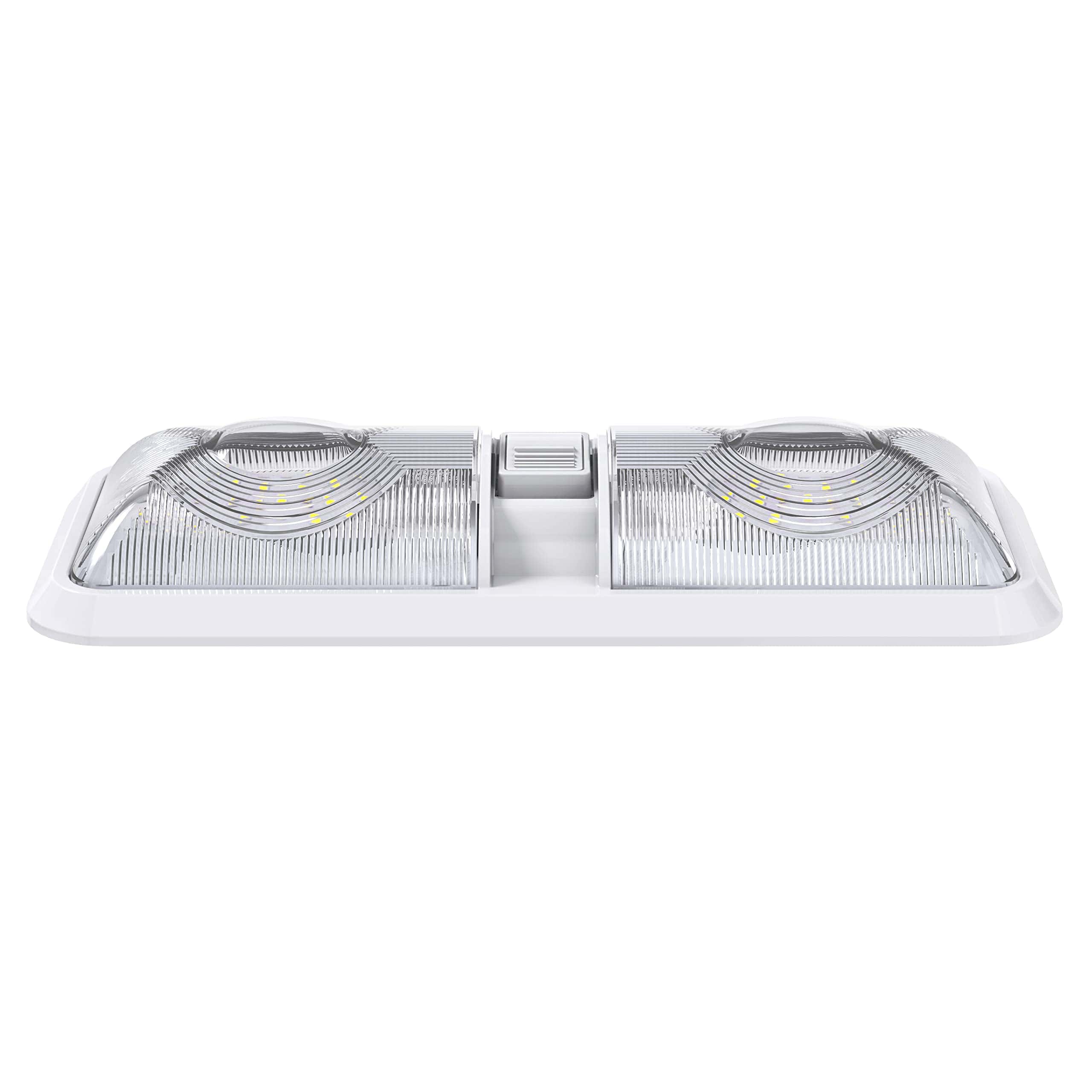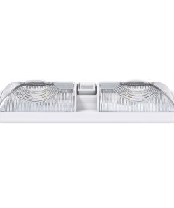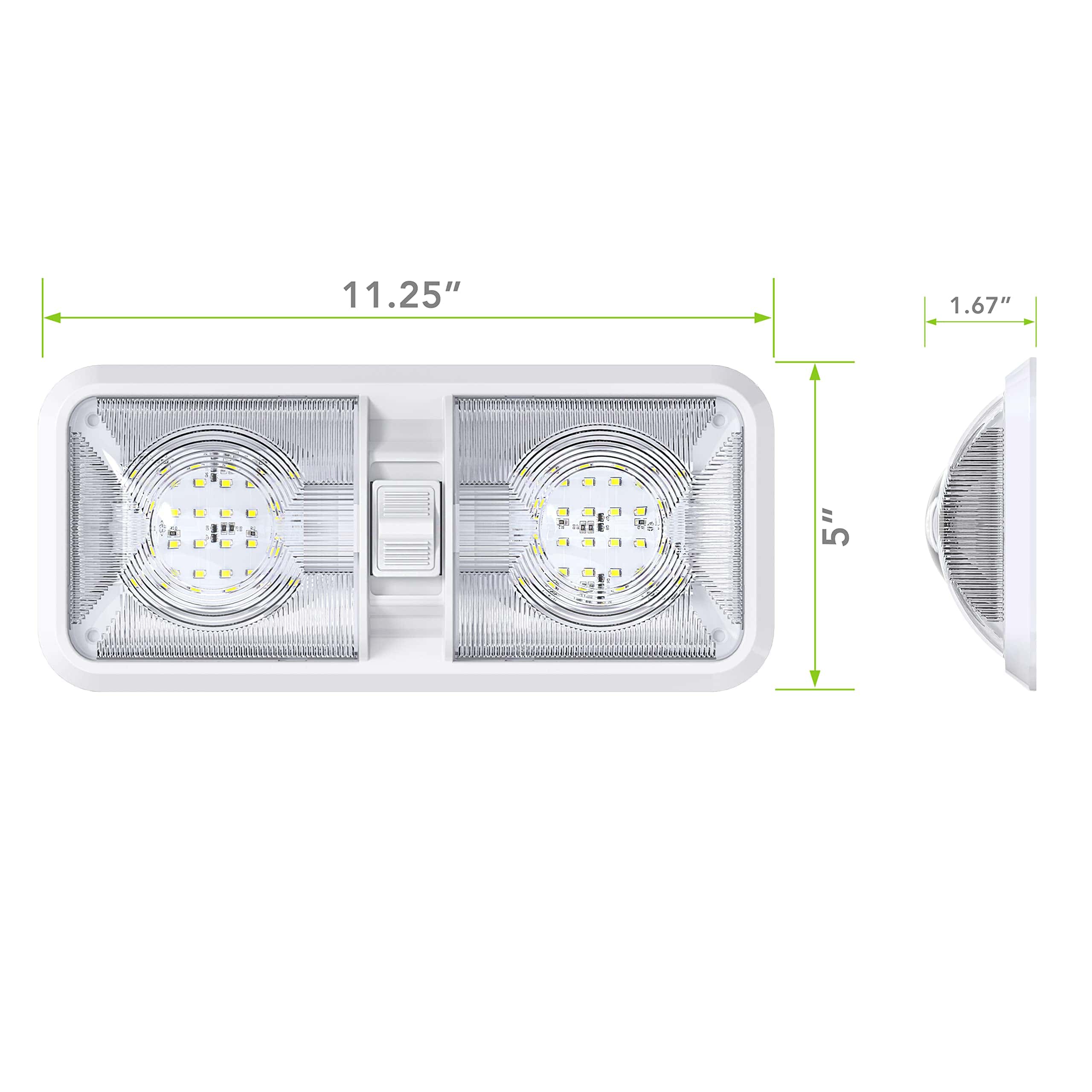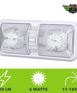 Juego de 5 Luces de Domo Doble Nuevo con 48 LEDs 2835SMD, 2 x 275 Lúmenes Blanco Natural RV, Marino y de Auto un Total de 520 Lúmenes. Descripción: La Luz de Domo Doble viene con dos paneles T10 Wedge de 2 x 275 Lúmenes, Bombilla LED con Interruptor de 3 vías (para usar un lado o ambos lados de la luz) Las aplicaciones incluyen vehículos recreativos de 12 Voltios DC. Rango de Voltaje Amplio que puede manejar 11-18V Temperatura de Color: 6000-6500K Blanco Frío 2 x 24 Altos Leds Wedge estilo 2835 SMD LEDs con una expectativa de vida de 60,000 horas. Dura muchas veces más que una bombilla de luz estándar Dimensiones: 11 1/4″L x 5″W x 2″H Especificaciones: El accesorio viene con una bombilla LED hecha con SMD de alta calidad El peso del producto es aproximadamente 8 oz. cada uno