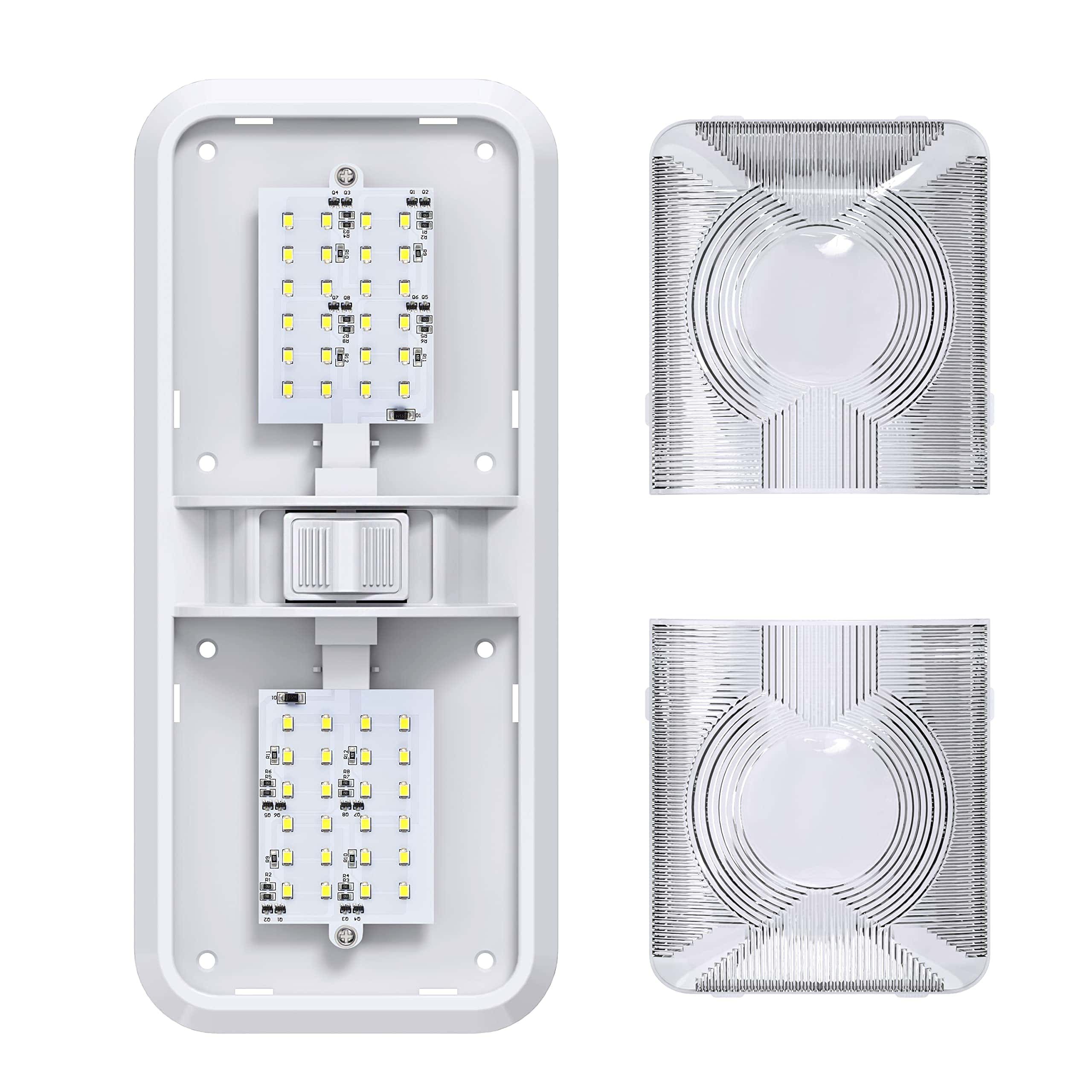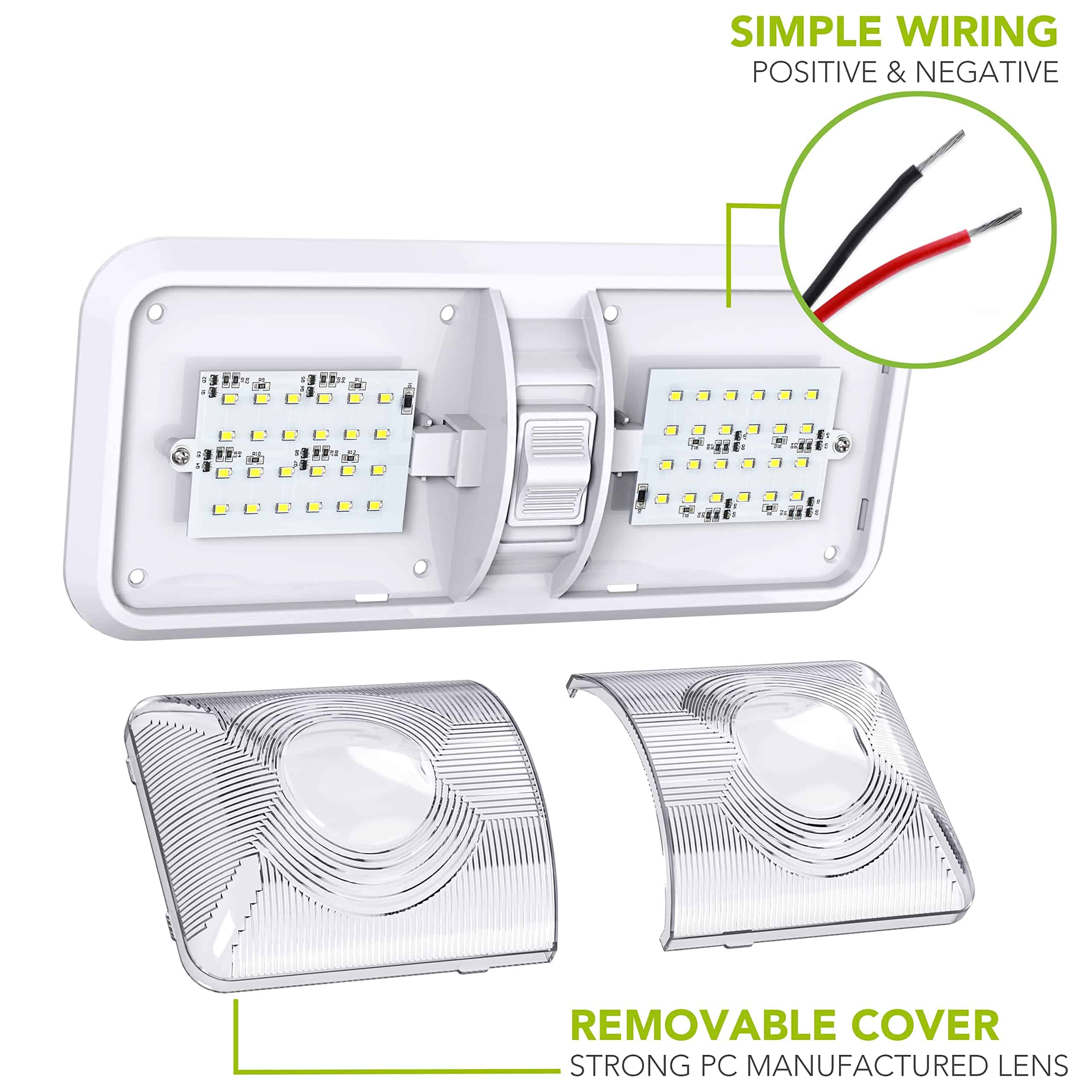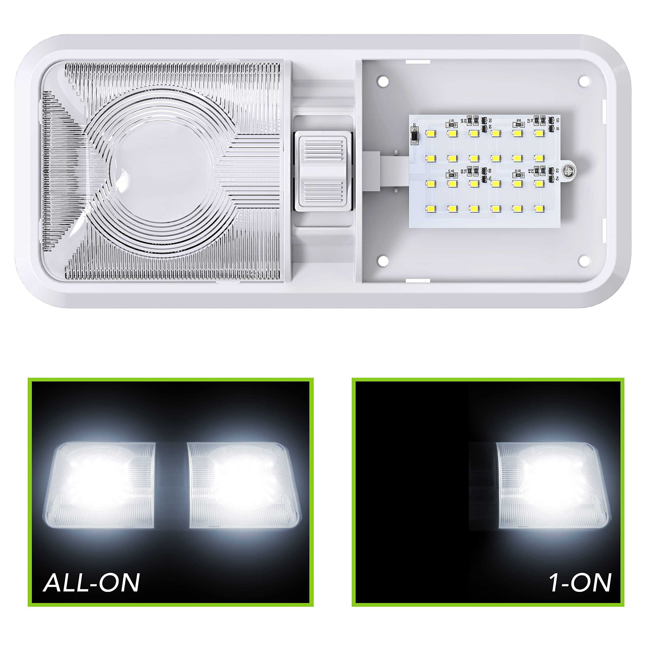 3. Diseño con Interruptores ON/OFF Convenientes: interruptor de 3 vías integrado que le permite usar un lado o ambos lados de la luz de forma independiente; agrega gran funcionalidad a cualquier área para iluminación y se utiliza ampliamente como luz de repuesto perfecta para Coche/RV/Remolque/Casa Rodante/Barcos Marinos.