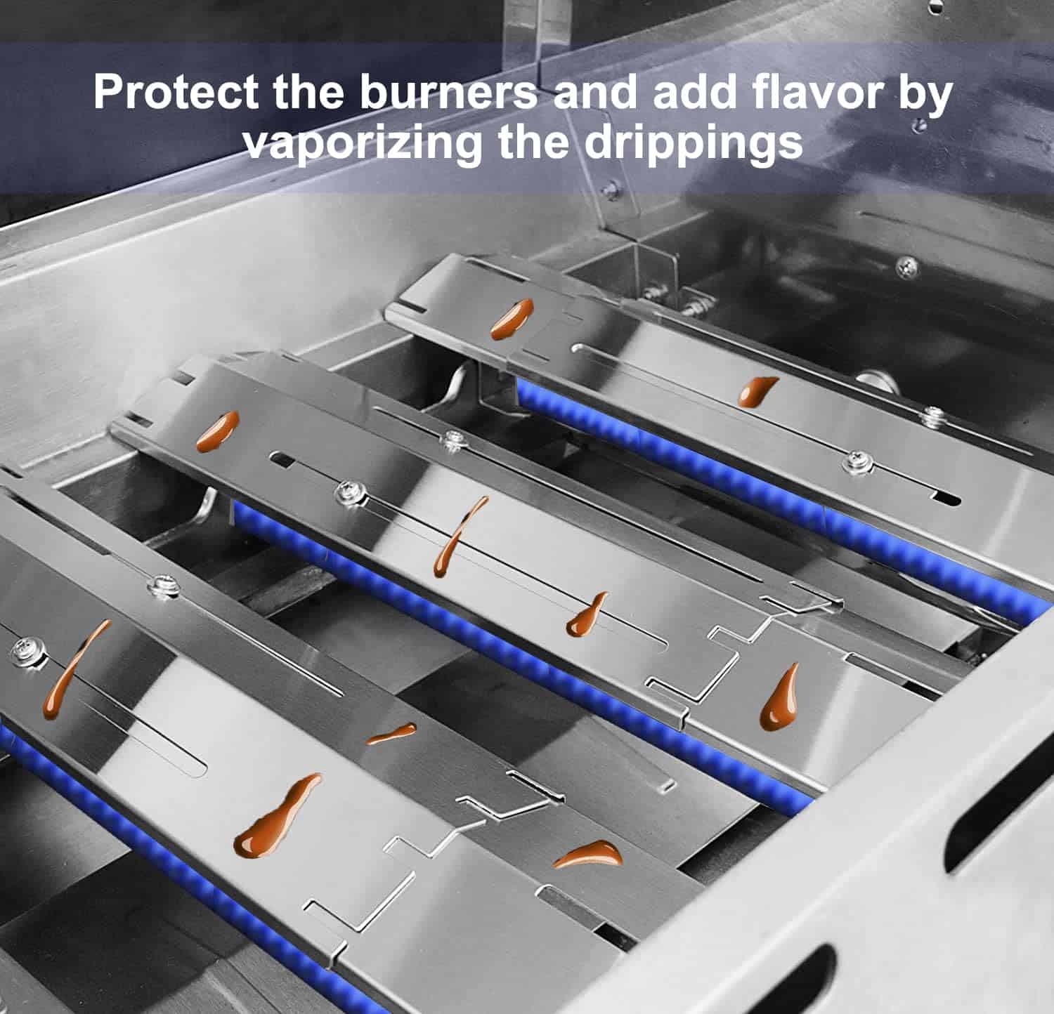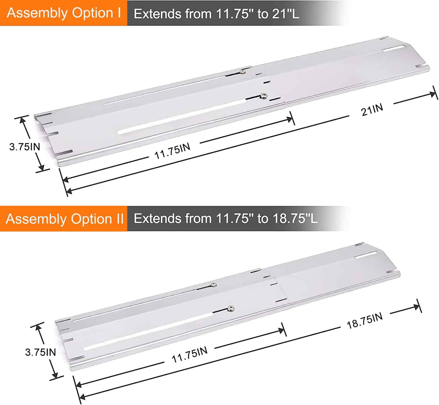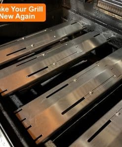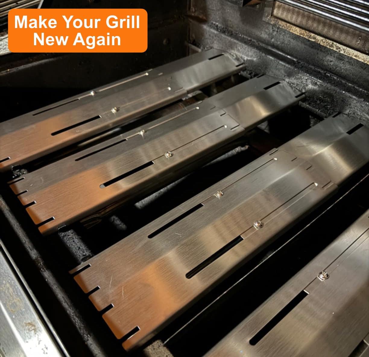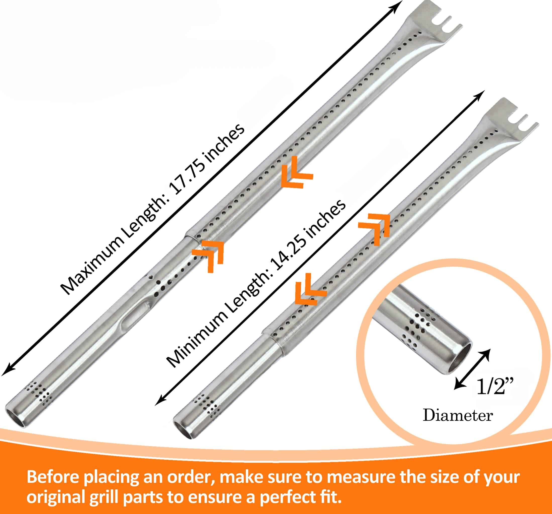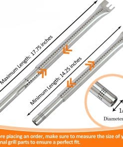 Actualice su parrilla con nuestros repuestos universales de tentes de calor y quemadores para parrillas de 5 quemadores. Mejore su experiencia de parrilla con nuestras piezas de repuesto de alta calidad diseñadas para una variedad de marcas de parrillas populares. Nuestros escudos de calor y quemadores están fabricados con acero inoxidable duradero, ofreciendo un grosor ideal para un rendimiento de cocción óptimo. Con características ajustables, estas piezas están diseñadas para adaptarse a una variedad de parrillas de 5 quemadores, asegurando versatilidad y comodidad. La información de las piezas de repuesto de parrilla incluye 5 x tentes de calor y 5 x quemadores (cada uno en 2 piezas), además de los herrajes necesarios para el montaje. Las dimensiones del protector de calor de repuesto: longitud ajustable de 11.75 pulgadas a 21 pulgadas, ancho de 3.75 pulgadas. Dimensiones del quemador: longitud ajustable de 14.5 pulgadas a 17.75 pulgadas, diámetro de 1/2 pulgada. Los escudos de calor están hechos de acero inoxidable resistente. Los quemadores están hechos de acero inoxidable para durabilidad y distribución uniforme del calor. Compatibilidad: Brinkmann, Kenmore, Master Forge, Nexgrill, Dyna Glo, Charbroil, Expert Grill, Backyard Grill, Better Homes & Garden (BHG), Weber, Outback, Uniflame, Outdoor Gourmet, Master Cook, Otras marcas que requieren placas de calor y quemadores en este rango de tamaño. Antes de realizar un pedido, asegúrese de medir el tamaño de sus piezas de parrilla de gas original de 5 quemadores para garantizar un ajuste perfecto.