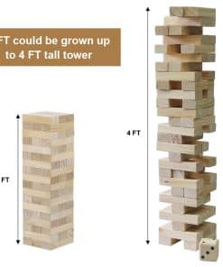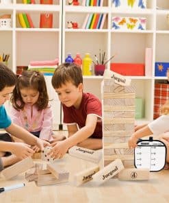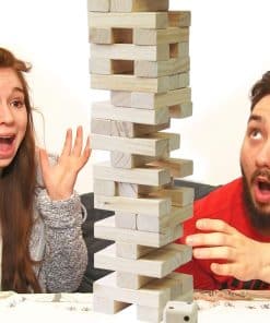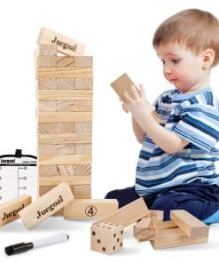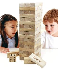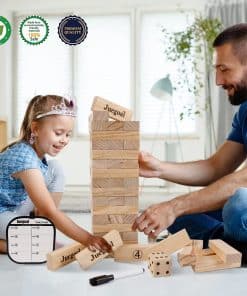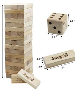 Cómo jugar Hay tantas maneras de jugar a este juego gigante de bloques de torre de caída. La mayoría de los grupos juegan apilando los bloques en conjuntos de 3 con capas horizontales y verticales alternando con cada nivel. Después de que los bloques gigantes de madera se apilan uno encima del otro, todos los jugadores se turnan tirando de una pieza a la vez y apilando una parte superior del nivel más alto. Los jugadores pueden elegir cualquier lugar en el nivel más alto para colocar su pieza. A medida que los jugadores toman turnos sacando bloques uno por uno, la torre se vuelve menos estable y mucho más alta. Pronto se convierte cada vez menos en movimientos más fáciles de construir y la Torre Gigante se acumula hasta su punto más alto. Poco después, la torre alta cae con el turno del jugador perdedor que causó que los bloques grandes se desconectaran del equilibrio para que la Torre de la Tumble se desmoronara. También puedes hacer tus reglas personalizadas incorporando los dados en el juego (por ejemplo: cualquier número que ruedes, es el número que debes mover). Tener el mejor de los tiempos y desarrollar varias habilidades: Además de ser extremadamente divertido, este increíble bloque gigante de madera puede ayudarte a desarrollar tus habilidades motoras finas, mejorar tu coordinación mano-ojo, mejorar tu equilibrio, ser más paciente y adquirir un excelente autocontrol. Especificaciones: Material: madera de pino de primera calidad. Tamaño del bloque: 6 x 2 x 1.3 pulgadas por bloque. Tamaño de dados: 2.3 x 2.3 x 2.3 pulgadas. Tamaño total: 5.9 x 5.9 x 2.4 pulgadas. El paquete incluye: 54 bloques de torre, 1 dado, 1 bolsa de mano.