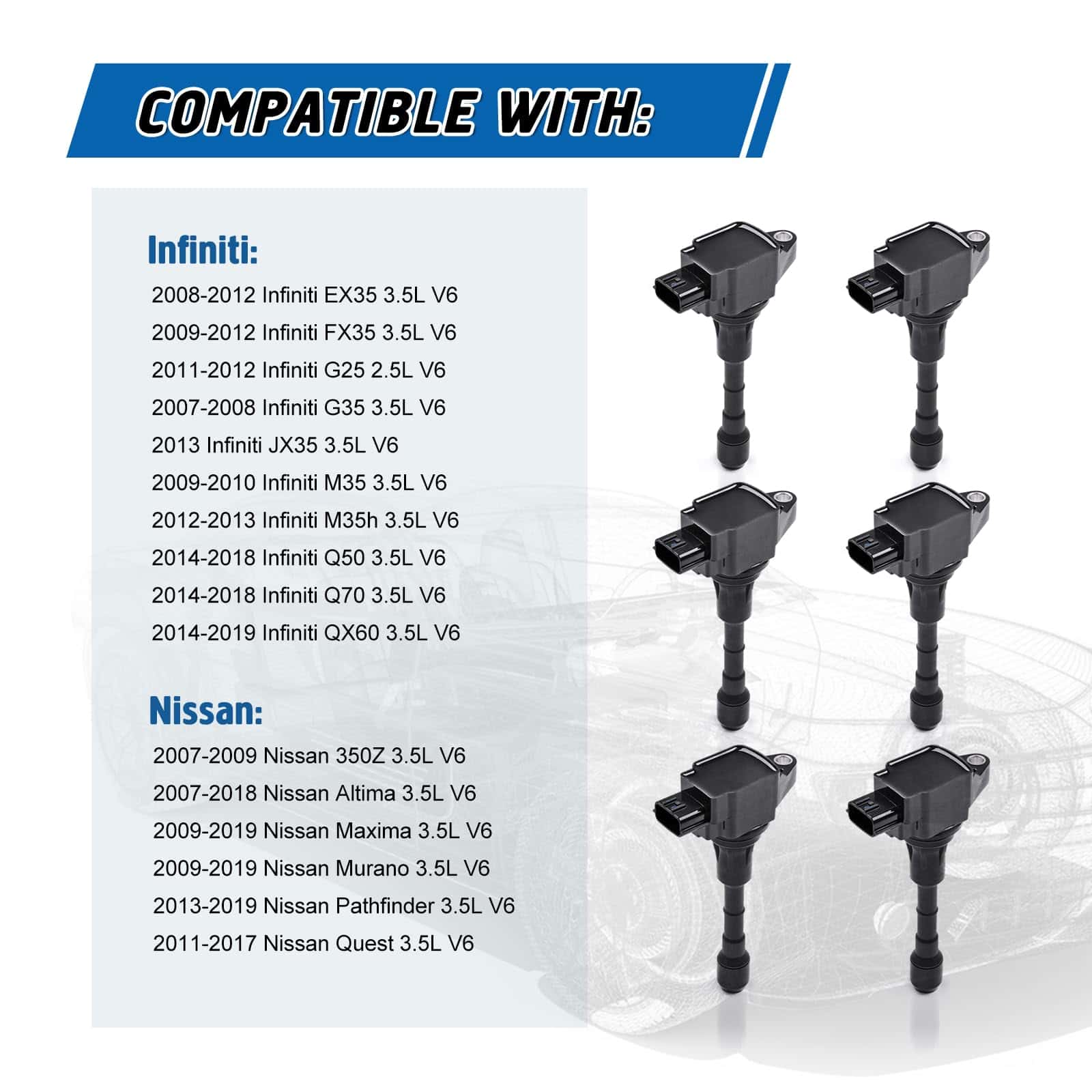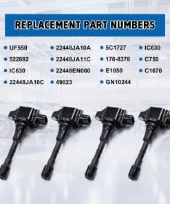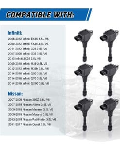 Juego de 6 Bobinas de Encendido Compatible con Nissan 350Z Altima Maxima Murano Pathfinder Quest Infiniti EX35 FX35 G25 G35 JX35 M35 Q50 Q70 QX60 2.5L 3.5L V6. Reemplaza UF550 C1670. Este juego de bobinas de encendido es compatible con una amplia gama de vehículos Nissan e Infiniti, incluidos modelos como 350Z, Altima, Maxima, Murano, Pathfinder, Quest, EX35, FX35, G25, G35, JX35, M35, Q50, Q70 y QX60. La fabricación con materiales de alta calidad garantiza un rendimiento premium, mayor estabilidad y fiabilidad, superando el estándar OEM. Las bobinas de encendido son componentes esenciales para el funcionamiento adecuado del sistema de encendido de su vehículo, lo que ayuda a evitar problemas comunes como temblor en el ralentí, condiciones de fallo/arranque y la luz de advertencia del motor encendida. Este juego de bobinas es fácil de instalar y viene con un paquete de 6 unidades. Ofrecemos un servicio al cliente las 24 horas y una garantía de producto de 1 año para su tranquilidad. ¡Asegúrese de verificar la compatibilidad con sus piezas antes de realizar la compra!