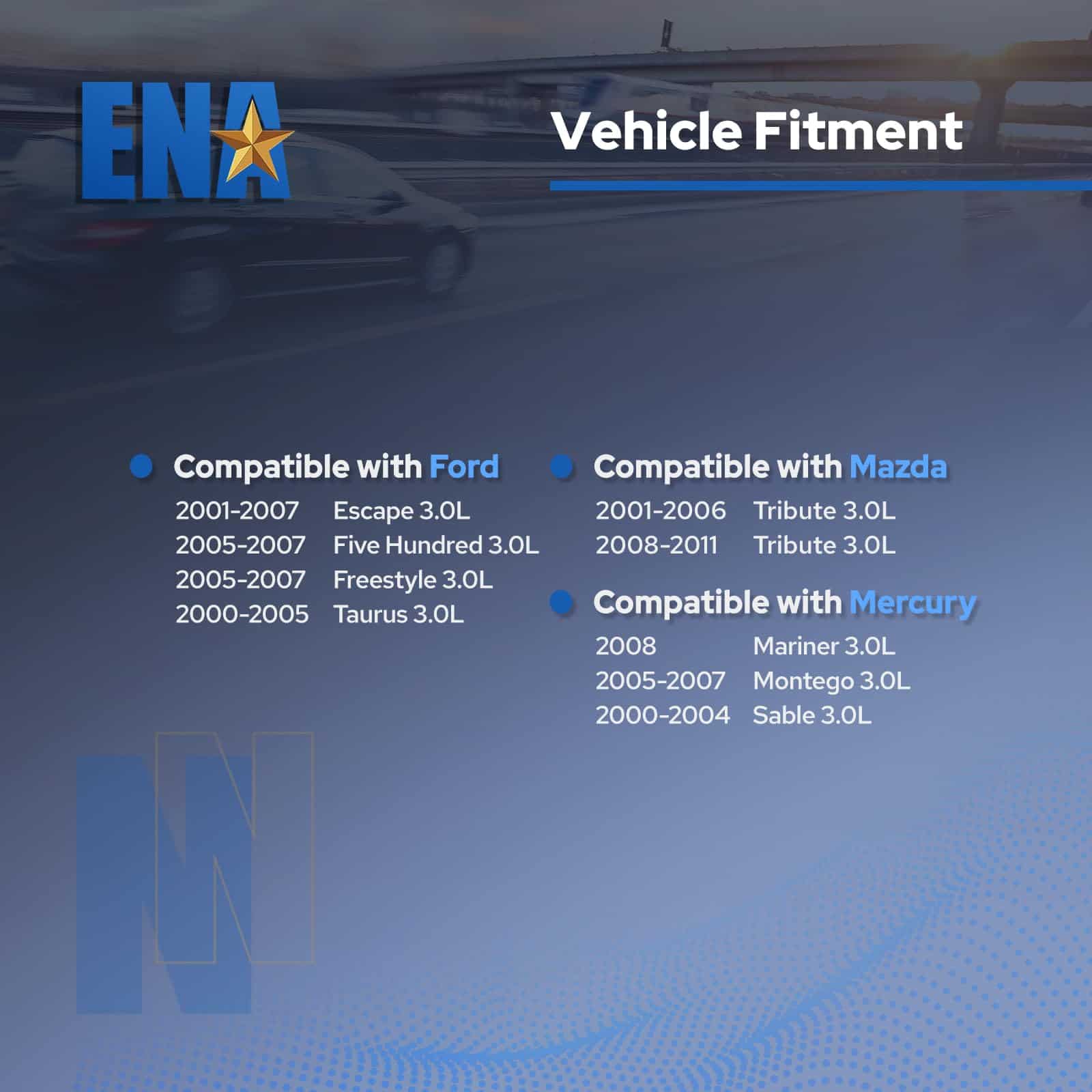 2. Compatible con Ford Mercury Mazda 2001-2008 Escape; 2005-2007 Five Hundred; 2005-2007 Freestyle; 2000-2005 Taurus; 2005-2008 Mariner; 2005-2007 Montego; 2000-2004 Sable; 2001-2011 Tribute. Compatible con motor V6 3.0L; Compatible con Ford Mercury Mazda 01 02 03 04 05 06 07 08.