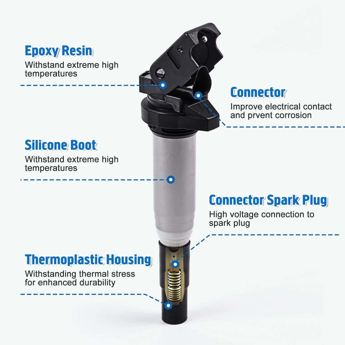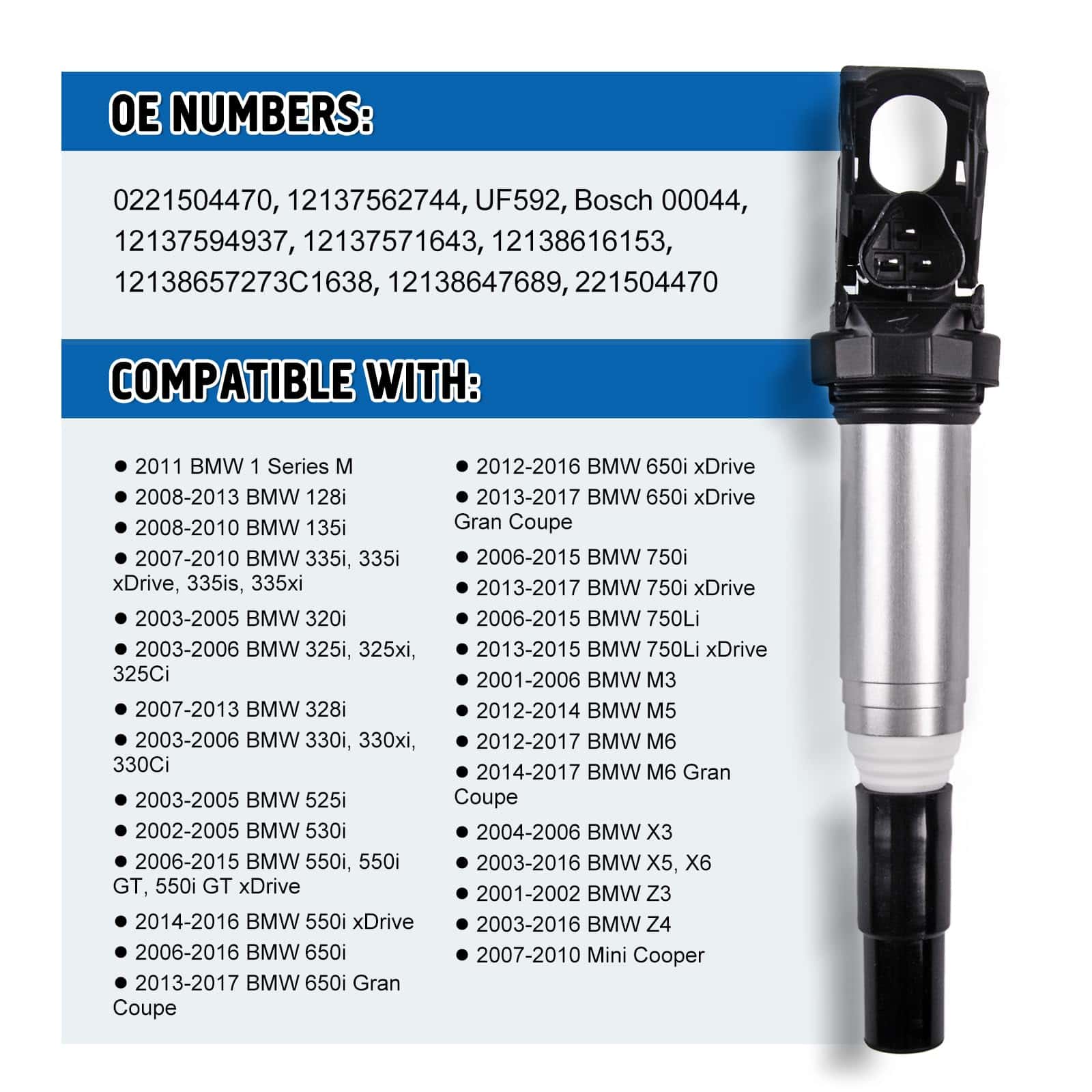 Este juego de 6 bobinas de encendido GOCPB es compatible con una amplia gama de modelos de BMW, incluyendo BMW 1 Series M, BMW 128i, BMW 135i, BMW 335i, BMW 320i, entre otros. Estas bobinas están fabricadas con materiales de alta calidad que ofrecen mayor estabilidad y confiabilidad, superando el estándar OEM. Esto ayuda a solucionar problemas comunes asociados con bobinas defectuosas, como temblores en ralentí, fallos de encendido o arranque, y la activación de la luz del motor. La instalación es rápida y sencilla, ya que se trata de un reemplazo directo de las partes originales. Además, el cable de cobre utilizado garantiza un rendimiento óptimo. Este producto es 100% nuevo y viene en un paquete original de fábrica. Ofrecemos servicio al cliente las 24 horas del día y una garantía de producto por 1 año. Por favor, consulte la lista de compatibilidad en la parte superior de la página para confirmar que coincide con su vehículo.