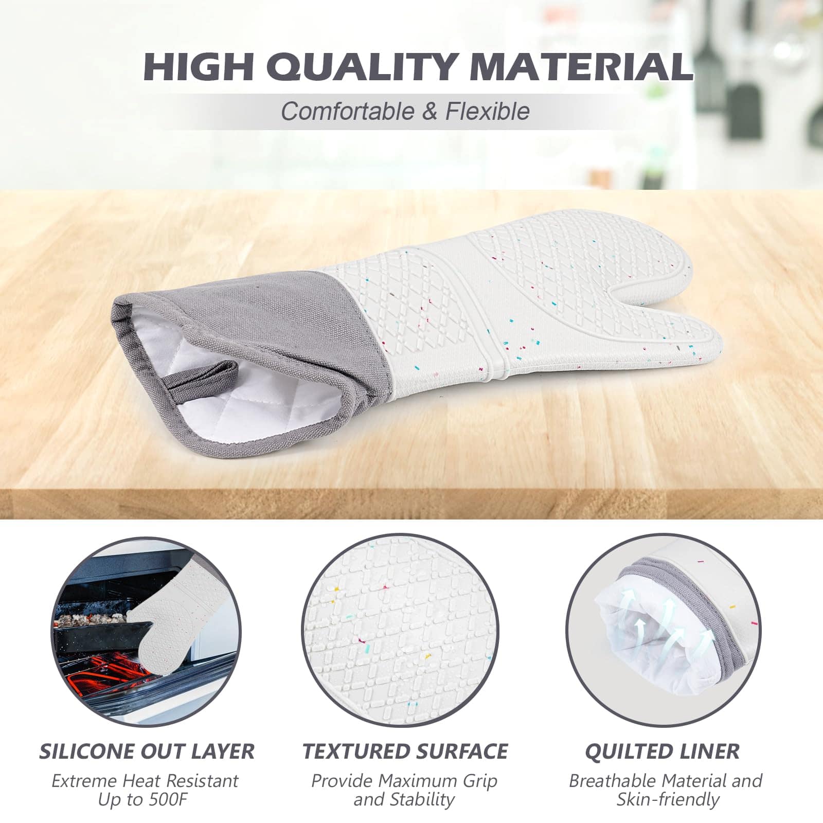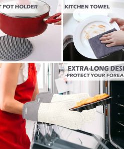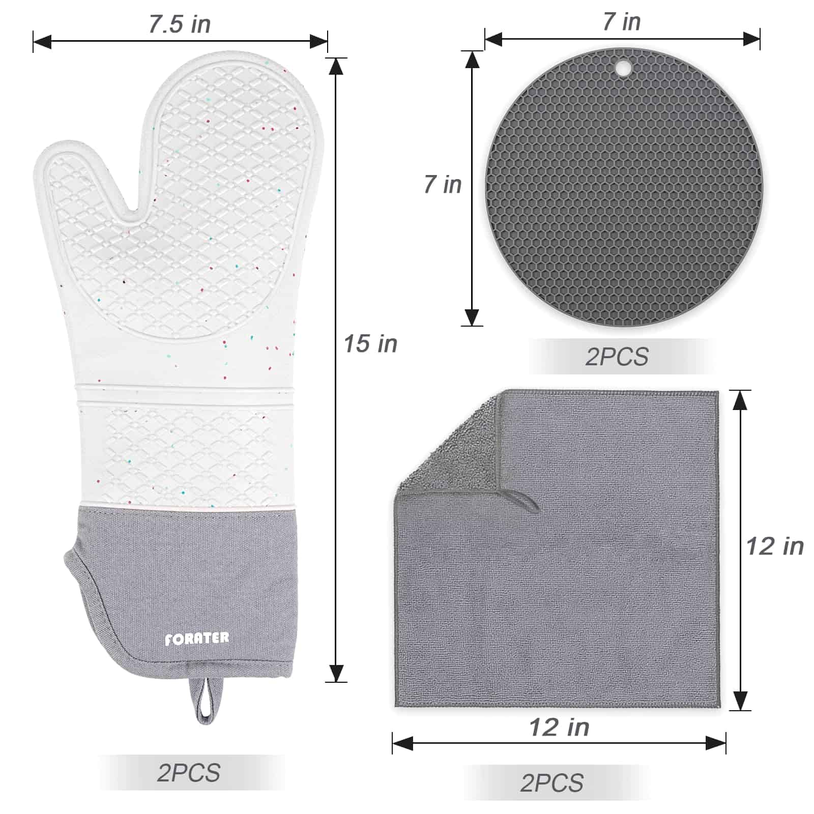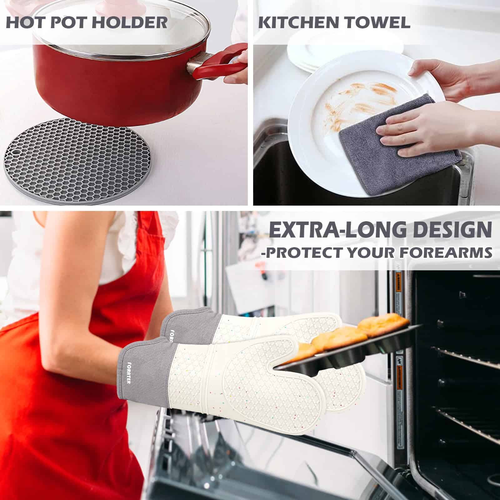 2. Juego de accesorios de cocina de 6 piezas: Con un diseño extra largo (15×7.5 pulgadas), estas manoplas de cocina recién diseñadas brindan cobertura adicional a tus antebrazos y siguen siendo cómodas. El set también incluye 2 agarraderas (7×7 pulgadas) y 2 paños de cocina (12×12 pulgadas). Perfecto para cocinar en interiores, hornear, hacer barbacoas y realizar tareas de cocina.