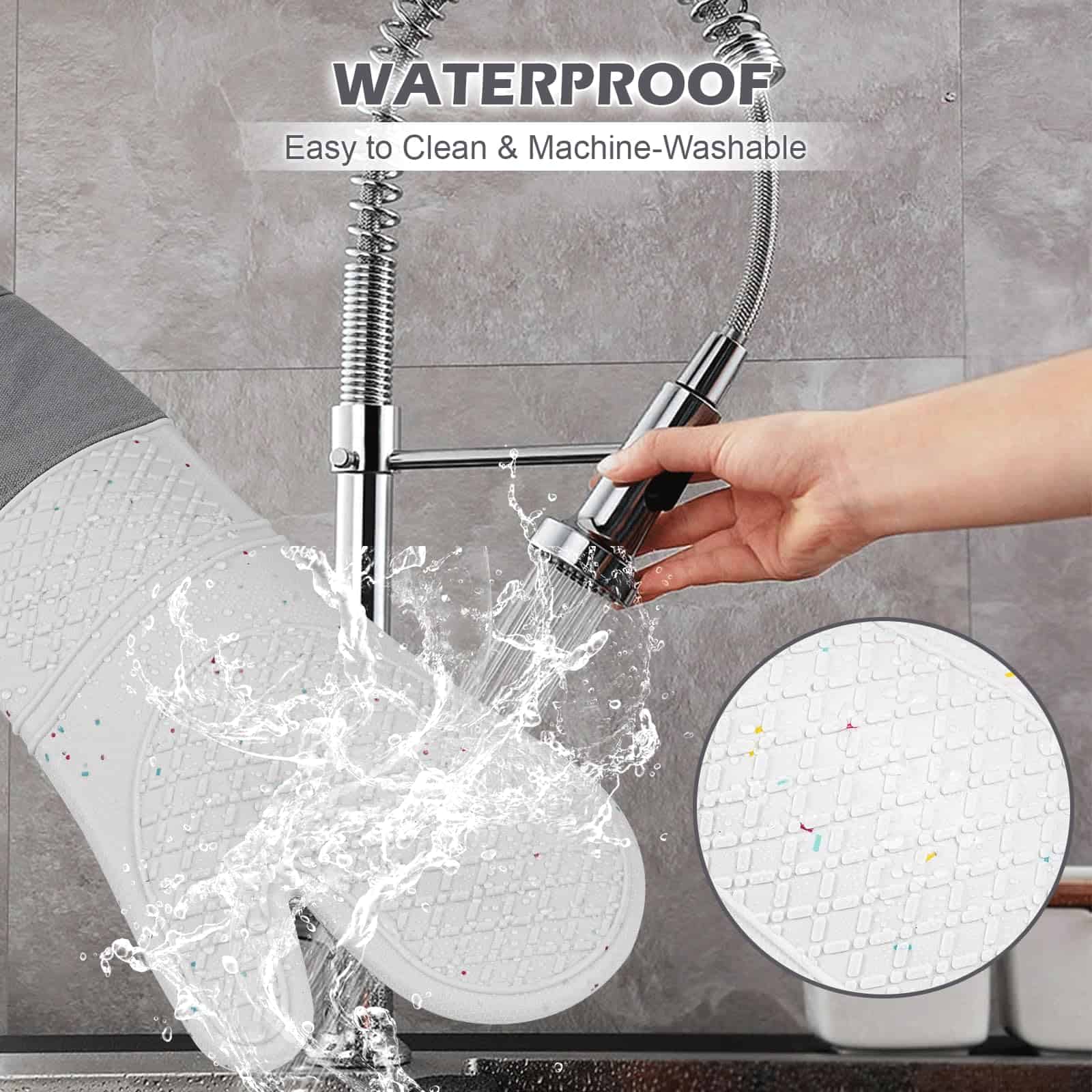 3. Texturizado para un agarre antideslizante: Nuestras manoplas de horno de cocina están con una superficie de silicona texturizada para brindarte un mejor agarre en ollas y sartenes mientras cocinas y horneas. La parte de silicona es completamente impermeable para evitar quemaduras por el vapor de agua a alta temperatura que puede penetrar a través de los guantes de tela regulares.
