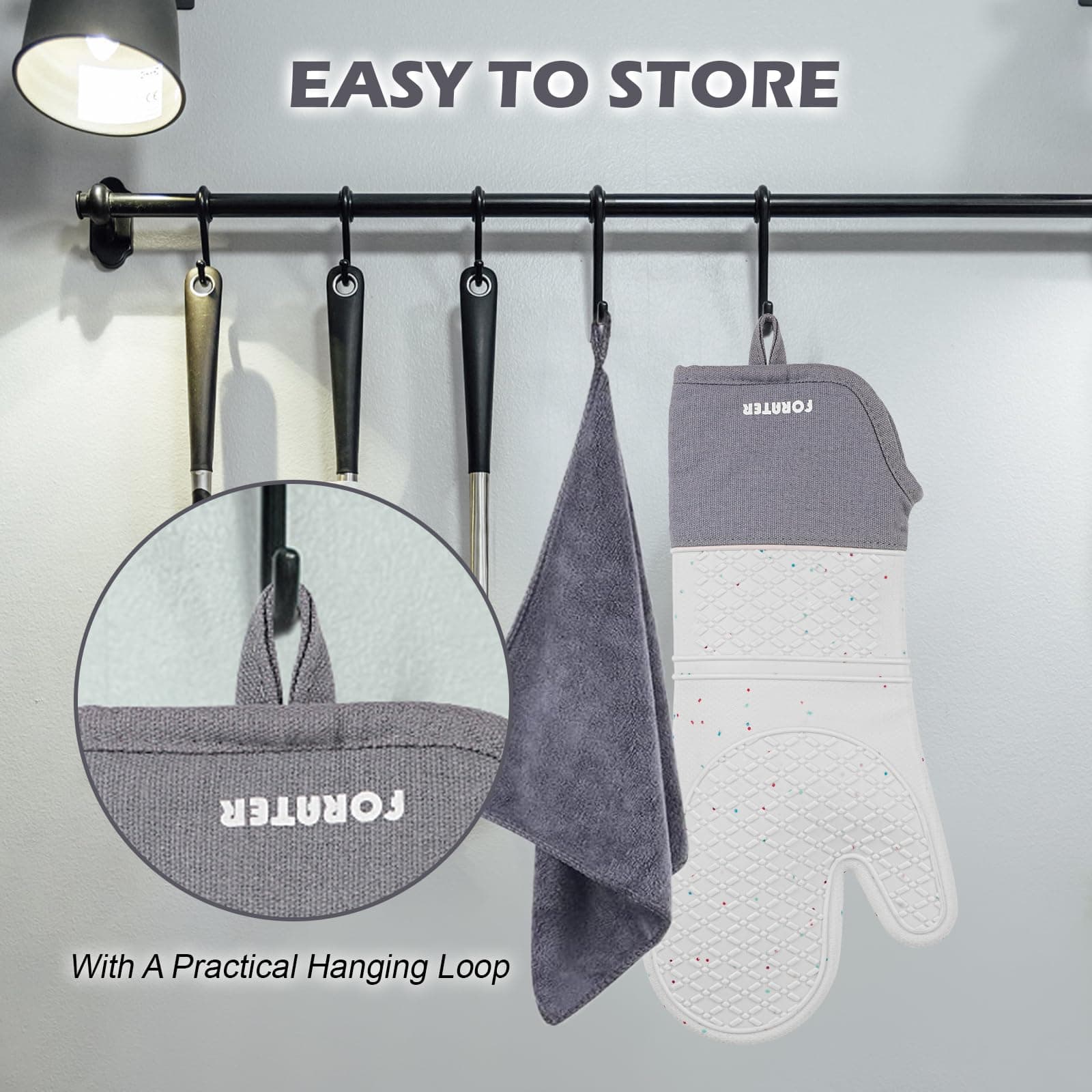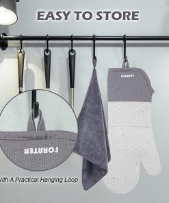 4. Fácil de limpiar y almacenar: Nuestras manoplas de horno de silicona se pueden lavar a máquina o a mano. Puedes enjuagar las manoplas de horno con agua tibia y jabonosa o simplemente ponerlas en la lavadora. Estas manoplas de cocina también están diseñadas con un lazo oculto para colgarlas cuando no estén en uso y ahorrar espacio en la cocina.