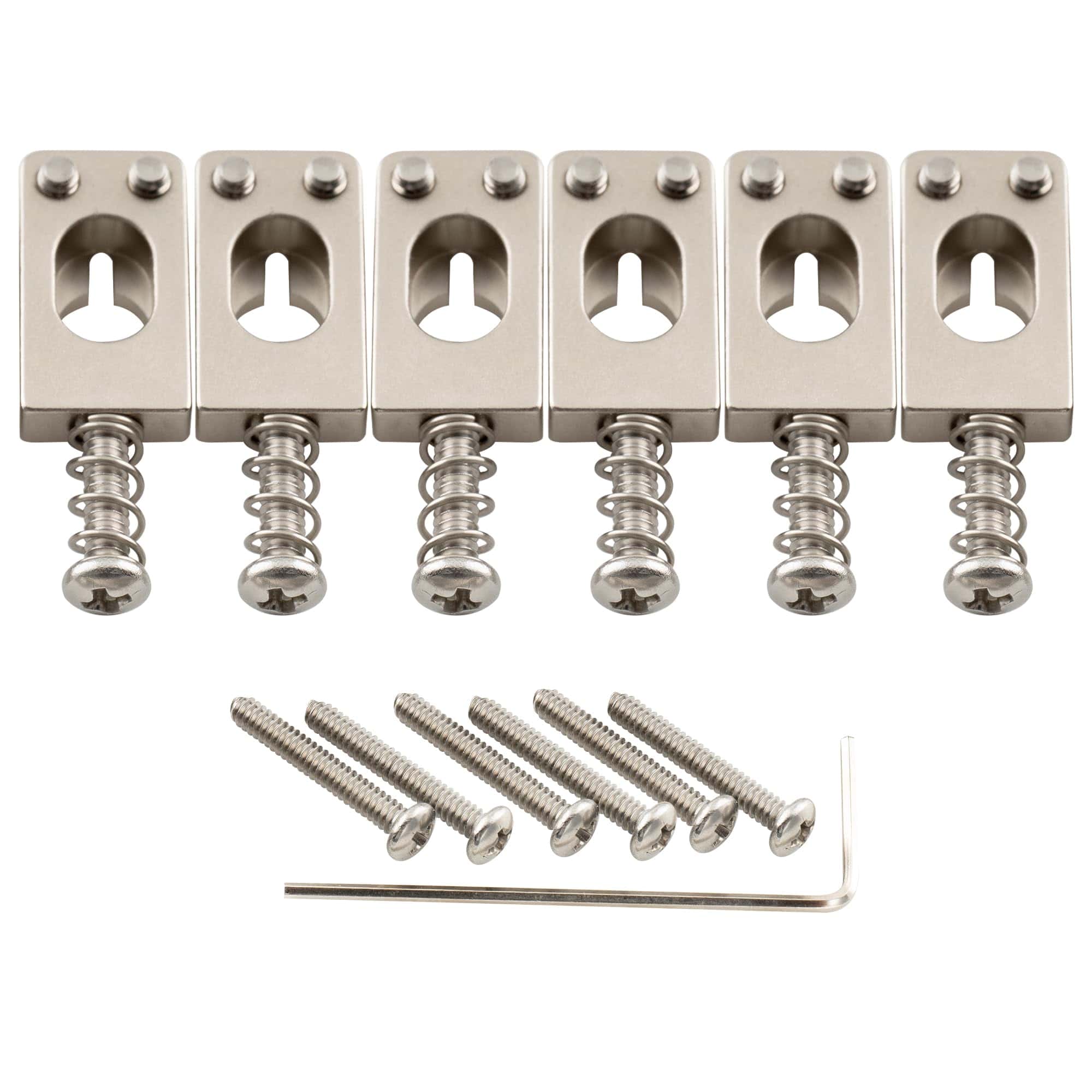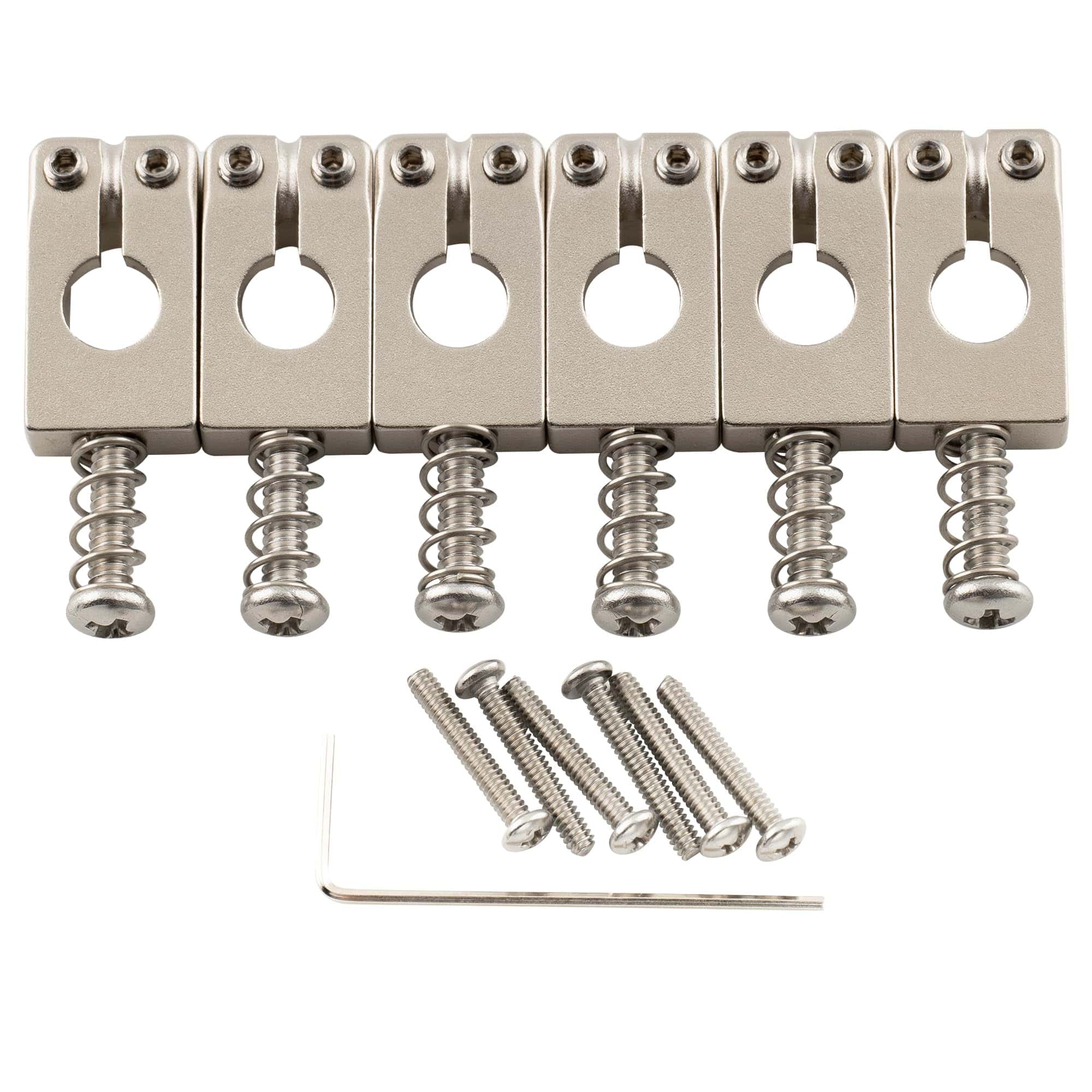 Juego de 6 Selletas de Puente de Trémolo Estilo PRS de Latón Macizo de 10.5mm para Guitarra Eléctrica Estilo Strat, Níquel. Buen reemplazo para las selletas de puente de trémolo estilo PRS, se ajusta al puente de guitarra estilo Strat con espaciado de cuerdas de 52.5mm (2-1/16 pulgadas). Ancho de selleta individual: 10.5mm (13/32 pulgadas), longitud: 19mm (3/4 pulgadas), con tornillos de altura de selleta UNC 4-40X5/16, tornillos de entonación de selleta UNC 4-40X5/8 y UNC 4-40X3/4, para cumplir con diferentes requisitos de puente. Material de latón macizo con técnicas de procesamiento CNC digital preciso, duradero y estable, proporciona una mejor entonación, brinda mejor sostenibilidad. Diseño moderno estilo PRS con bisel, sin bordes ásperos, reduce la rotura de cuerdas. El paquete incluye: 6 selletas y accesorios de montaje.