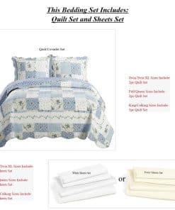 El juego de colchas Brea incluye 1 colcha tamaño California King de 106 pulgadas de ancho x 92 pulgadas de largo y dos fundas de almohada king de 20 pulgadas de ancho x 36 pulgadas de largo cada una. La colcha tiene una combinación de los colores azul, verde, blanco y crema. Las sábanas son de microfibra al 100% y vendrán en sólido/rayado y en los colores blanco/marfil, según disponibilidad. El juego de sábanas en tamaño California King de 4 piezas incluye una sábana plana de 108 pulgadas de ancho x 102 pulgadas de largo, una sábana ajustable de 72 pulgadas de ancho x 84 pulgadas de largo y dos fundas de almohada de 20 pulgadas de ancho x 40 pulgadas de largo. ¡Este juego de ropa de cama será maravilloso en tu dormitorio, habitación de invitados, camas de residencia universitaria, etc. También puedes regalar este set en cumpleaños, Día de la Madre/Padre o como regalo de inauguración de una casa! Lavable a máquina para un fácil cuidado.