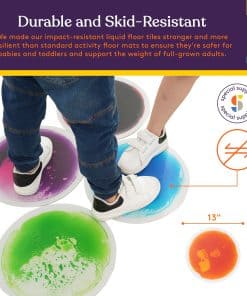 A true sensory experience, kids will love these floor activity mats that are filled with non-toxic liquid that move and change color as you step, press down, or hop along to create endless colorful fun. Dance, Play, and Learn: These liquid-encased sensory tiles are tear and leak resistant to hold up against playing games, dancing around, and hopping and boast a non-slip backing to ensure they stay in place during play. Home and Classroom Use: Our floor activity mat tiles don�t require installation and can be placed down in a nursery for teaching colors, used by teachers to get kids in the right spots, creating interactive games or just having fun with friends. Durable and Skid-Resistant: We made our impact-resistant liquid floor tiles stronger and more resilient than standard activity floor mats to ensure they�re safer for babies and toddlers and support the weight of full-grown adults. Exciting Sensory Play: Liquid tiles can go in a bedroom, kitchen, living room, or even a doctor�s office to help keep kids focused, engaged, and stress free. There�s also no installation required so you can move them anywhere with ease.