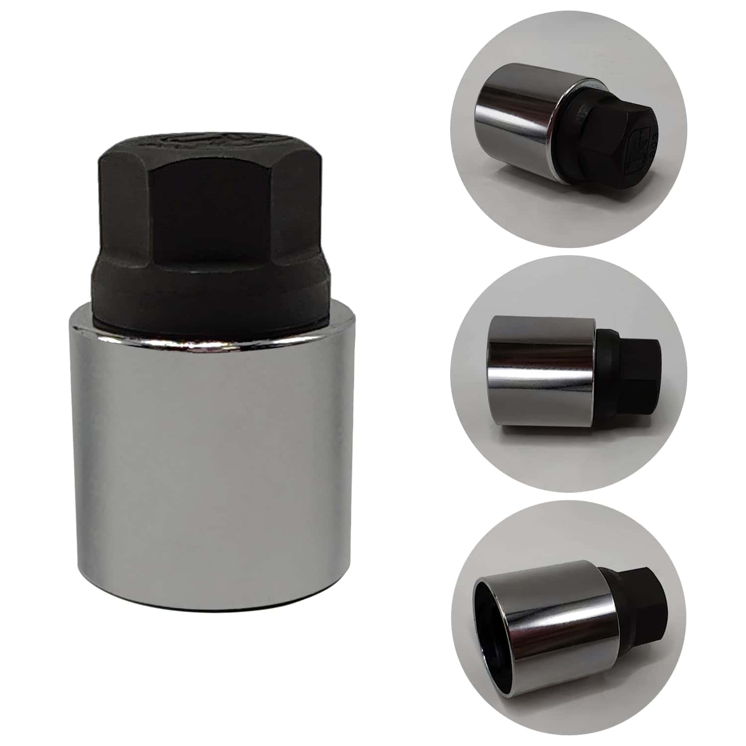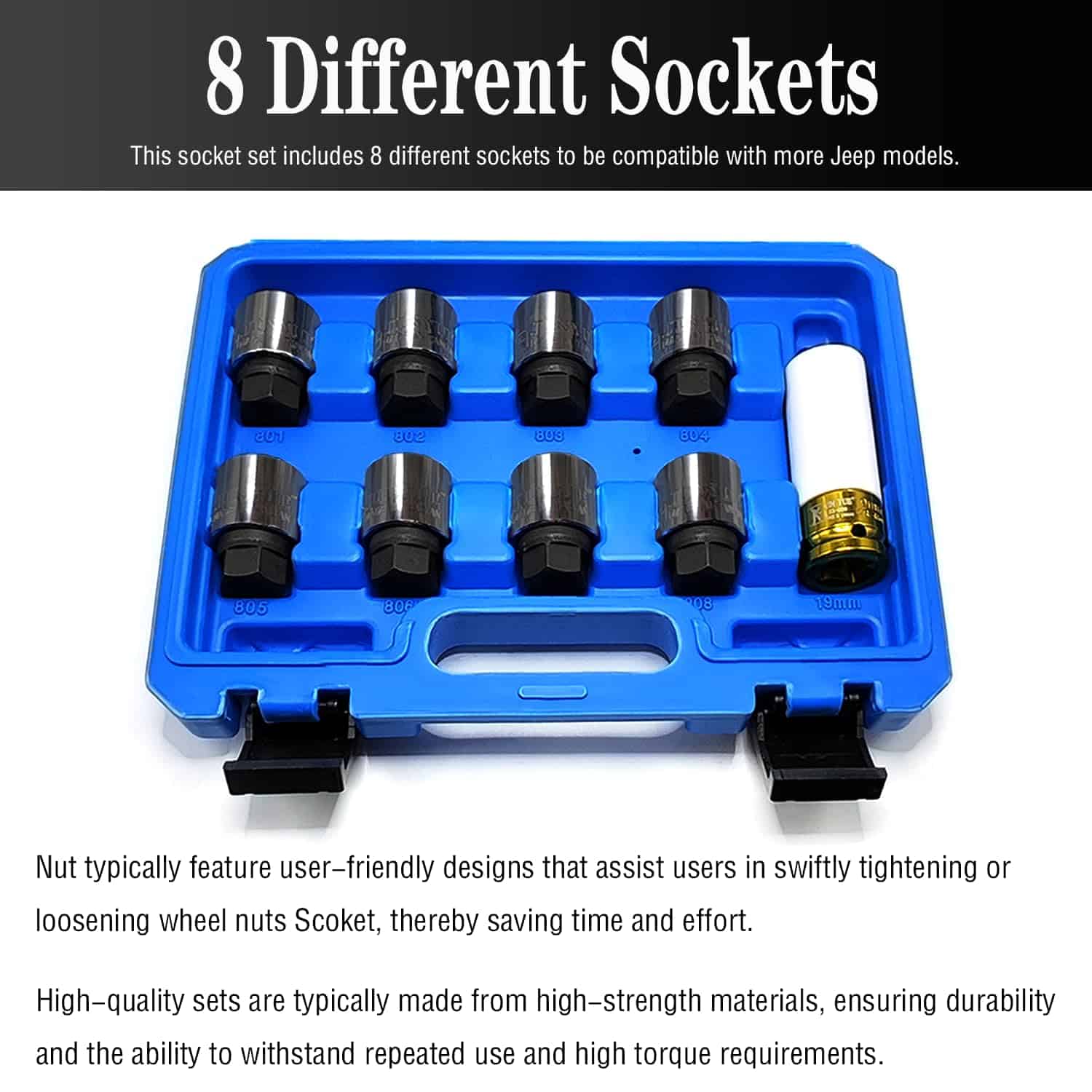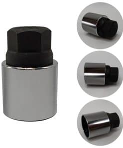 Juego de 9 piezas de 25.5mm Llave de Bloqueo de Tuerca de Rueda para Jeep, utilizado para quitar e instalar tuercas de rueda antirrobo. Una tuerca de bloqueo de rueda es apreciada por su durabilidad, conveniencia y practicidad, convirtiéndola en una herramienta indispensable para el mantenimiento y reparación automotriz. Por favor tenga en cuenta que no es apto para su uso con herramientas accionadas neumáticamente.