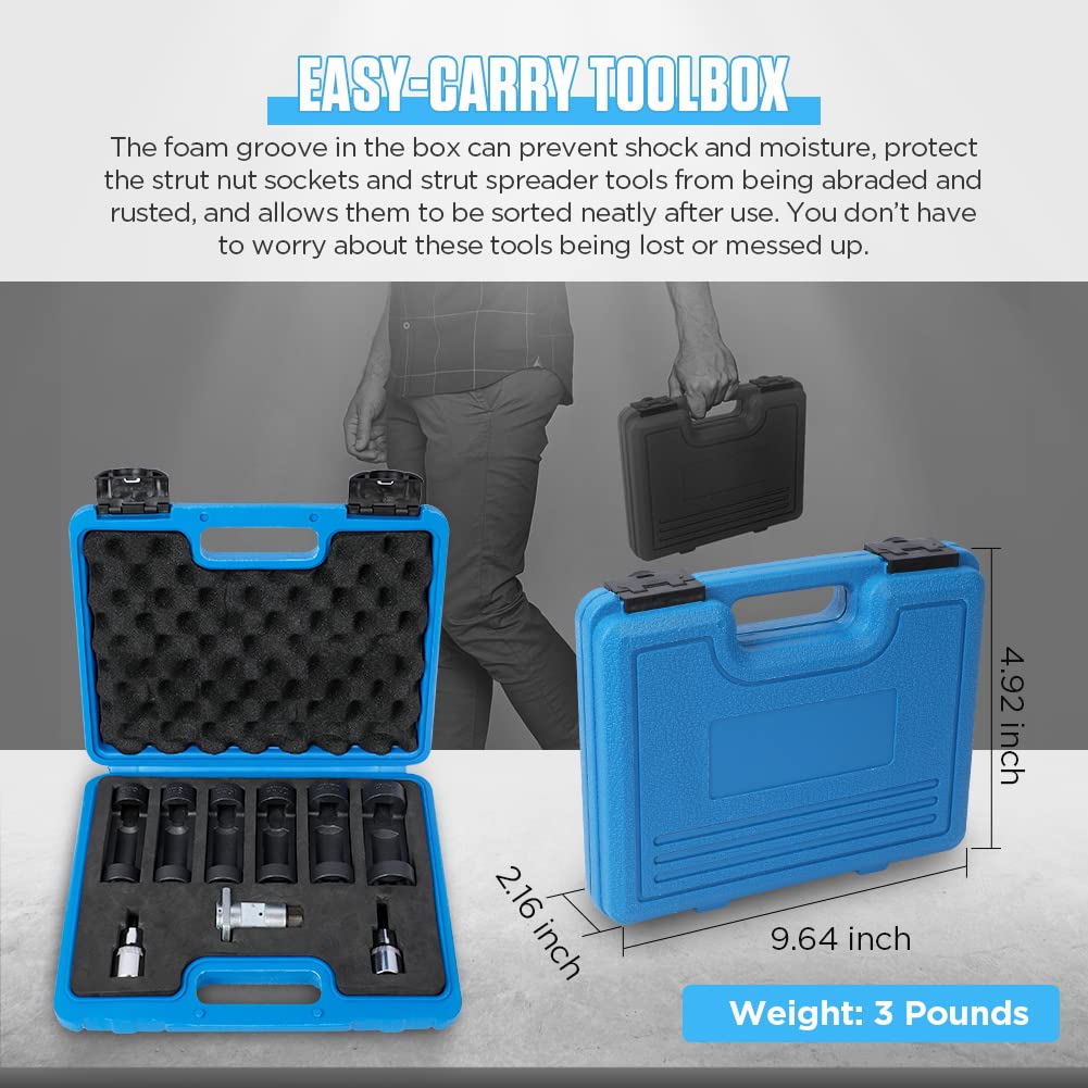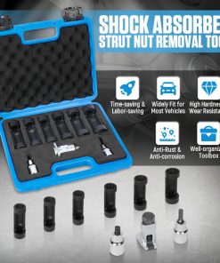 1. Herramienta profesional de extracción de tuerca de amortiguador El juego de llave de tuerca de amortiguador está diseñado para atornillar o desatornillar tuercas de suspensión, quitar y reemplazar tuercas de amortiguador. Al quitar los amortiguadores, usar el enchufe de expansor de suspensión hace que quitar y reemplazar la unidad de amortiguador en el eje delantero sea más fácil, y es muy fácil de sacarla de la posición expandida. Este juego de enchufe de amortiguador es ampliamente aplicable a la mayoría de los vehículos. Por favor, verifique dos veces si la forma y tamaño de la tuerca del amortiguador de su automóvil coinciden con nuestros enchufes antes de comprar.