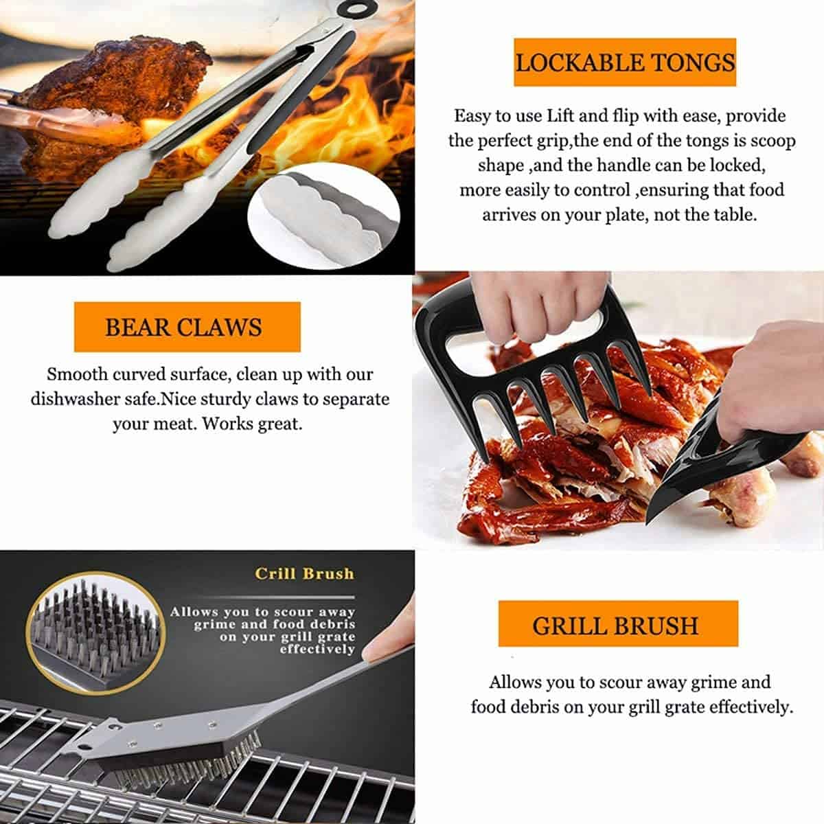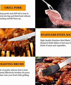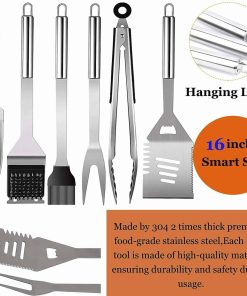 Nuestros sets de asar MUJUZE están hechos de acero inoxidable de grado alimenticio. El set de utilidades para asar es resistente, duradero y de larga duración. No tendrá que preocuparse por doblarse, romperse o oxidarse nuevamente. Los mangos alargados cómodos lo mantienen alejado del calor con un diseño de lazos para colgar que permite colgarlos fácilmente de los ganchos de su parrilla o estante para parrilla. Aptos para lavavajillas para una limpieza rápida y fácil. Definitivamente disfrutará usándolos tanto para cocinar en la cocina como en cocinas al aire libre. Cada pieza de nuestros utensilios para asar viene en una bolsa con cremallera duradera con un soporte para cada herramienta, que hace que esté muy organizado y la bolsa de transporte es ligera para llevar. La práctica bolsa con cremallera hace que sea súper conveniente llevar los artículos a donde los necesita si planea asar en un evento familiar en el parque, acampar o en el patio trasero. Tamaño perfecto para picnic y este set es extremadamente conveniente para almacenamiento y transporte. Regalos para asar para hombres: El set de utensilios para asar es un gran regalo para papá, esposo, hermano o cualquier persona que ame asar. Este set de regalo para asar está especialmente diseñado para los hombres asadores, cada herramienta está diseñada para mejorar sus habilidades en la parrilla y crear una deliciosa barbacoa. Regalo ideal para su familia y amigos a quienes les encanta asar para cumpleaños, aniversario, Día del Padre, Navidad, San Valentín y cualquier otra fecha especial. Servicio satisfactorio: Su set de accesorios básicos para asar ideal. Sin riesgos al elegir nuestro set profesional de herramientas para barbacoa. Ofreceremos el mejor servicio al cliente y experiencia de compra para cada uno de nuestros clientes y garantía de devolución de dinero para cualquier pedido insatisfecho. ¡Si tiene alguna pregunta, obtenga servicios de la marca!
