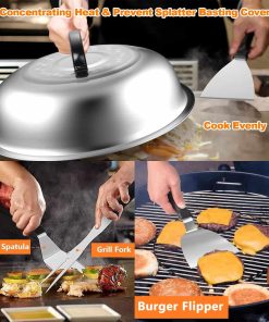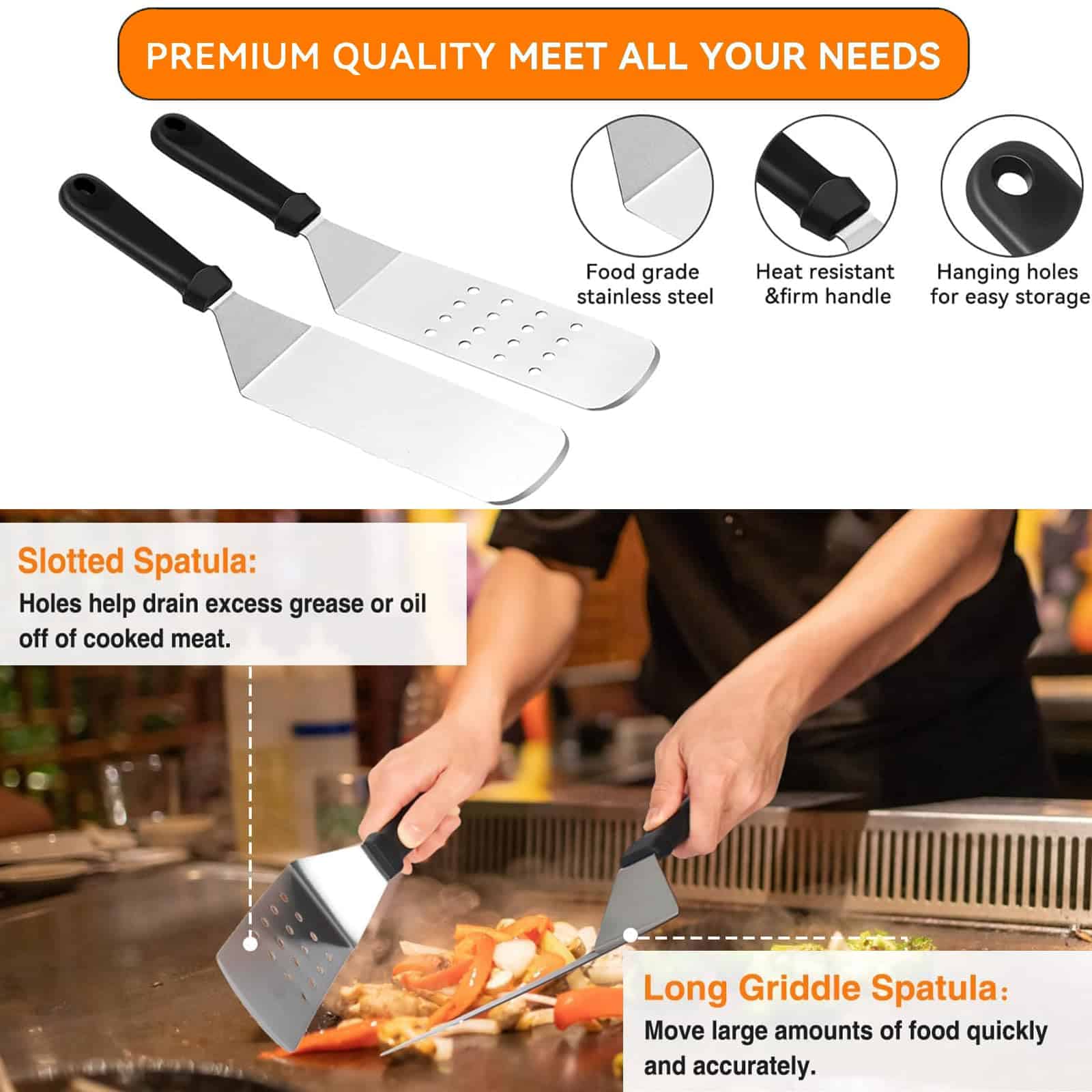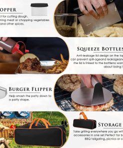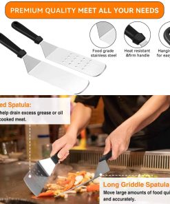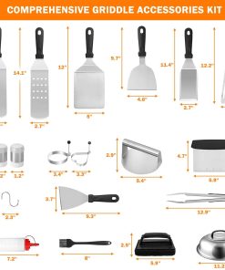 Este juego de accesorios para parrilla está fabricado con acero inoxidable de alta calidad que es a prueba de óxido, duradero y duradero. Cada pieza de los utensilios de cocina es lo suficientemente resistente para soportar el estrés de cualquier cocina comercial ocupada sin deformarse o romperse. Por lo tanto, puedes disfrutar fácilmente de tu parrilla, camping o cocina sin preocuparte de que tus herramientas se doblen, se rompan o se oxiden. Este juego de herramientas para parrilla con rascador de parrilla, espátulas y botellas de aceite te ayuda a asar tan fácilmente como un chef de restaurante. Ideal para voltear hamburguesas, panqueques, verduras, cortar pan, carne y salchichas, un rascador y picadora para cortar alimentos y limpiar las parrillas. La espátula larga para parrilla puede mover grandes cantidades de comida de manera rápida y precisa. Anillos para huevos y espolvoreadores de pimienta para mejorar tu experiencia culinaria en la parrilla. Cada herramienta de parrilla es fácil de limpiar con agua caliente y limpiador, también es apta para lavavajillas. Recuerda secar cada herramienta antes de guardarla. Fácil de almacenar con la bolsa de almacenamiento para mantener todos tus utensilios de parrilla organizados y ordenados. También es conveniente de llevar para picnics, campamentos o Barbacoa en el patio trasero. Este juego de accesorios para parrilla teppanyaki completo y versátil incluye todo lo que necesitas para crear el festín perfecto al aire libre y satisfará todas tus necesidades en la parrilla plana. Un regalo ideal para cualquier chef profesional o novato, amante de la parrilla, maestro de la parrilla. Perfecto para Cumpleaños, Aniversario, Día del Padre, Navidad y cualquier otra celebración especial.