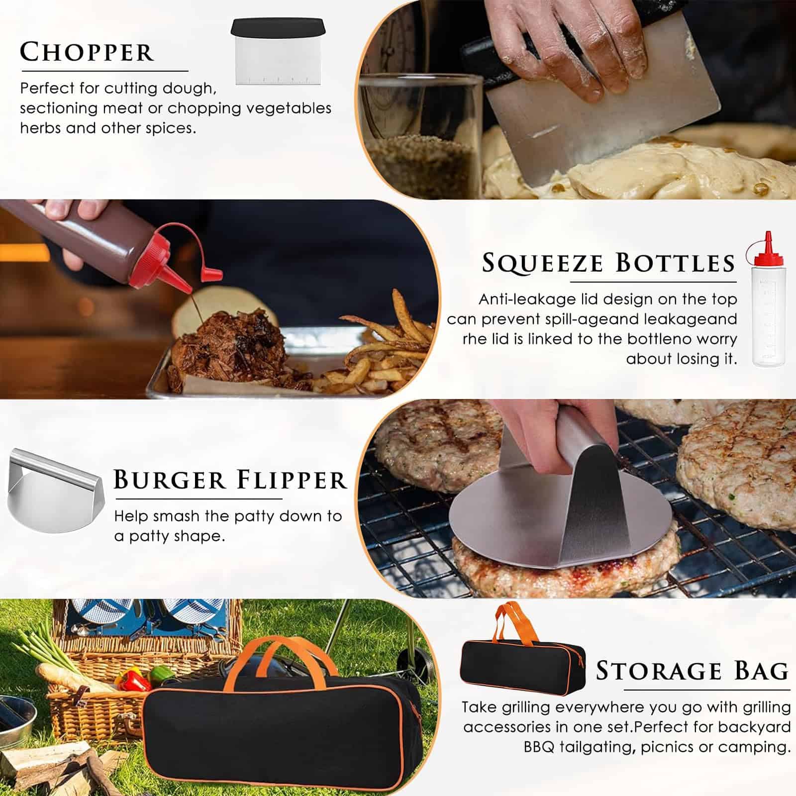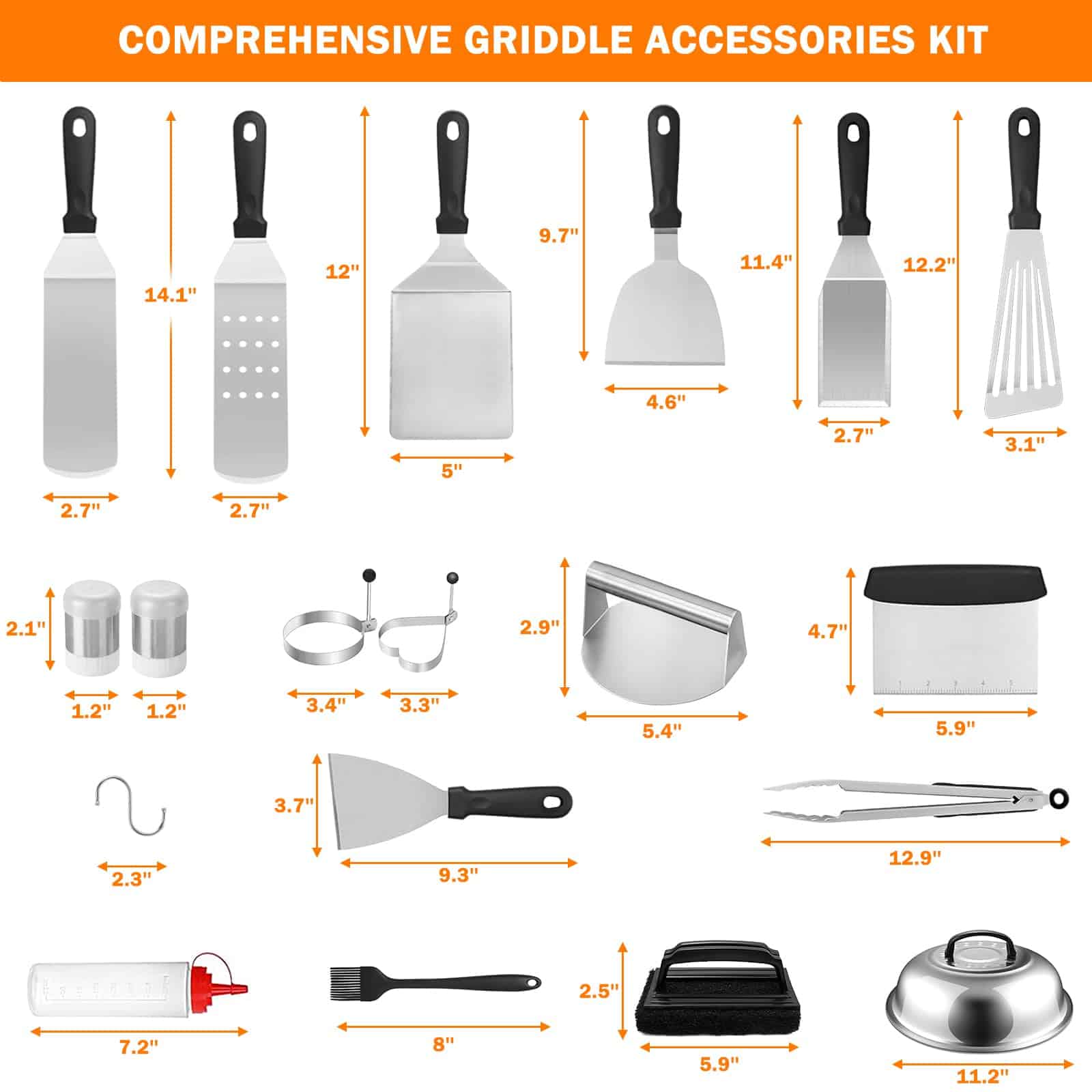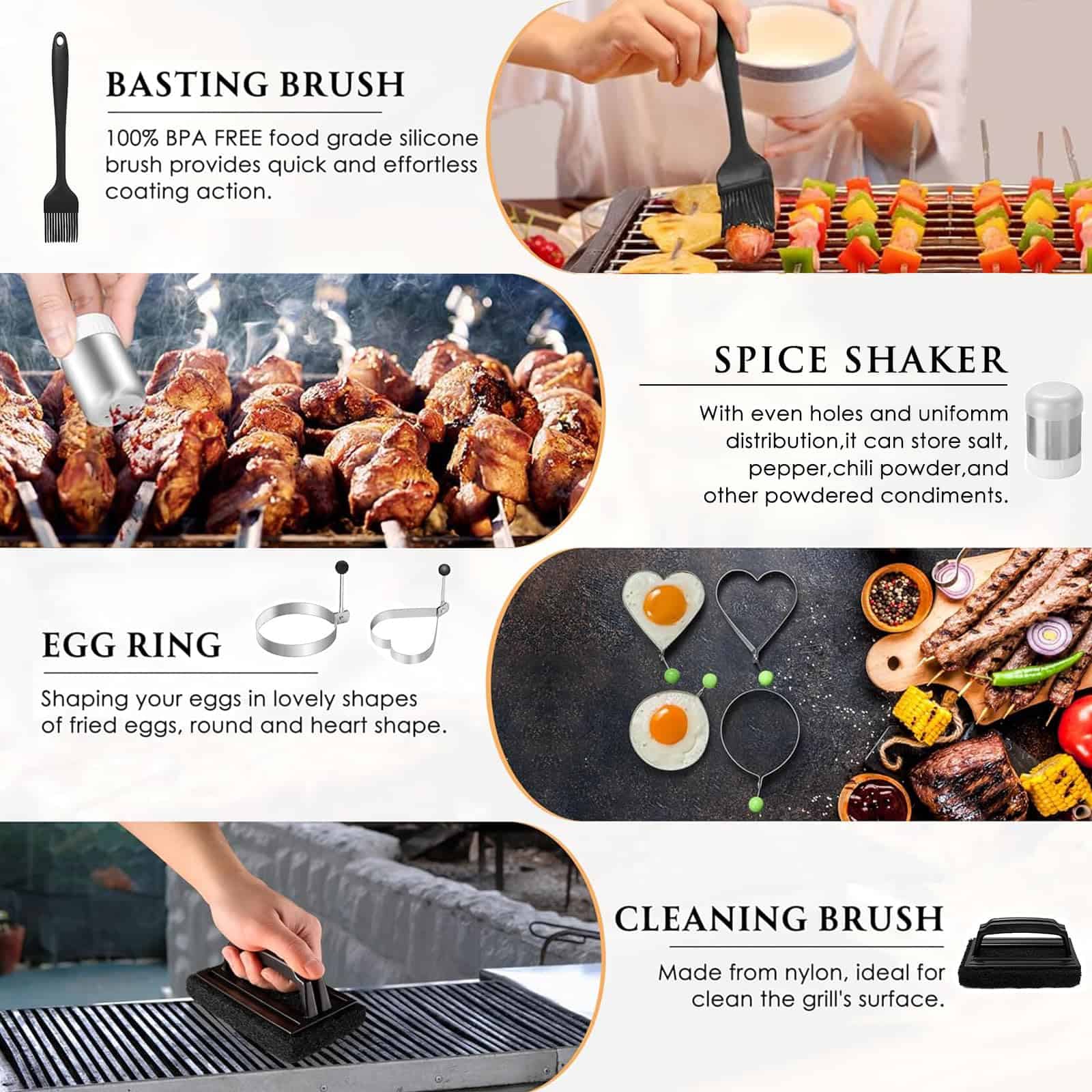 1. ¡PERFECTO JUEGO DE ACCESORIOS PARA PARRILLA PLANA DE 34 PIEZAS! Incluye: 1 parrilla grande para hamburguesas, 1 espátula pequeña, 1 espátula ranurada grande, 1 espátula ranurada larga, 1 pala para parrilla, 1 volteador ranurado, 1 prensa para parrilla, 1 pinza, 1 pincel, 1 picadora, 2 espolvoreadores de especias, 2 botellas exprimidoras, 4 anillos para huevos, 1 cepillo de limpieza, 10 ganchos, 1 bolsa de almacenamiento, 1 caja de regalo, 2 tapas para salsear.