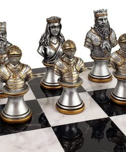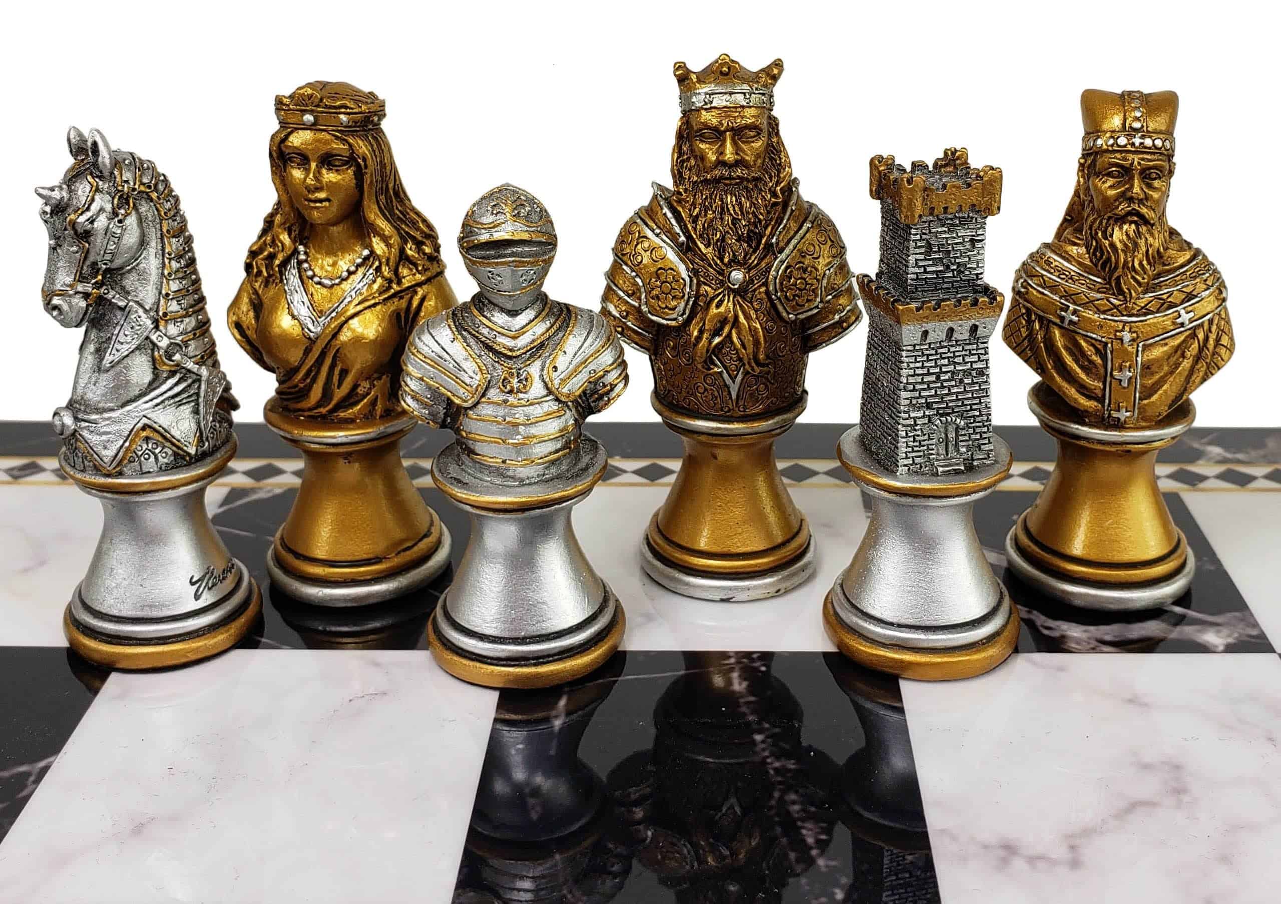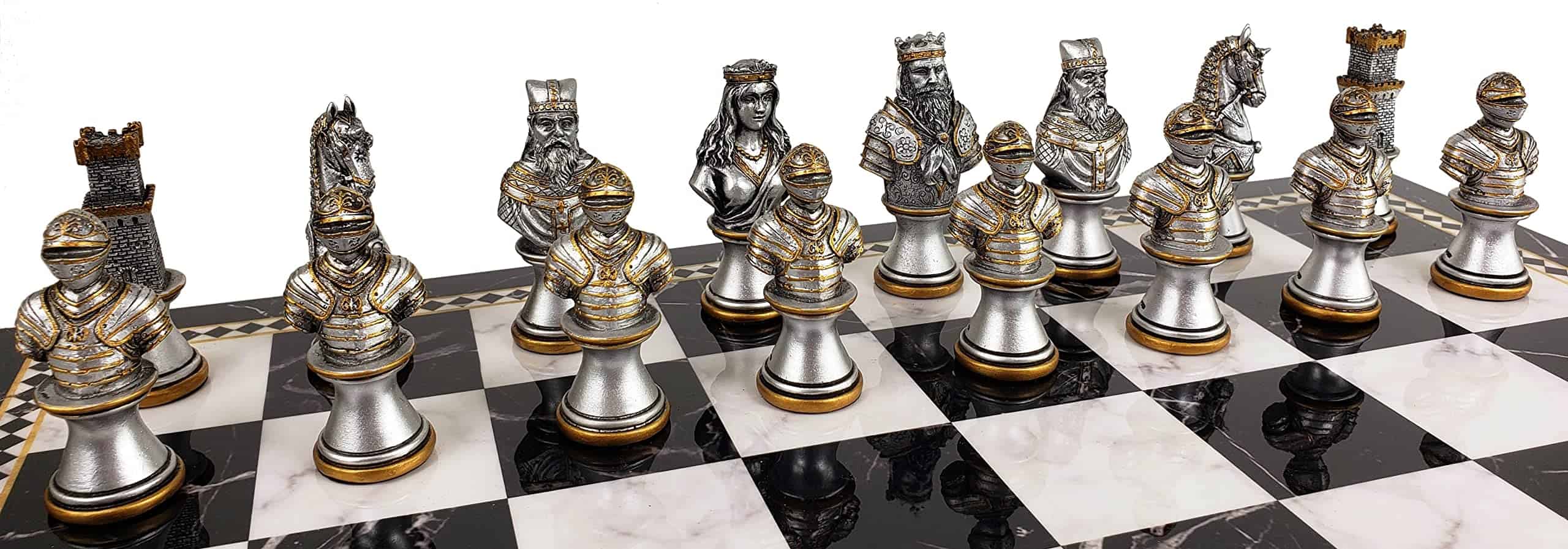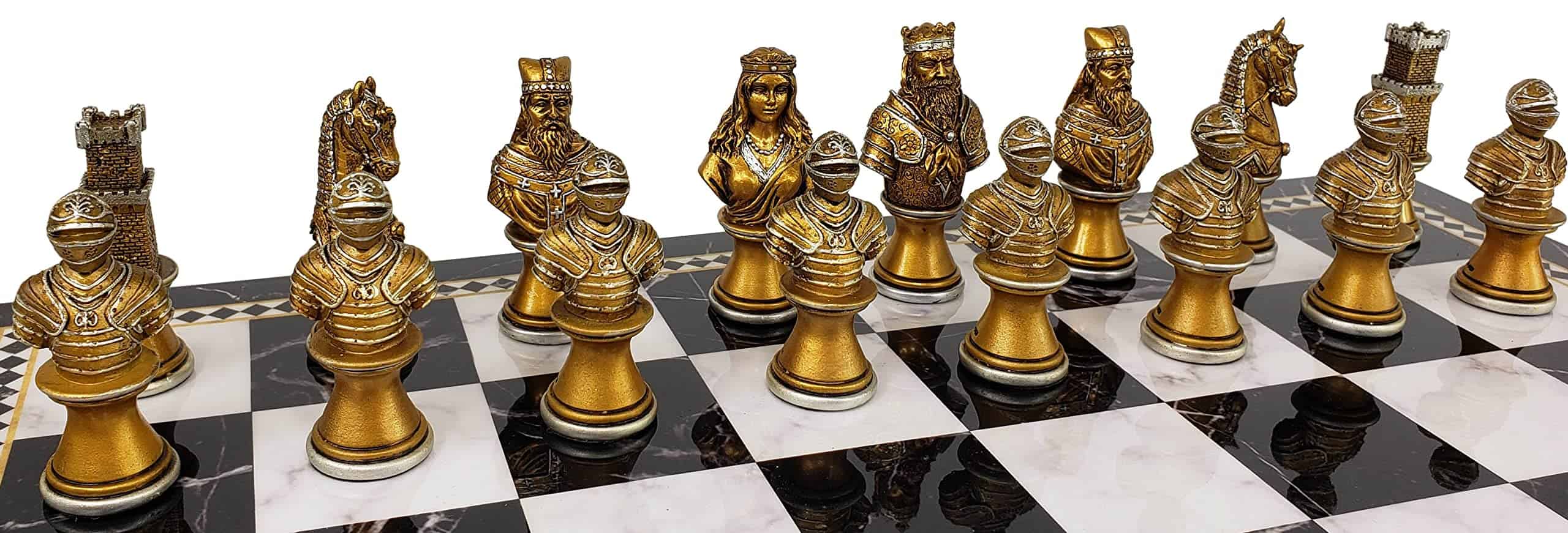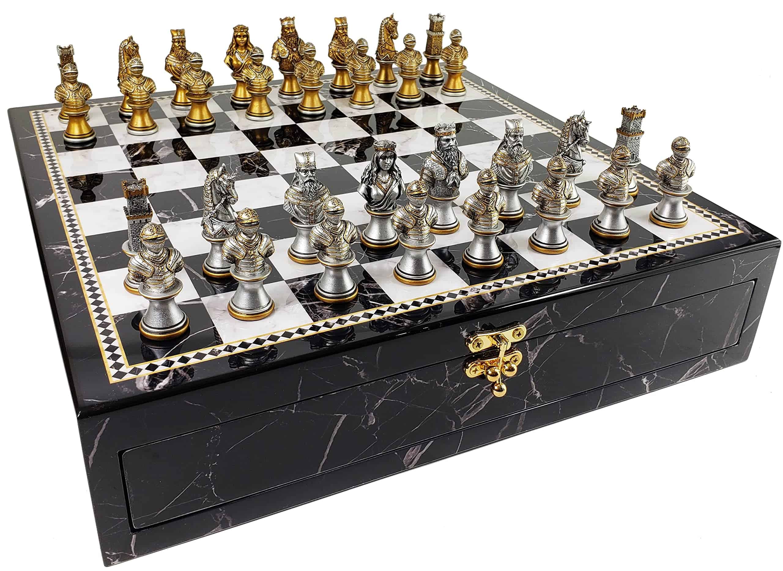 Los hombres son de resina sólida, pintados a mano y tienen base de fieltro. El tablero presenta un hermoso laminado artificial brillante sobre madera mdf. La parte inferior del tablero está completamente forrada de fieltro. Tamaño del tablero: 17 1/4″ x 17 1/4″ x 3 1/2″ – Superficie de juego: 15″ x 15″ con cuadrados de 1 7/8″. Cada lado tiene su propio cajón. – Peso del tablero: 11 libras (sin paquete) – Rey: 3″ de alto con un ancho de hombro de 1.5″ – Reina: 2 3/4″ – Alfil: 2 5/8″ – Caballo: 2 5/8″ – Torre: 2 1/2″ – Peón: 2 3/8″ – Diámetro de base – 1″ – Peso total de pieza: – 1 libra 10 onzas (sin paquete) – Los pesos variarán ligeramente con cada juego.