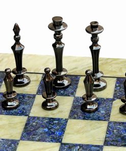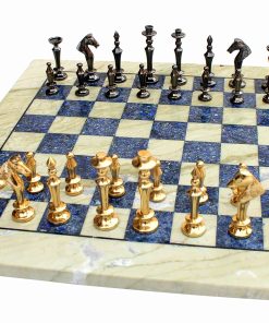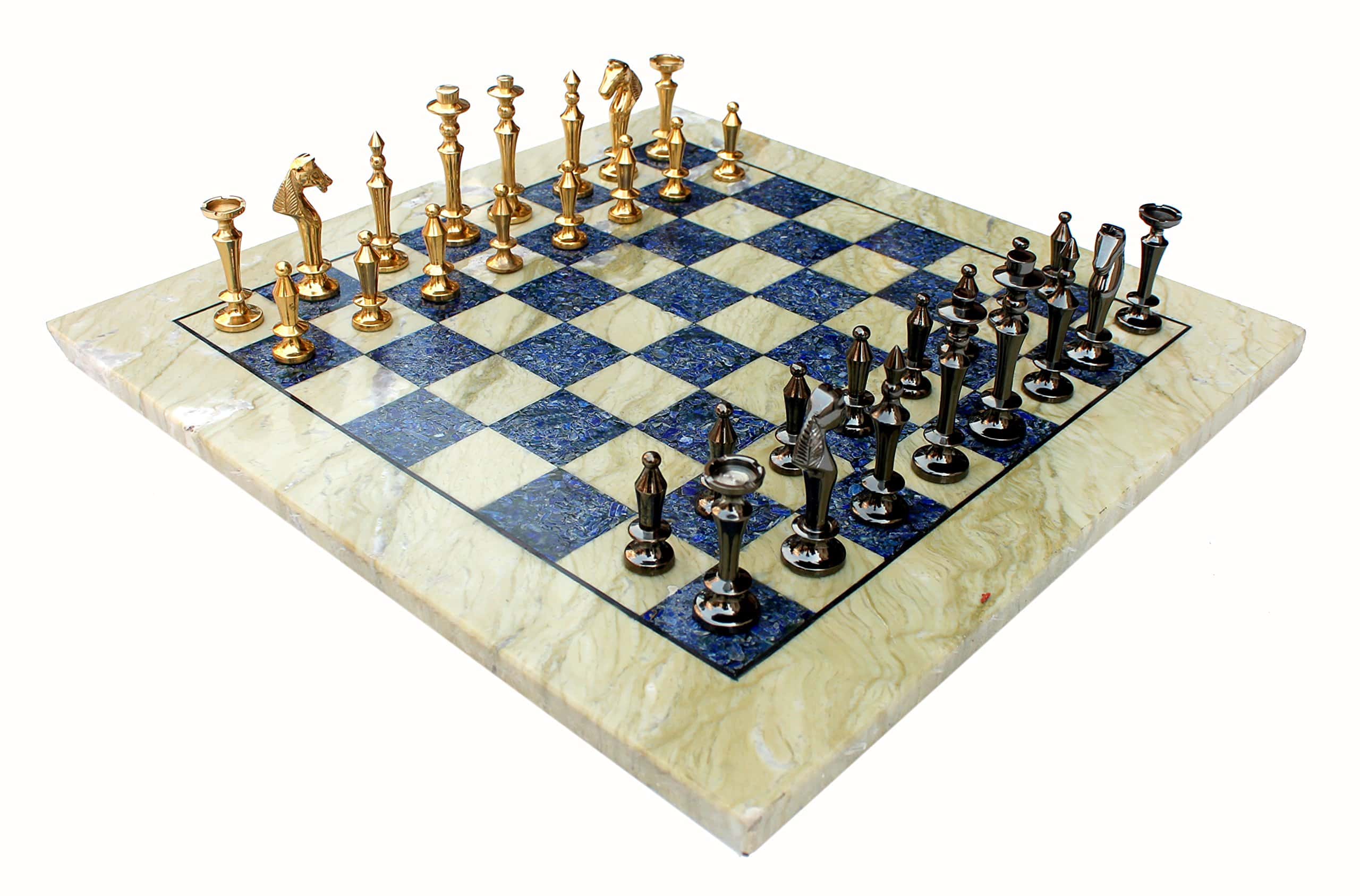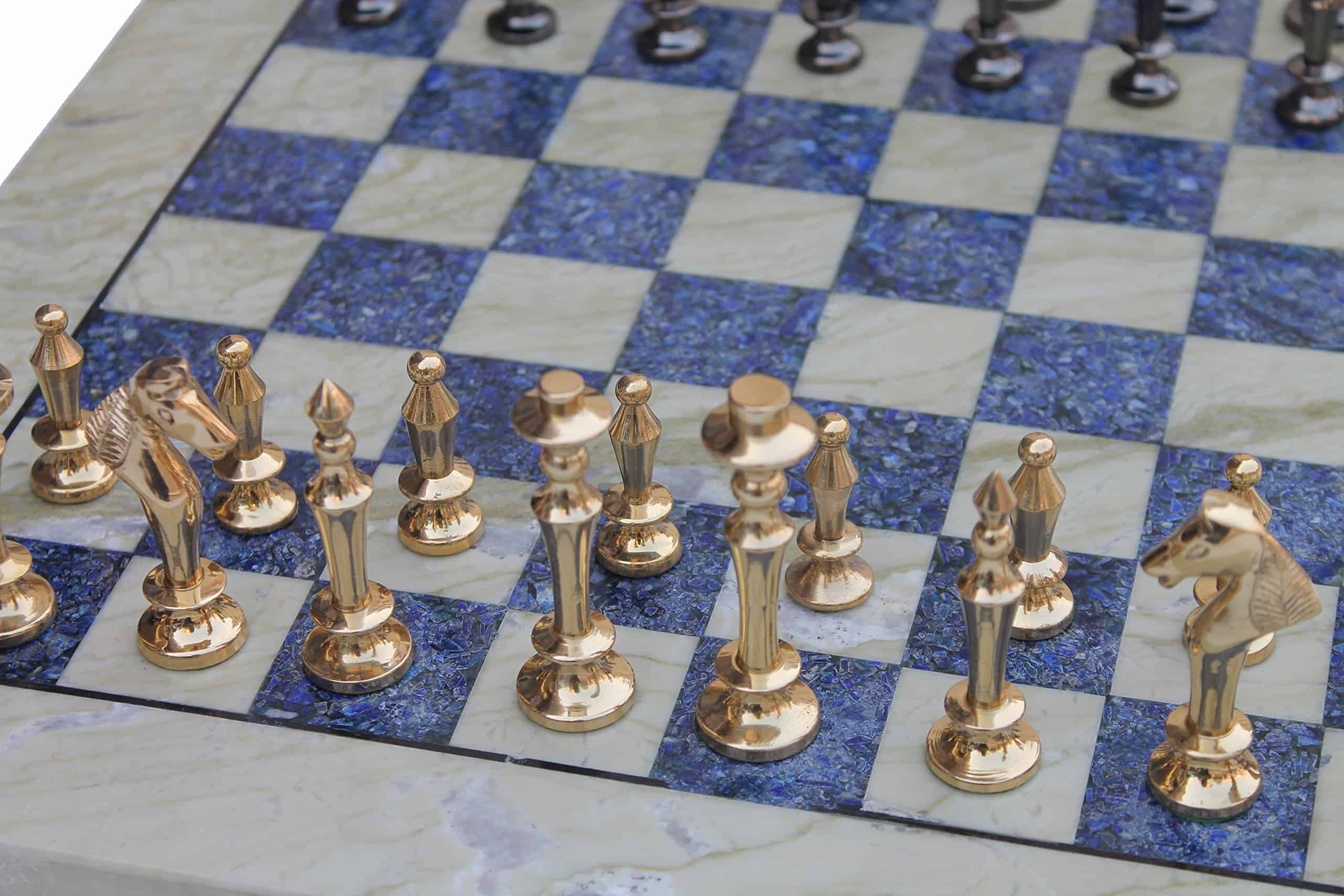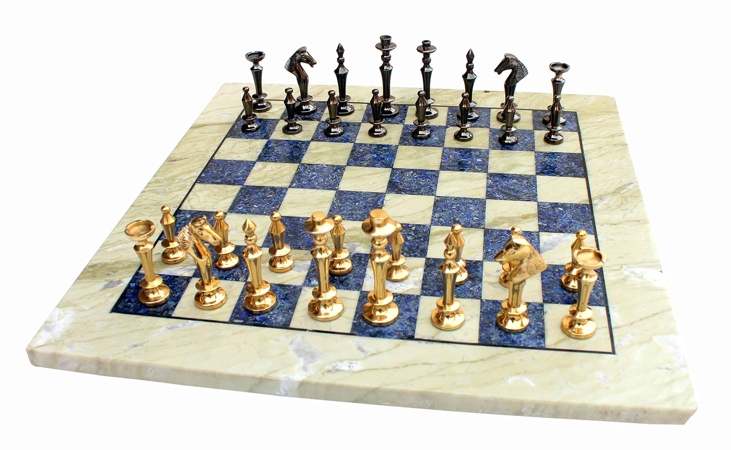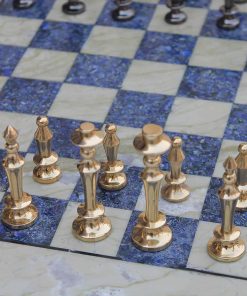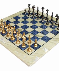 Este juego de ajedrez es un diseño único elaborado por nosotros y no disponible en ningún otro lugar. La pieza exclusivamente diseñada es nuestra invención creativa utilizando piezas de piedra semipreciosa de Lapislázuli rellenas de resina epoxi en los cuadrados alternos sobre piedra de mármol blanco australiano, consulte las fotos. Tablero de ajedrez bellamente elaborado para su sala de estar. Los peones están hechos de latón y han sido tallados individualmente. Las piezas de ajedrez están pintadas de amarillo y negro a la perfección para lograr un aspecto y sensación regios. Las dimensiones externas del tablero de ajedrez son de aproximadamente 15″ x 15″ y el rey mide casi 2.75″ de alto. El tamaño interno del cuadrado es de aproximadamente 1.5 pulgadas. Todas las piezas de ajedrez están talladas a mano y tienen un peso aproximado de 1.5 kgs.