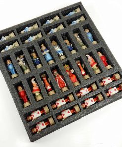 Este listado es para un nuevo juego de 32 piezas de hombres de ajedrez pintados a mano con tablero. Los hombres son de resina sólida, pintados a mano y tienen bases de fieltro. Los hombres vienen en una caja decorativa con almacenamiento de espuma. El tablero cuenta con una superficie de juego de chapa de madera genuina sobre madera de mdf. Rey: 3 1/8″. Reina: 3 1/16″. Alfil: 2 7/8″. Caballo: 2 5/8″. Torre: 2 9/16″. Peón: 2 9/16″. Diámetro de la base – 1″. Peso total de las piezas: – 1 libra 10 onzas. Tamaño del tablero: 17 1/2″ x 17 1/2″ x 3 1/2″, Superficie de juego: 12 1/2″ x 12 1/2″, Cuadros de juego: 1 9/16″.