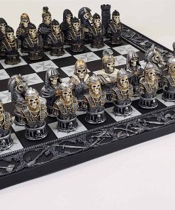 El tablero es de resina sólida y pintado a mano. La parte inferior del tablero está completamente forrada de fieltro. 17″ x 17″ x 1/2″ de grosor. Superficie de juego: 13 1/4″ x 13 1/4″. Cuadros de juego: 1 5/8″. Peso: 7 Libras. Rey: 3 1/8″ de altura | Ancho del hombro 1 11/16″ | 2 onzas. Reina: 2 7/8″. Alfil: 2 3/4″. Caballo: 2 5/8″. Torre: 2 5/8″. Peón: 2 5/8″. Diámetro de la base – 1 1/8″. Peso total de las piezas: – 2 Libras 13 oz. Las piezas vienen en una caja decorativa con almacenamiento de espuma.