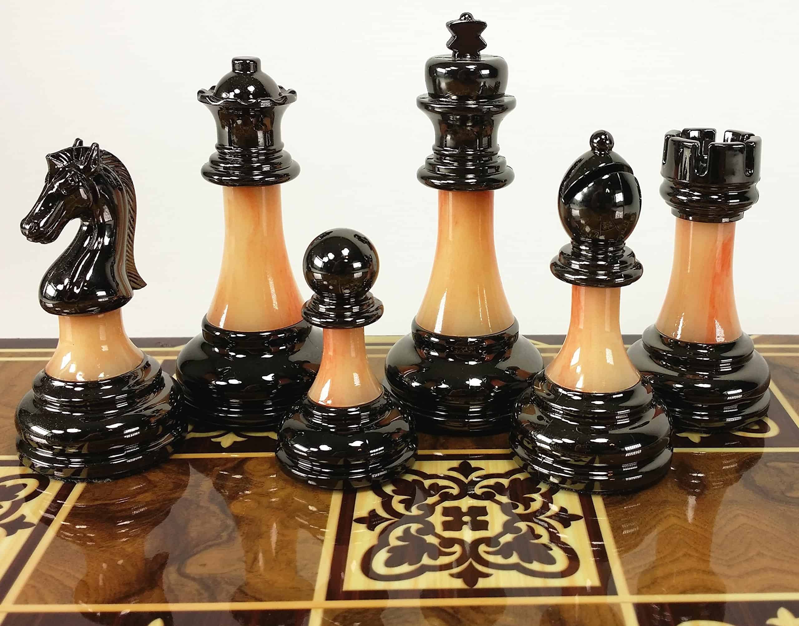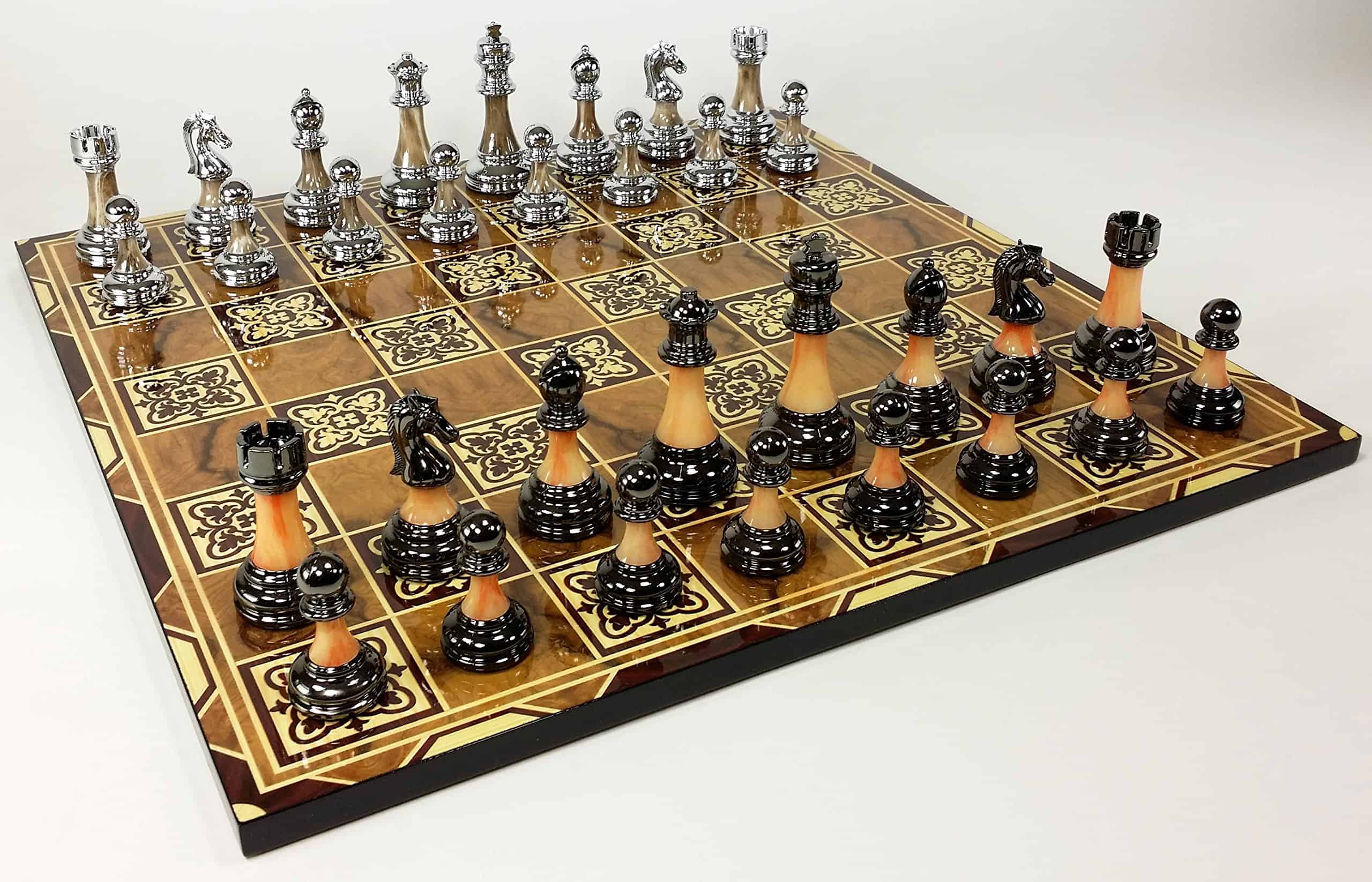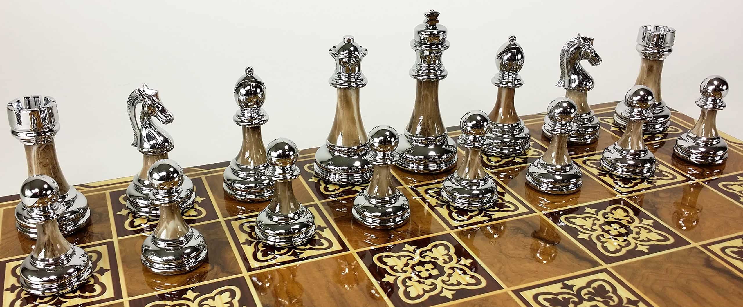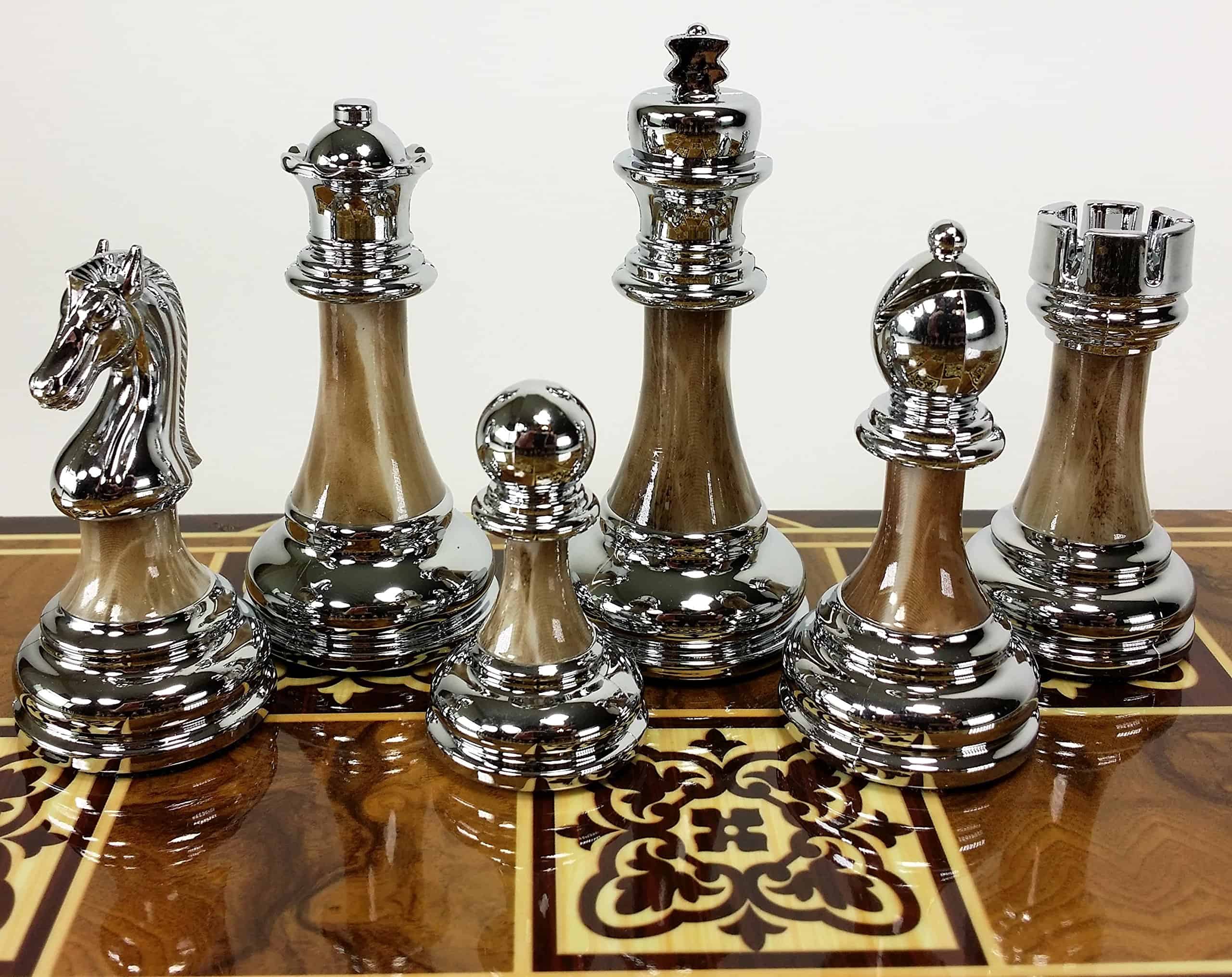 No te pierdas estos hombres de ajedrez de plástico cromados Staunton y cromados negros con tablero. Los hombres están doblemente pesados y tienen bases acolchadas de cuero sintético. El tablero presenta un hermoso laminado de color artificial de nogal burl con brillo alto sobre madera mdf. ¡Conjunto de gran apariencia!