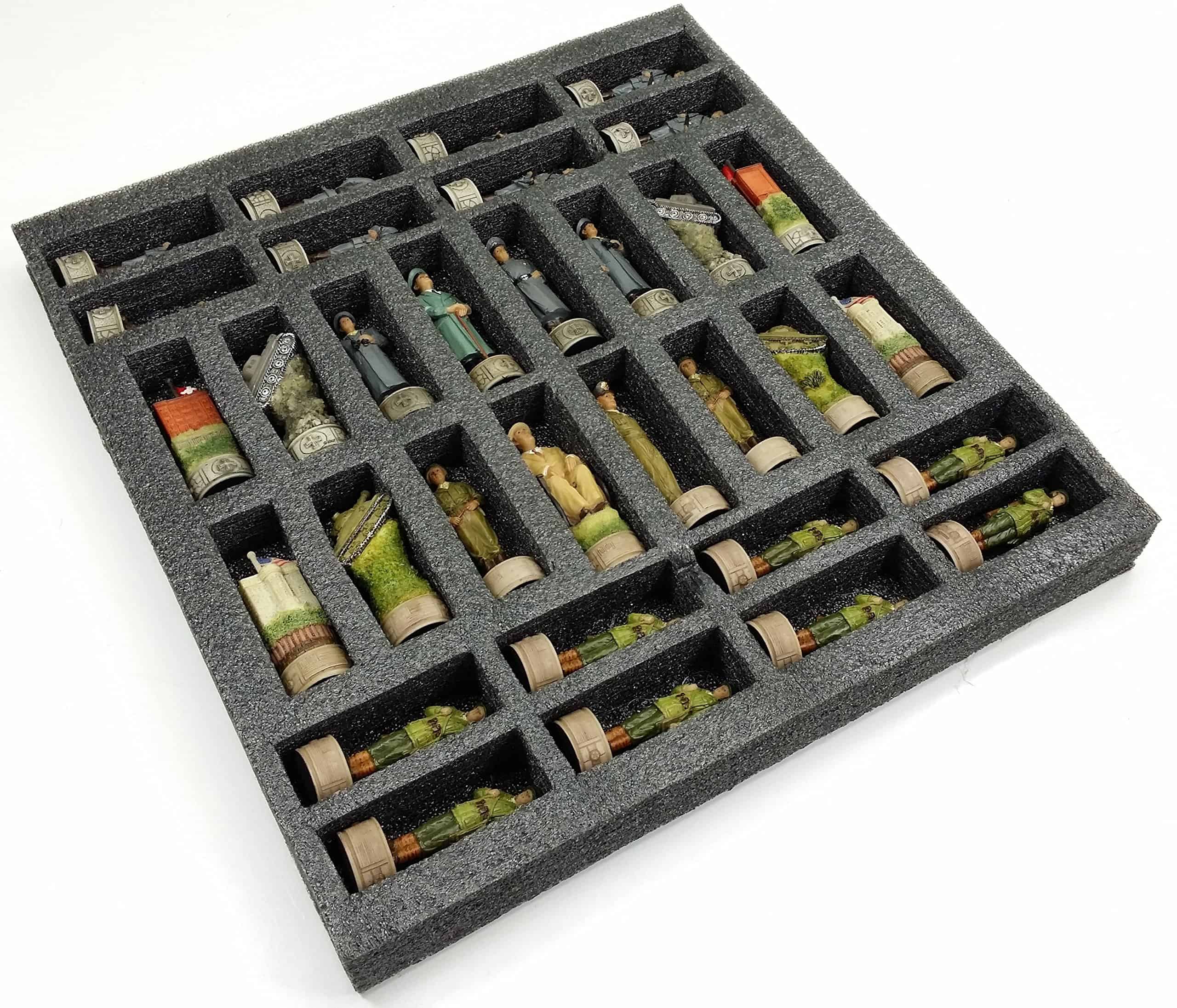 Esta publicación es para un nuevo juego de ajedrez pintado a mano. Los hombres son de resina sólida, pintados a mano y tienen fondos de fieltro. El tablero cuenta con una lámina artificial sobre un núcleo de madera MDF. Dimensiones del tablero: Tablero: 17 1/4″ x 1/2″ x 17 1/4″ x 1/2″, Superficie de juego: 15″ x 15″, Cuadros de juego: 1 7/8″. – Rey: 3 1/4″ – Reina: 3 1/8″ – Alfil: 2 7/8″ – Caballo: 2 3/4″ – Torre: 2 3/4″ – Peón: 2 5/8″ – Diámetro de la base – 1″ – Peso total de la pieza: – 1.75 libras – Caja decorativa con almacenamiento de espuma incluido.