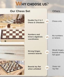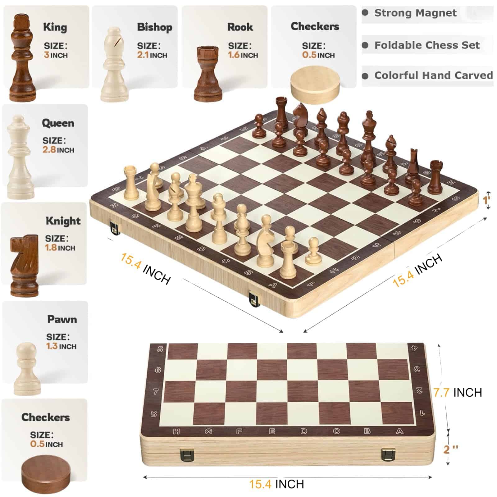 1. Materiales de calidad premium: Fabricado en madera de pino de alta calidad y con un acabado resistente a los arañazos, nuestro juego de ajedrez y damas magnético emana durabilidad y elegancia, garantizando disfrute duradero. Este set portátil y ligero es perfecto para jugar sobre la marcha, ya sea relajándote en casa, viajando o disfrutando de actividades al aire libre. Ideal para reuniones familiares, picnics y viajes por carretera.