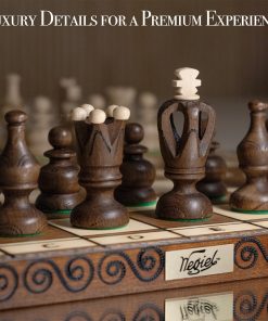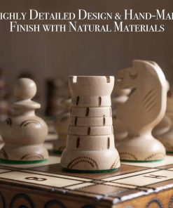 Hecho a mano en Polonia con madera cultivada en granjas, ofrece la mezcla perfecta de estrategia, estilo y practicidad para cualquier entusiasta del ajedrez.