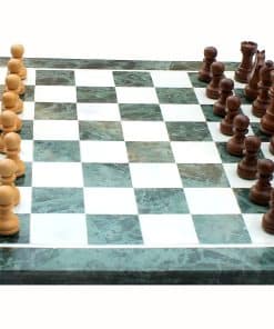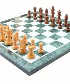 Hermoso tablero de ajedrez hecho a mano para el Gran Maestro que llevas dentro. Este tablero de ajedrez está hecho de mármol verde y blanco. Los cuadros están colocados alternativamente utilizando el método de incrustación similar al utilizado en el Taj Mahal. Las piezas están hechas de madera natural marrón y amarilla y han sido talladas individualmente a mano. Tamaño del tablero de ajedrez 15 «x 15″ externamente, Tamaño interno de los cuadrados en el tablero es de aproximadamente 1.5 pulgadas. El tamaño del Rey es de 3» de altura. Las demás piezas son proporcionales al Rey. Las piezas están bellamente elaboradas en madera natural y tienen un aspecto muy regio. Esta es una piedra natural y el producto real puede tener algunas venas, pequeñas diferencias de color y/o sombra en comparación con la imagen.