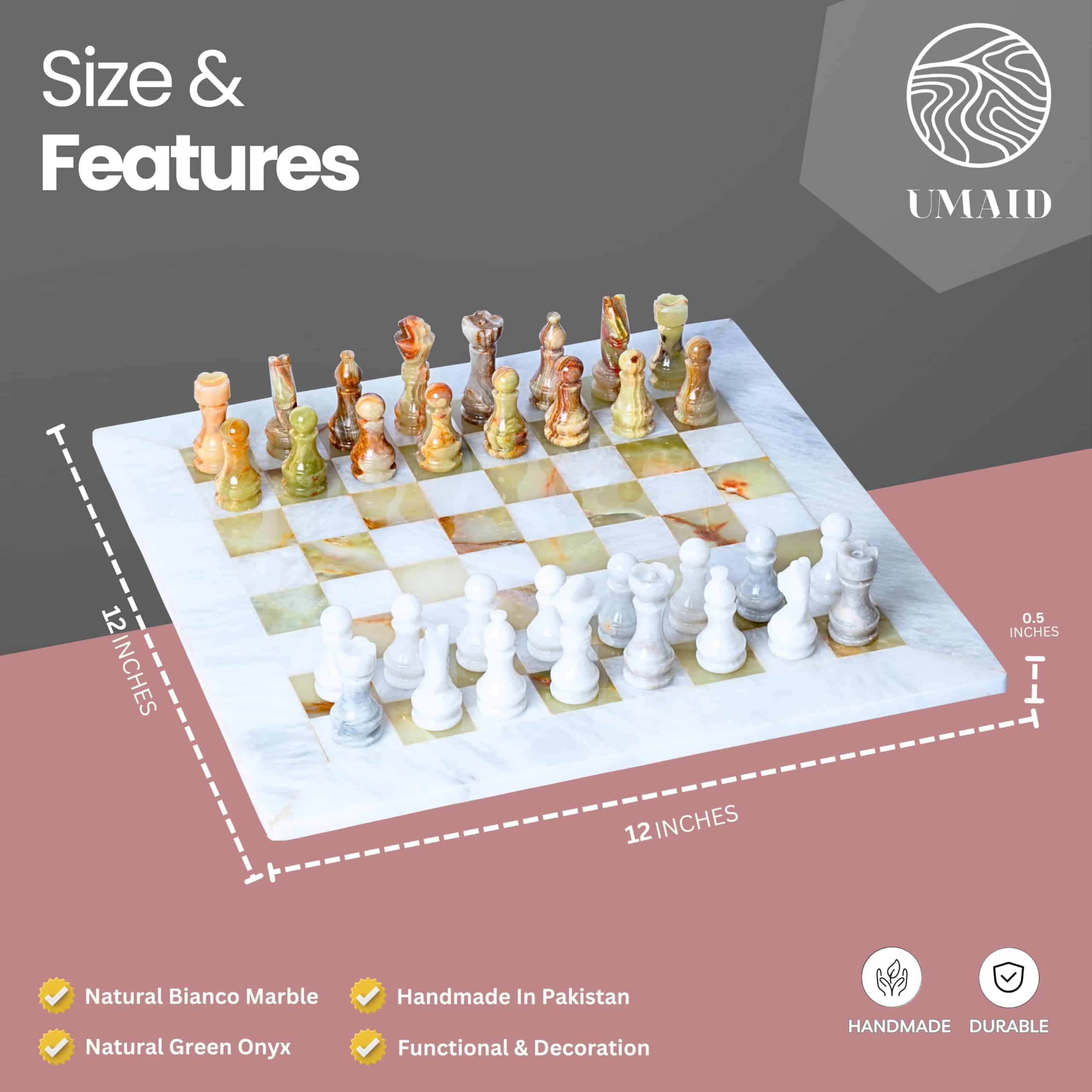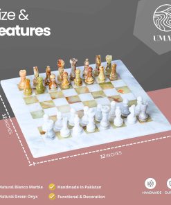 ¿Qué se Incluye?: Tablero de Ajedrez de Mármol: Un tablero de ajedrez de mármol verde onix de 12 pulgadas que sirve como superficie de juego perfecta. Piezas de Ajedrez de Piedra: Un juego completo de piezas de ajedrez de piedra hechas a mano, cada pieza única y detalladamente elaborada. Caja de Almacenamiento de Terciopelo de Lujo: Una caja de almacenamiento de terciopelo premium que proporciona un hogar lujoso para sus piezas de ajedrez cuando no están en uso.