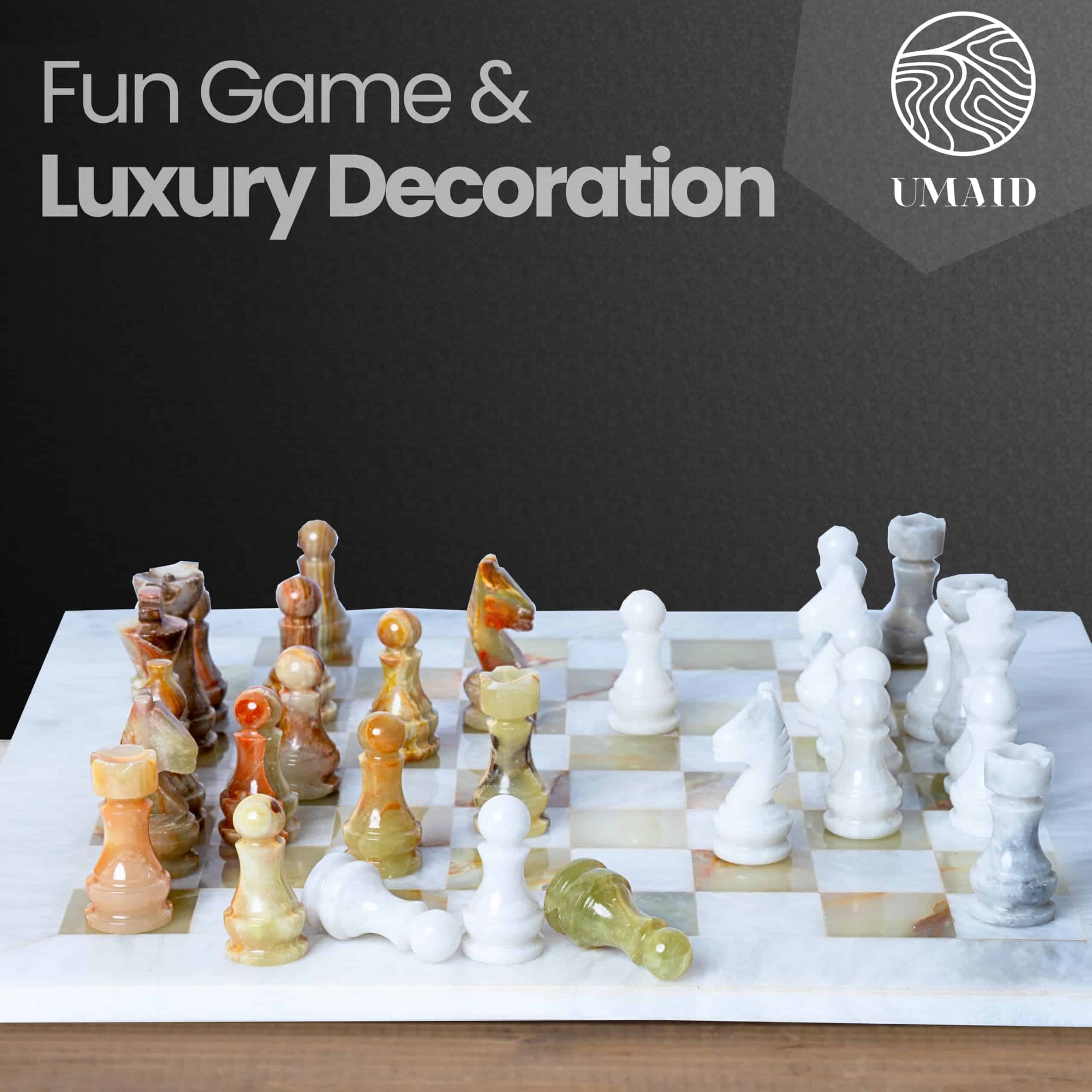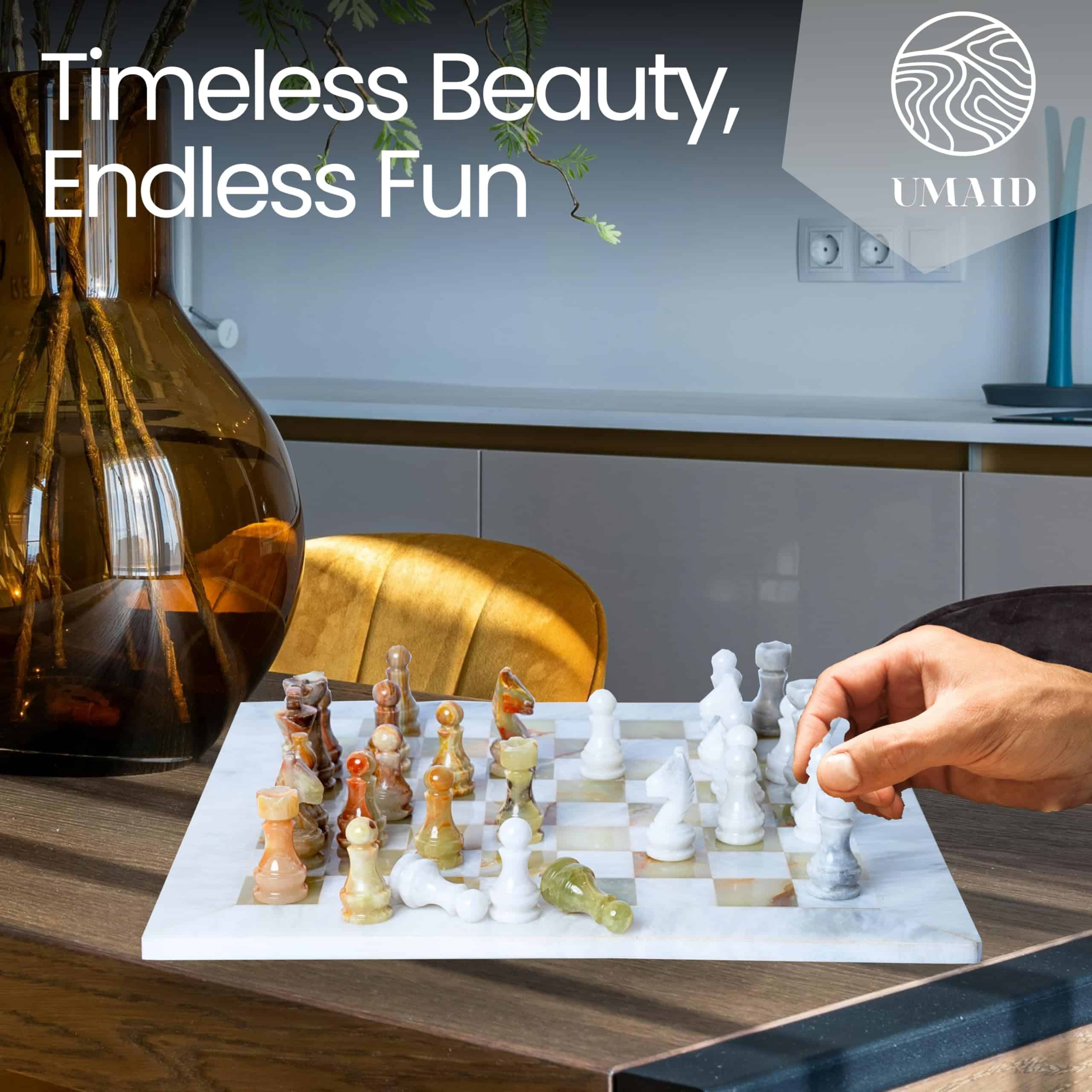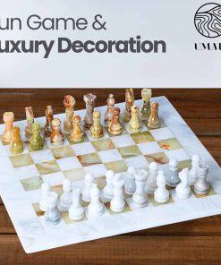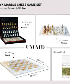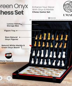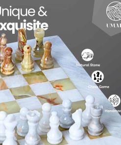 Mejore su colección de ajedrez con el Juego de Ajedrez de Mármol Verde Onix Hecho a Mano de UMAID. Experimente la combinación perfecta de arte y funcionalidad con este elegante juego de ajedrez de piedra. Ordene el suyo hoy y lleve a casa una pieza de belleza atemporal.