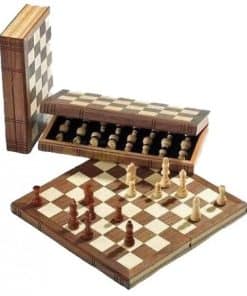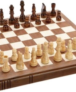 Piezas de ajedrez: Piezas de ajedrez de madera en color natural y marrón, fieltro, diseño Staunton. Material: Álamo Dimensiones (altura | ancho en la parte inferior): Rey: 6,5 cm | 2,1 cm Reina: 5,6 cm | 2,1 cm Torre: 3,8 cm | 2,0 cm Alfil: 4,9 cm | 2,0 cm Caballo: 4,2 cm | 2,0 cm Peón: 3,1 cm | 1,6 cm Tablero de ajedrez plegable Materiales utilizados para el estuche/tablero de ajedrez: incrustaciones de arce y nogal. Dimensión del cuadrado: 3,3 cm