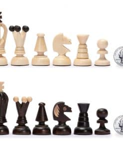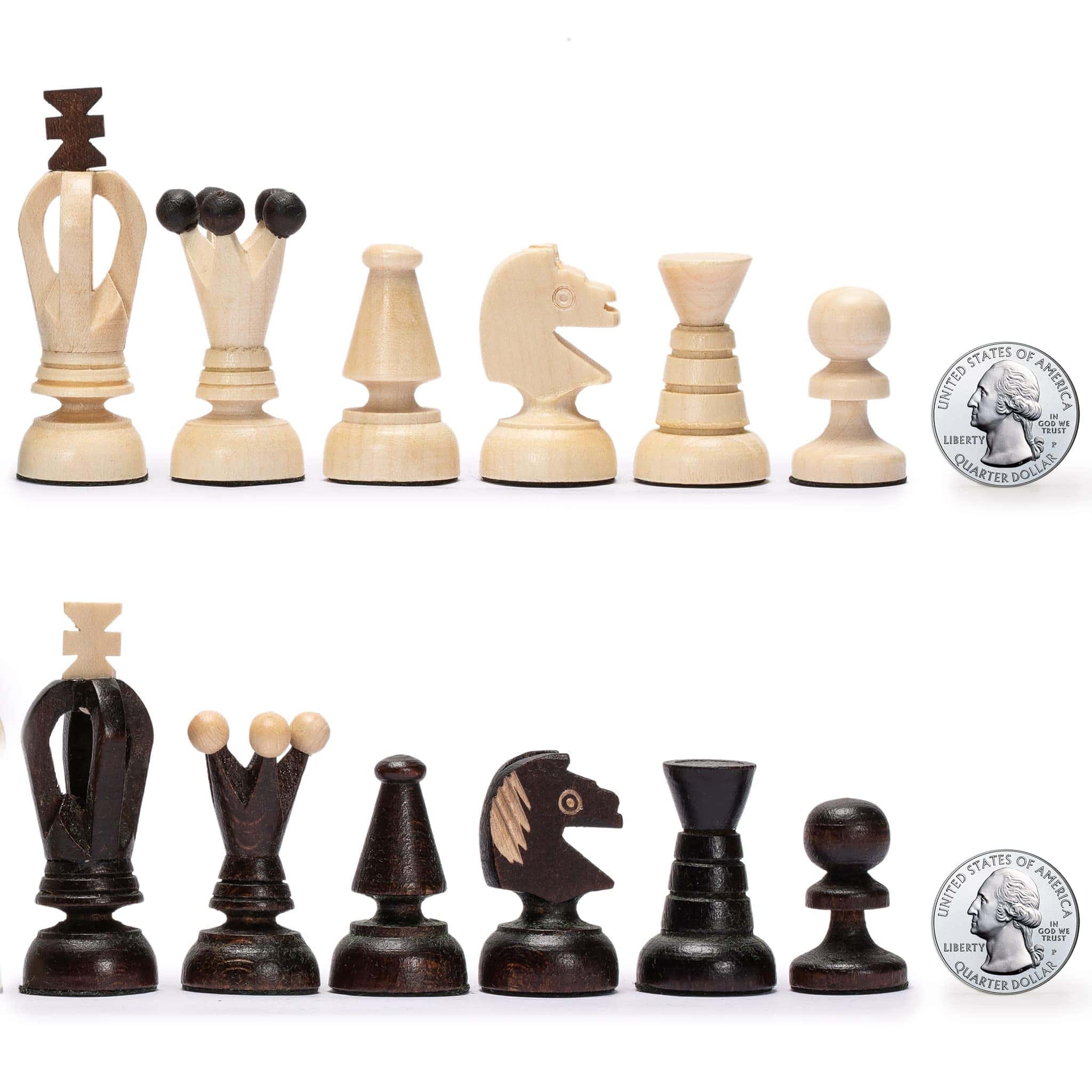1. Piezas de ajedrez de arce tachonado a mano: Hechas de arce resistente, cada pieza de ajedrez está cuidadosamente elaborada; Rey: 2.6 pulgadas (70 milímetros) y pesa 6.46 g; Reina: 2 pulgadas (50 milímetros); Peón: 1.3 pulgadas (32 milímetros); Las piezas de ajedrez están acolchadas en la parte inferior con fieltro para un movimiento silencioso sobre el tablero.
