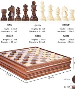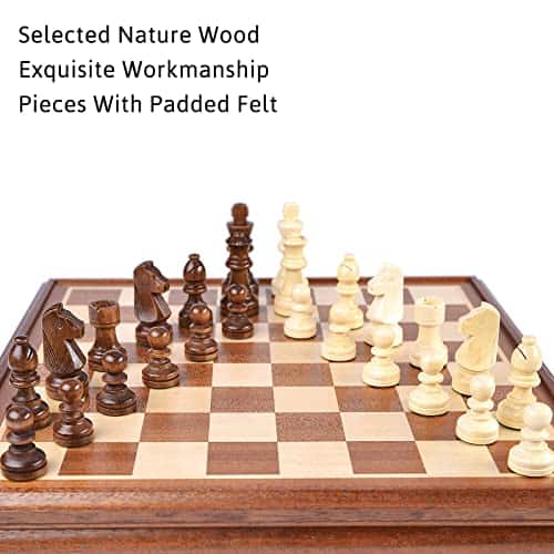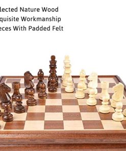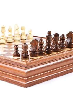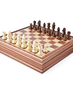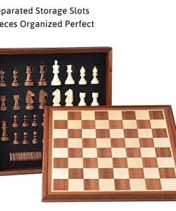 Clásico y elegante: los laterales incrustados añaden un toque de elegancia a un diseño clásico y cuidadosamente pensado. La parte superior del tablero es extraíble de la caja de madera del tablero de ajedrez y diseñada con espuma interior para almacenar cuidadosamente las piezas de ajedrez y damas, apreciarás la capacidad de almacenar tus piezas y mantenerlas protegidas de daños.