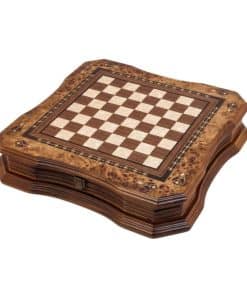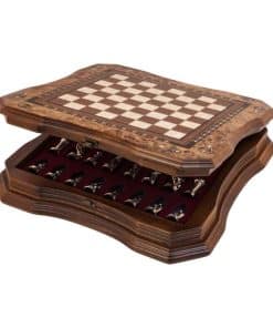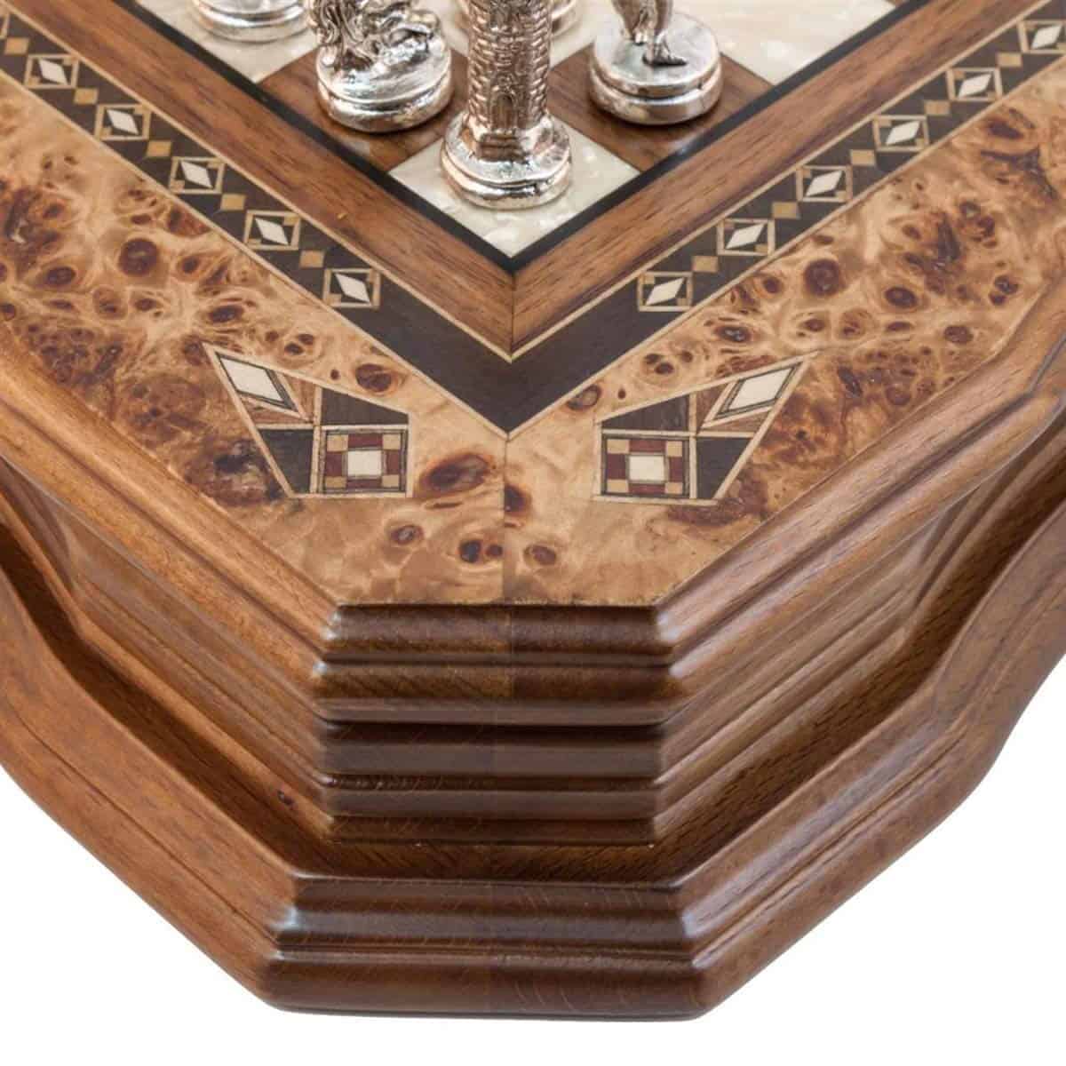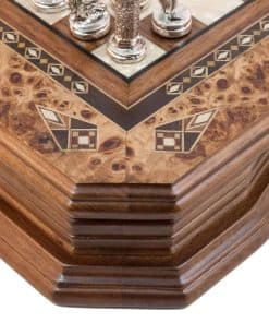 Juego de ajedrez artesanal de madera de lujo. Este ajedrez se produce con madreperla y arte de mosaico de madera. No hay pintura ni algo similar. Todos los colores diferentes provienen de los colores naturales de la madera. Solo hay una capa transparente de barniz final. Tamaño del campo: 27 mm Tamaño del tablero: 39 x 39 x 8 cm Piezas de ajedrez de metal