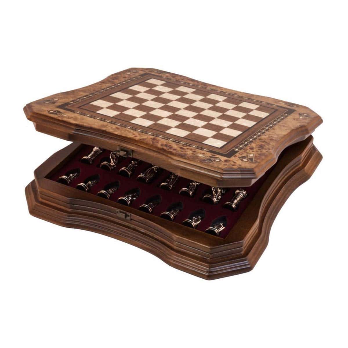 1. Diseño de madera de mosaico artesanal. 2. Piezas de ajedrez de metal. 3. Diseño decorativo: Estuche de madera maciza con mosaico de madera grabado colores naturales. 4. Tablero de ajedrez con tapa: Dimensiones cuadradas: 28 mm Tamaño del producto: 40x40x7 cm. 5. Ideal como regalo