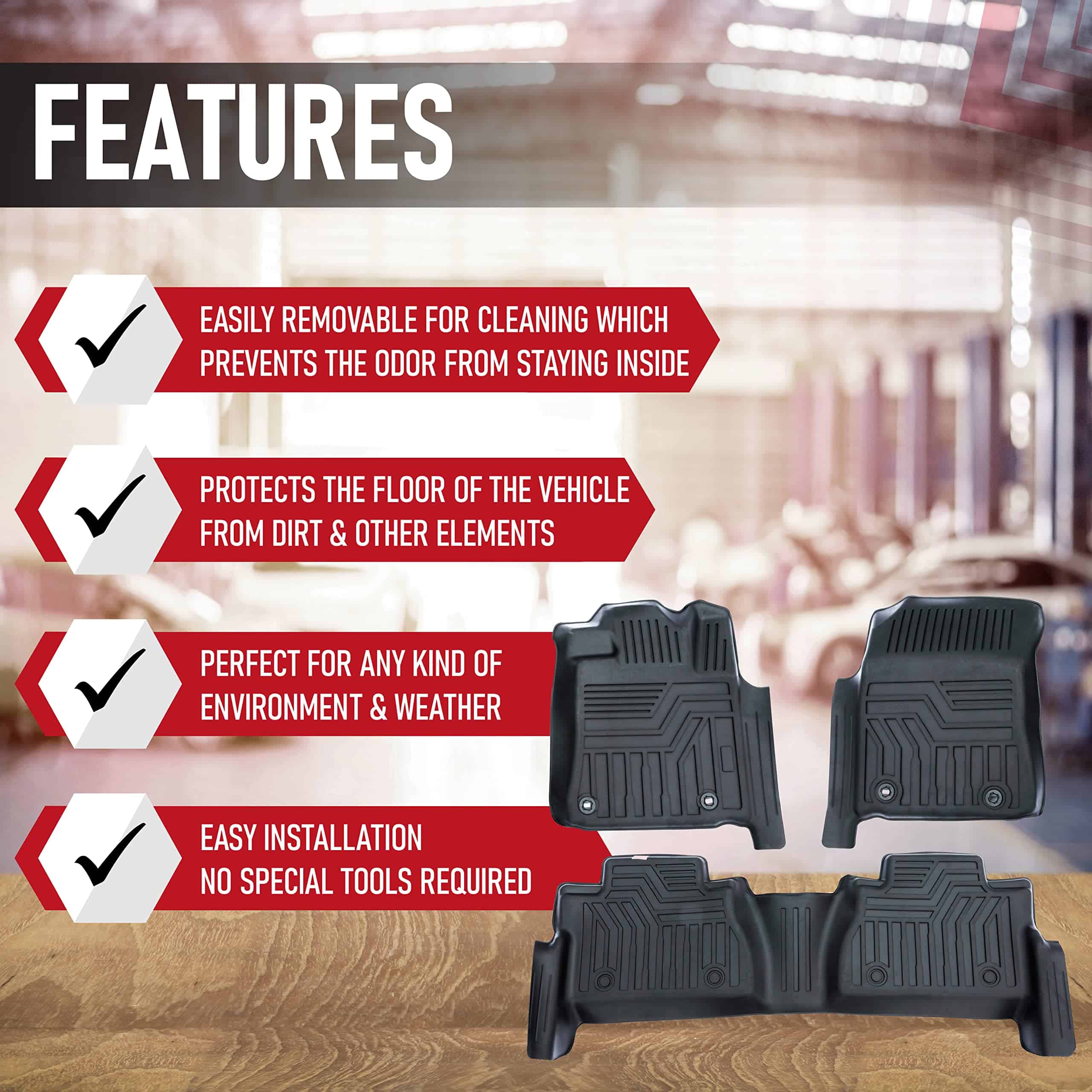 Las alfombrillas están diseñadas para proteger el piso del vehículo de suciedad, líquidos, barro y otros elementos que pueden desgastar el interior del auto. Las alfombrillas de auto son fácilmente removibles para limpiar, lo que también previene que los olores permanezcan dentro del vehículo. Construido con goma premium de alta calidad que puede resistir entornos sucios de alto nivel y temperaturas. Las alfombrillas también cuentan con un estilo de ajuste de plato profundo y hilos que contienen la suciedad y derrames hasta que estés listo para quitar las alfombrillas y lavarlas limpiarlas.