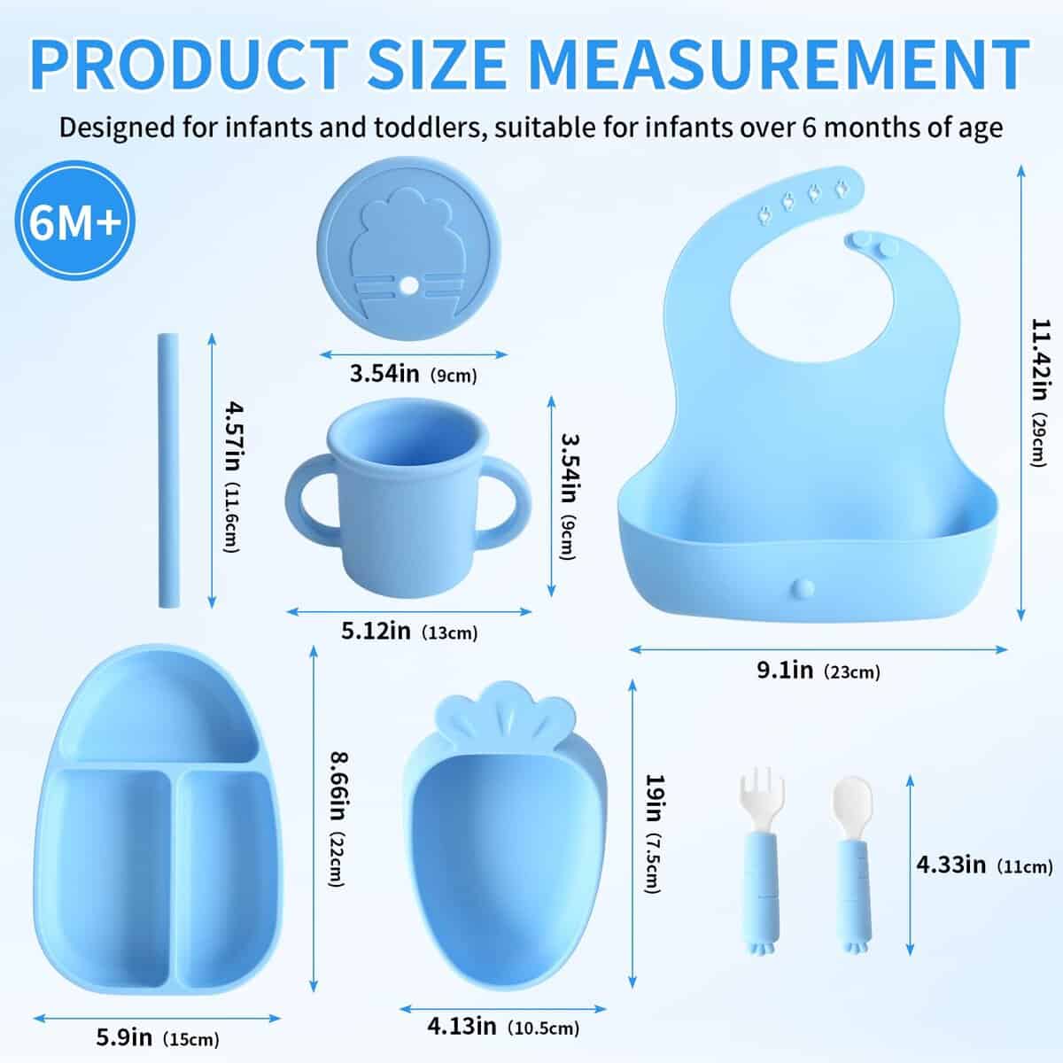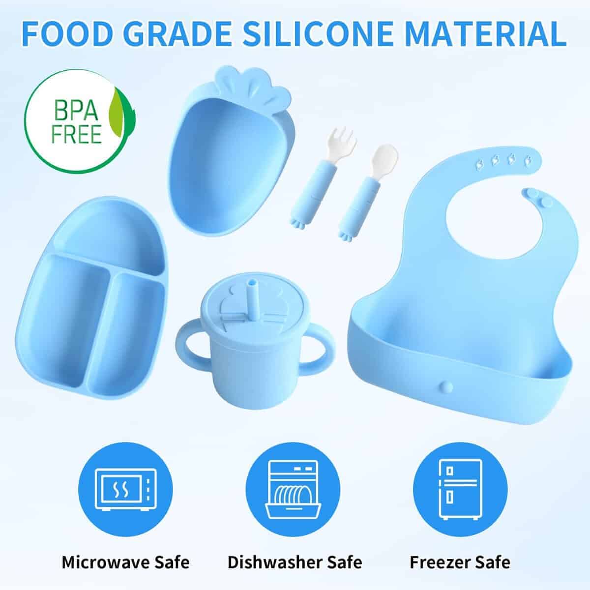1. Juego de silicona de grado alimenticio. Contiene 1 plato de succión, 1 tazón para bebé, 1 vaso con pitillo, 1 tapa de vaso, 1 babero ajustable, 1 juego de cuchara y tenedor. Silicona de grado alimenticio. Libre de BPA, PVC y ftalatos. Fácil de limpiar y apto para lavavajillas. Perfecto para las primeras etapas del destete dirigido por el bebé, ayudando a que tu bebé haga la transición a la alimentación propia de una manera mejor, más limpia y más segura.