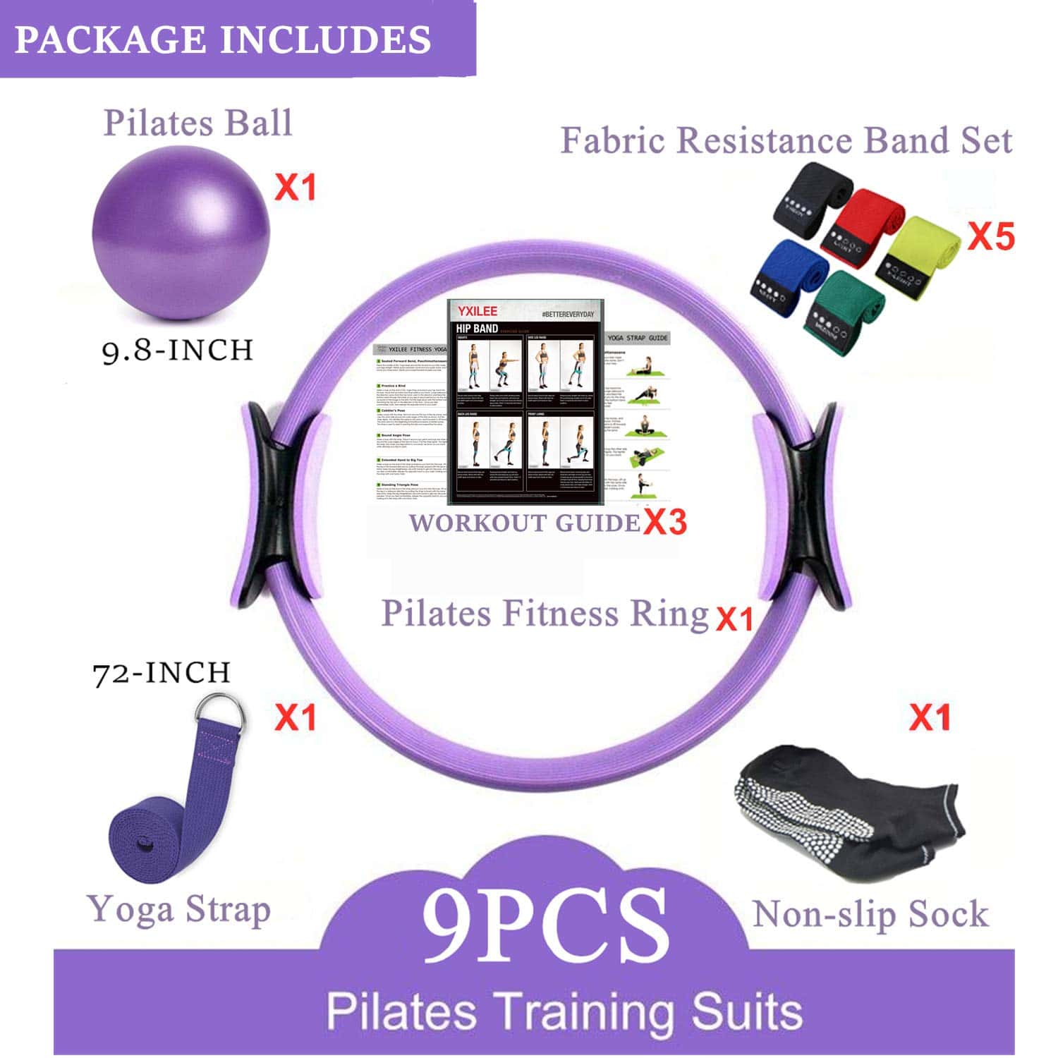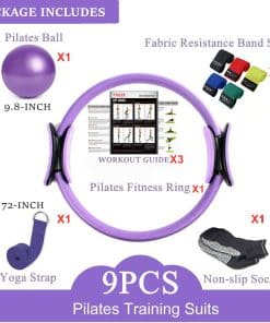1. Paquete de 9 PZAS que incluye: 1 Anillo de Pilates de 12 pulgadas / 1 Pelota de Pilates de 9.8 pulgadas / 1 Correa de Yoga de 72 pulgadas / 1 Calcetines de Pilates / 5 Juego de Bandas de Resistencia de Tela de 13 pulgadas / 3 Guía de Ejercicios Nuestros trajes de Pilates son combinaciones de productos cuidadosamente seleccionadas, muy adecuados para principiantes y personas mayores. Incluye instrucciones de ejercicio simples y claras en papel y Multilibro PDF gratuito para que comiences. Nuestro conjunto de ejercicios no solo tiene mejor calidad sino también es fácil de usar.