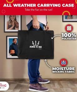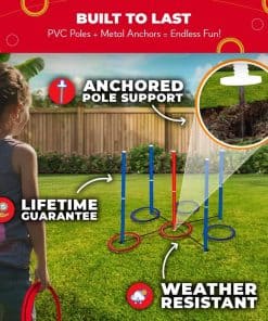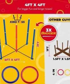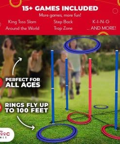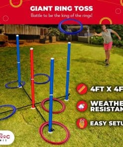 ¡Lleva la diversión al aire libre al siguiente nivel con el juego de anillos gigante SWOOC Games – King Toss! Este juego de anillos gigante ofrece batallas épicas en el patio trasero para niños y adultos por igual. Con un tamaño 3 veces más grande que los competidores (4 pies x 4 pies), este juego garantiza horas de diversión bajo el sol. Diseñado para resistir las salpicaduras, la humedad y el sol, este juego es resistente a la intemperie y está listo para soportar miles de rondas de King Toss. Los anillos aerodinámicos de 13 pulgadas vuelan hasta 100 pies, desafiando a los jugadores de todas las edades a demostrar sus habilidades de tiro. La configuración rápida permite que el juego comience en segundos, con postes que se clavan fácilmente en el suelo. Con una bolsa de transporte resistente a la intemperie, la diversión se puede llevar a donde vayas. Con más de 15 juegos incluidos, como el clásico King Toss, King Toss Slam, Golf, K-I-N-G y más, nunca te aburrirás con este juego versátil y emocionante. ¡Haz que tus reuniones familiares y de amigos sean inolvidables con el juego de anillos gigante SWOOC Games – King Toss!