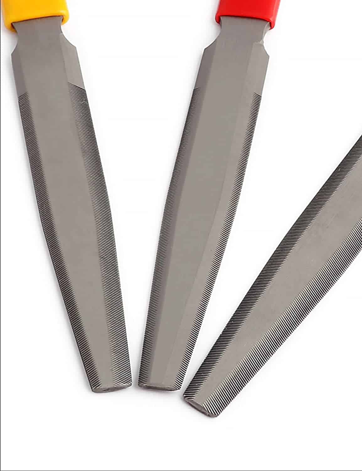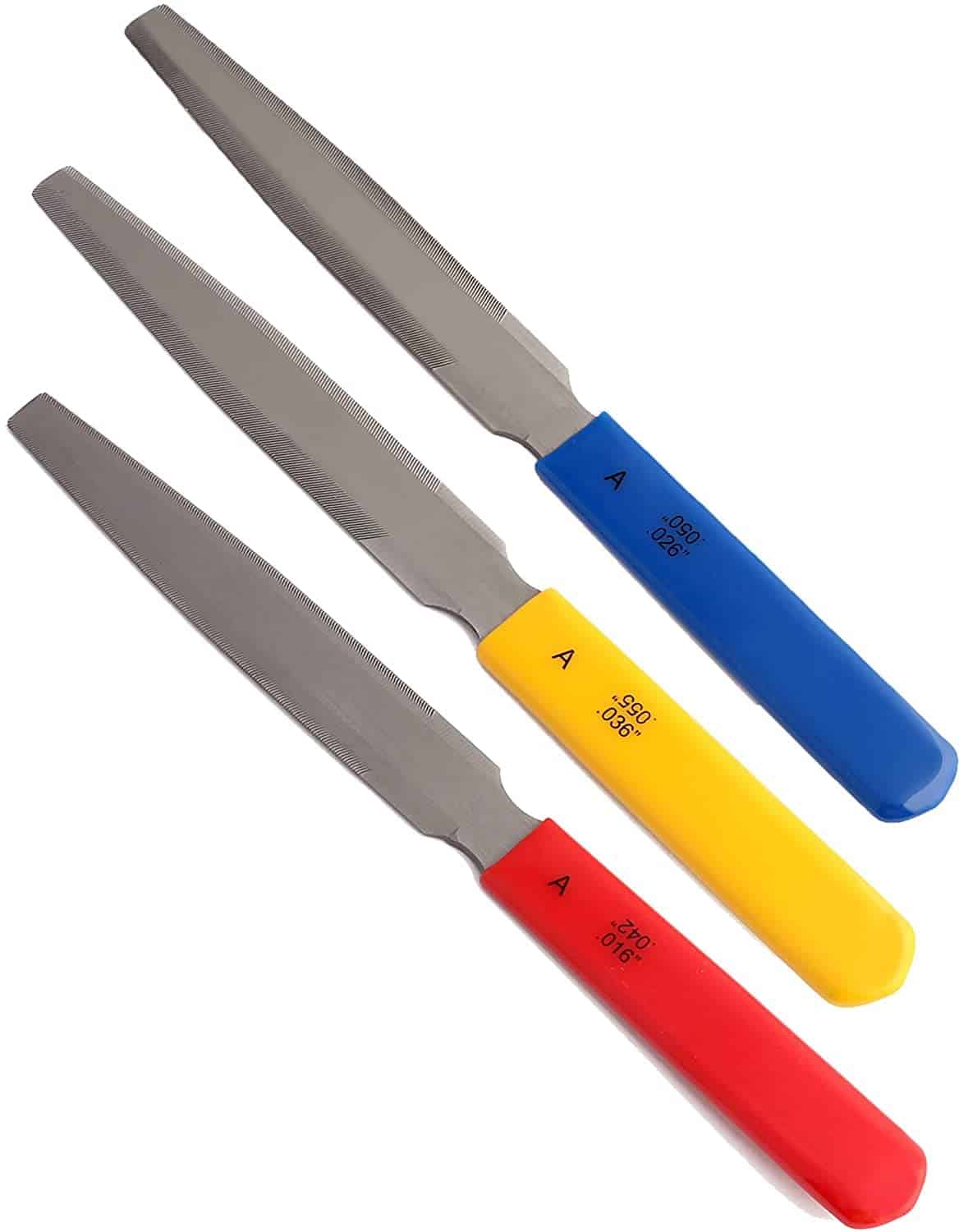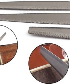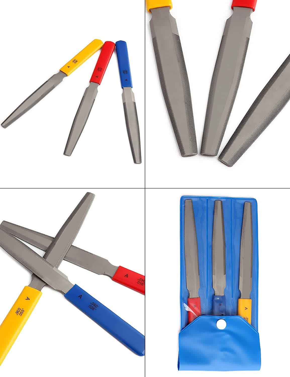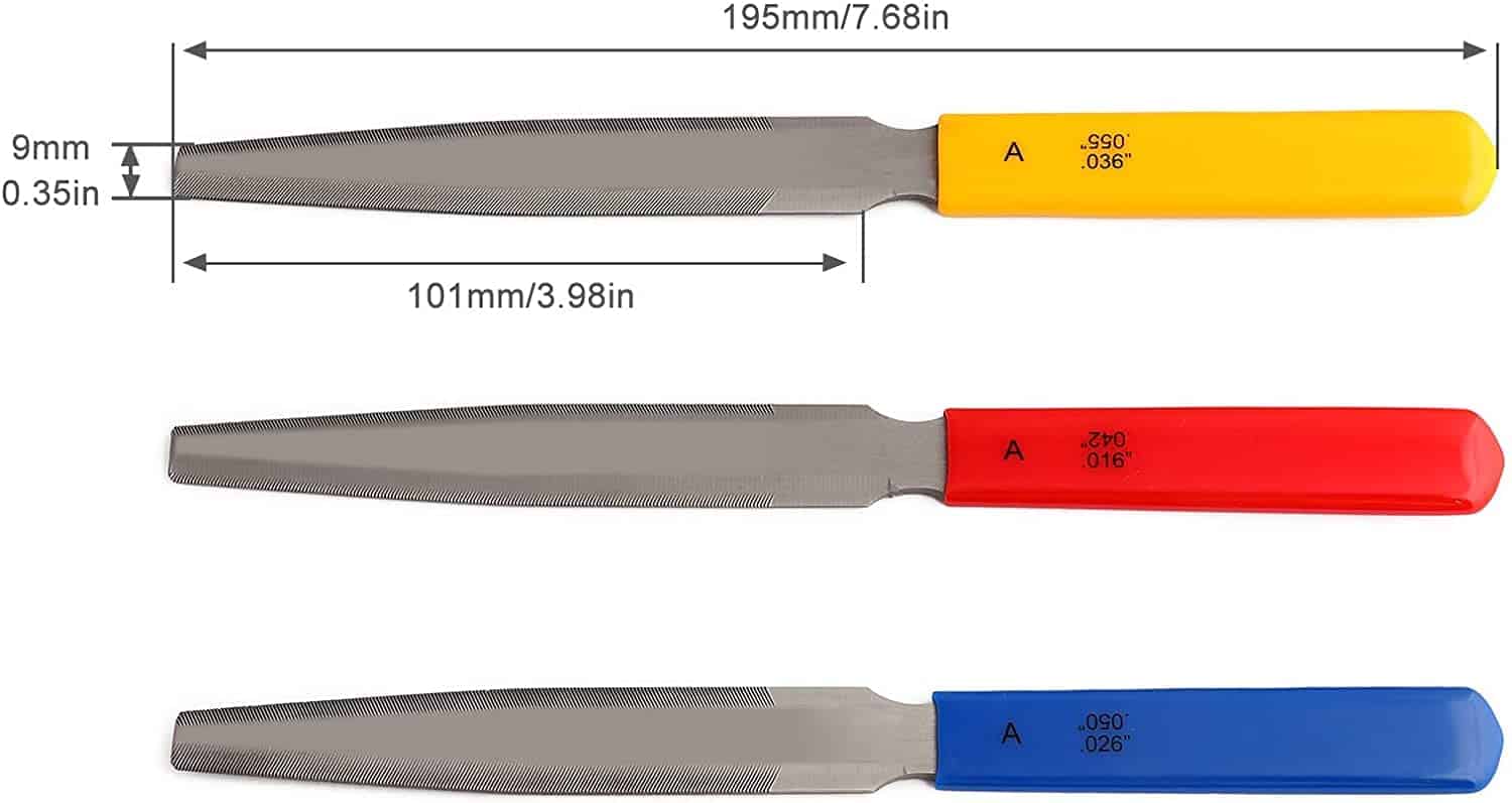 Excelente juego de archivos en forma de V para la ranura de tuerca para guitarras eléctricas, acústicas o bajos. 3 archivos de corte de borde cónico de doble borde para cortar ranuras de cuerda en la tuerca. Esto es imprescindible para tiendas que construyen, reparan o cambian la tuerca. Se proporciona una bolsa de PVC para mantener los bordes de los archivos sin dañarse entre sí. Cada juego contiene 3 archivos de tuerca de doble lado en su interior. Juego de 3 piezas para Guitarras Eléctricas: 3 archivos de tuerca de doble lado .010″/.013″/.017″/.026″/.036″/.046″, Juego de 3 piezas para Guitarras Acústicas: 3 archivos de tuerca de doble lado .016″/.026″/.036″/.042″/.050″/.055 , Juego de 3 piezas para Guitarras Bajo: 3 archivos de tuerca de doble lado .045″/.065″/.075″/.085″/.105″/.130 . Le proporcionaremos el mejor servicio de calidad, si tiene alguna pregunta, puede contactarnos en cualquier momento, la resolveremos lo antes posible, para que pueda comprar con confianza y felicidad.