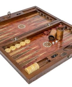 Juego de backgammon de lujo con exquisitos detalles de mosaico y tallado hecho a mano en palisandro. El set incluye un tablero plegable de alta calidad, fichas de juego, dados y una bolsa de cuero para transportar. Ideal para disfrutar de horas de diversión y estrategia con amigos y familiares.