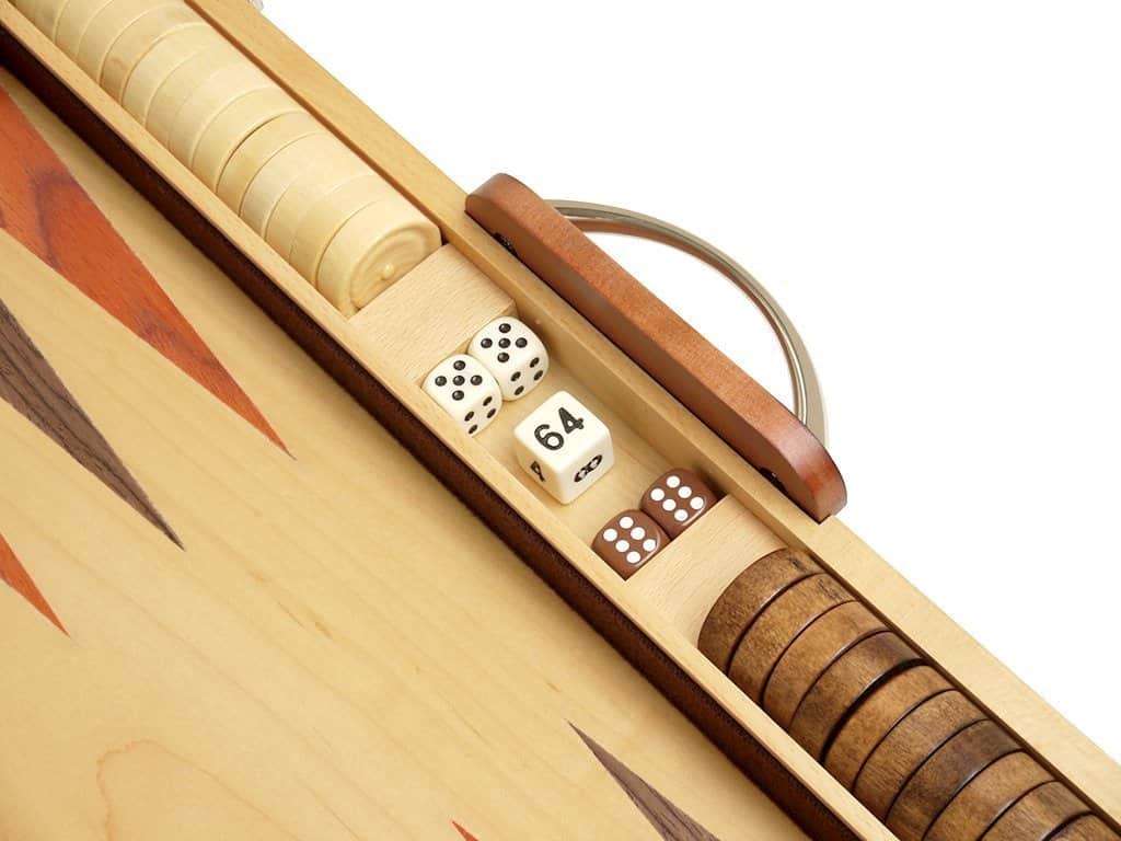 Cada set viene con 30 damas de madera estriadas que son extra gruesas con 3/8″ (10mm), lo que hace que el almacenamiento en los bolsillos laterales sea ordenado y preciso. El set también incluye 2 cubiletes de dados de madera de haya con forro de fieltro para tiradas silenciosas, un hermoso asa niquelada y cierres niquelados cepillados.